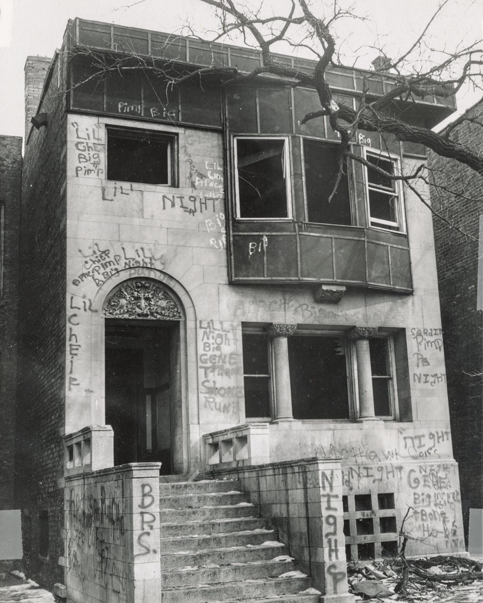 the house was meticulously deconstructed in 1970 with the intention of rebuilding elsewhere. carefully labeled sections of the bedford limestone facade (e.g., lunette, columns and capitals, and stoop) were salvaged by richard nickel and his brother donald under grueling conditions.