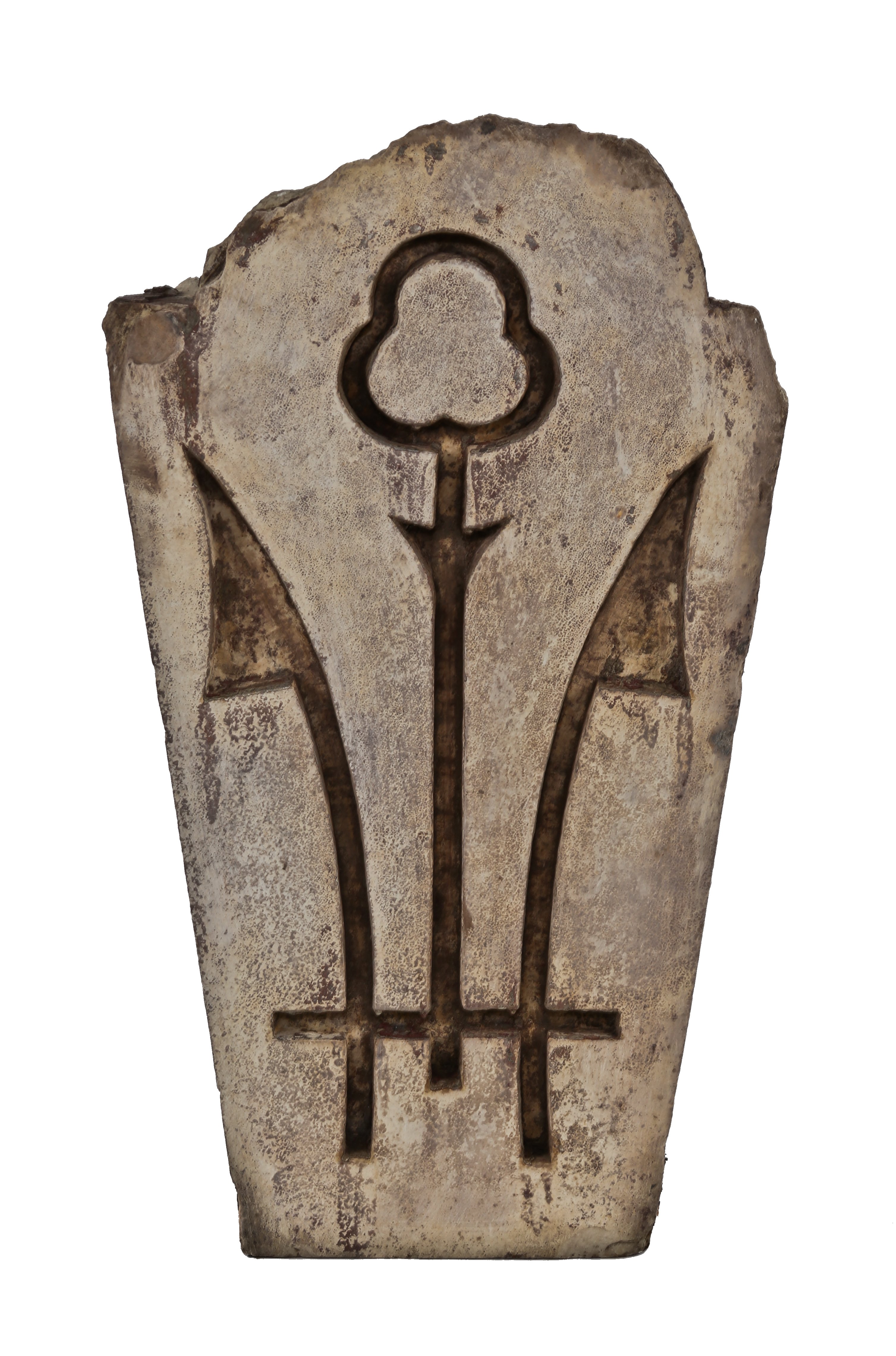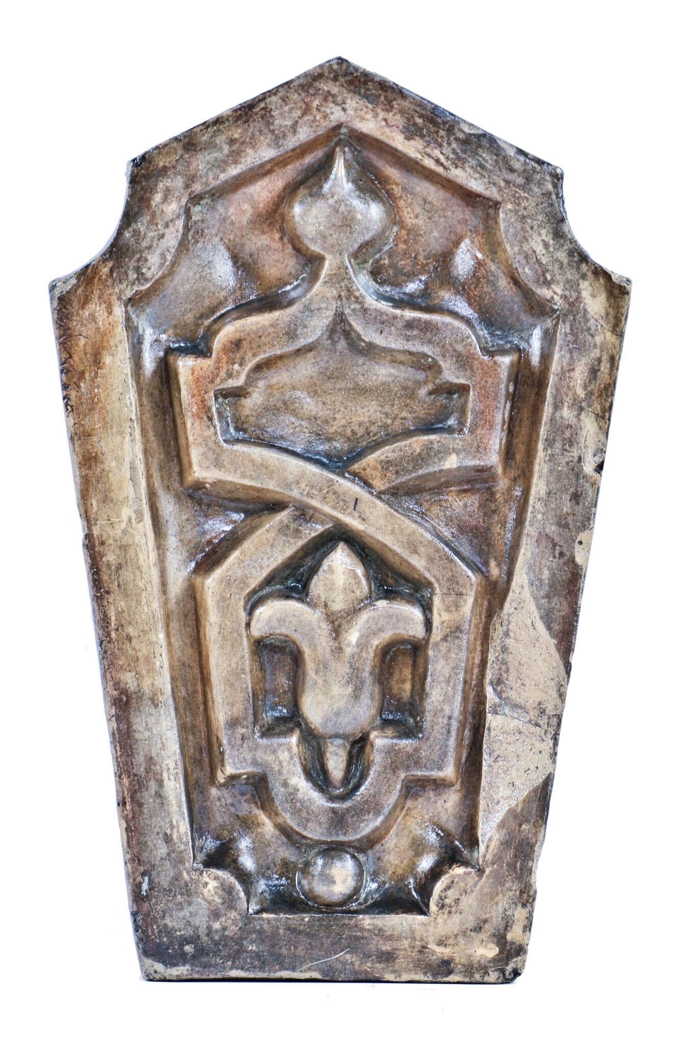 exceptional example of an early buff-colored terra cotta keystone fabricated shortly after the great chicago fire by the chicago terra cotta company, chicago, ills. the ornamental exterior chicago commercial building keystone contains a nicely aged patina in the form of discoloration from prolonged exposure to the elements. the rear cavities have been cleaned from loose brick and mortar. the post-fire chicago building window hood keystone features a simple abstract floral motif. the fired terra cotta keystone was likely fabricated between 1872-1873.