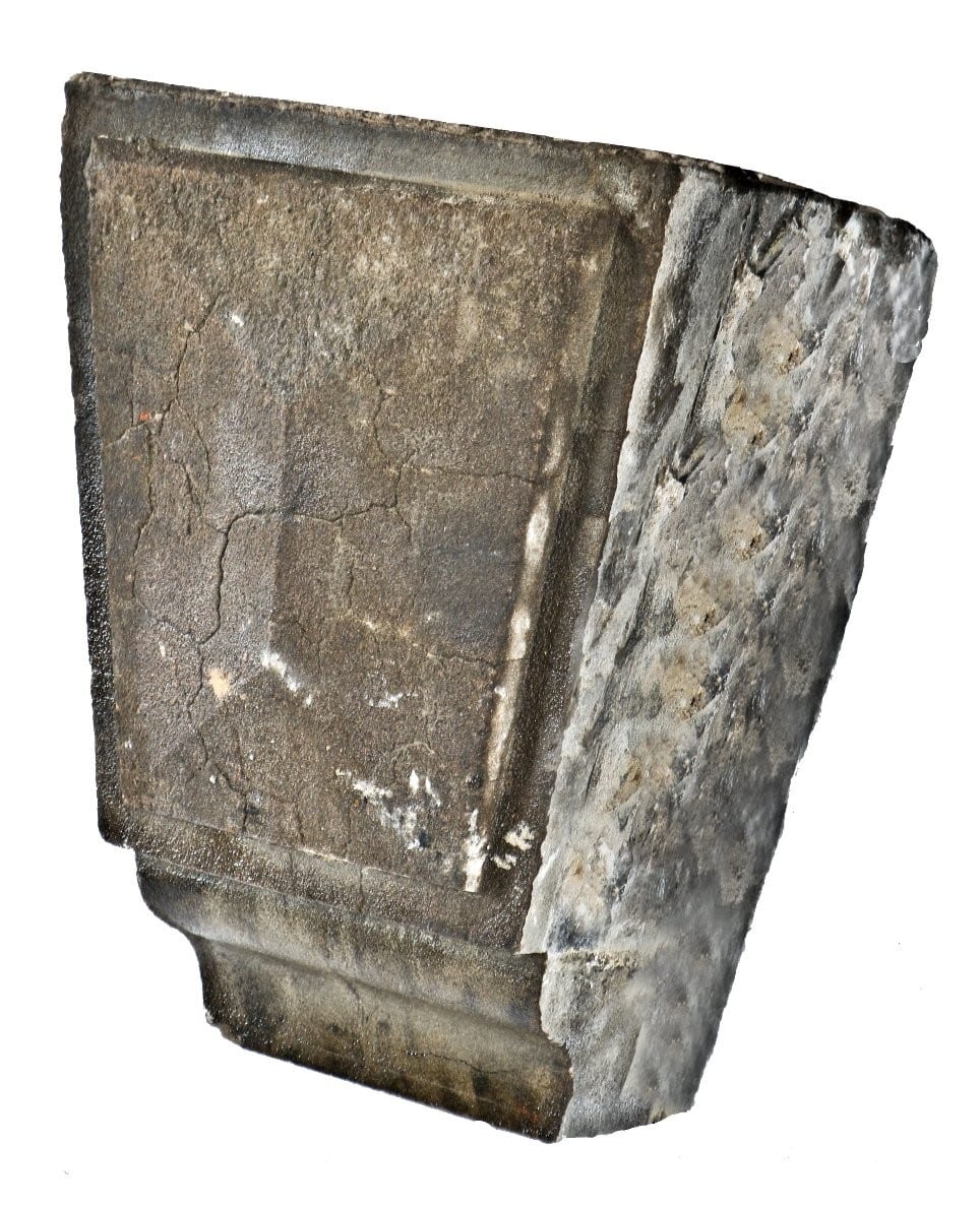 all original and largely intact early 1870’s artificial stone fragment or oversized keystone element salvaged from the post-fire osborne & adams commercial loft building on lake street. the light grey wedge of cast stone features simple design elements and a relatively smooth surface. the stone was formulated and patented by aaron frear in chicago on march 29, 1870, and is comprised of an aqueous saccharine solution of litharge, particles of silex, alumina, calcium and minerals, and metallic oxides.