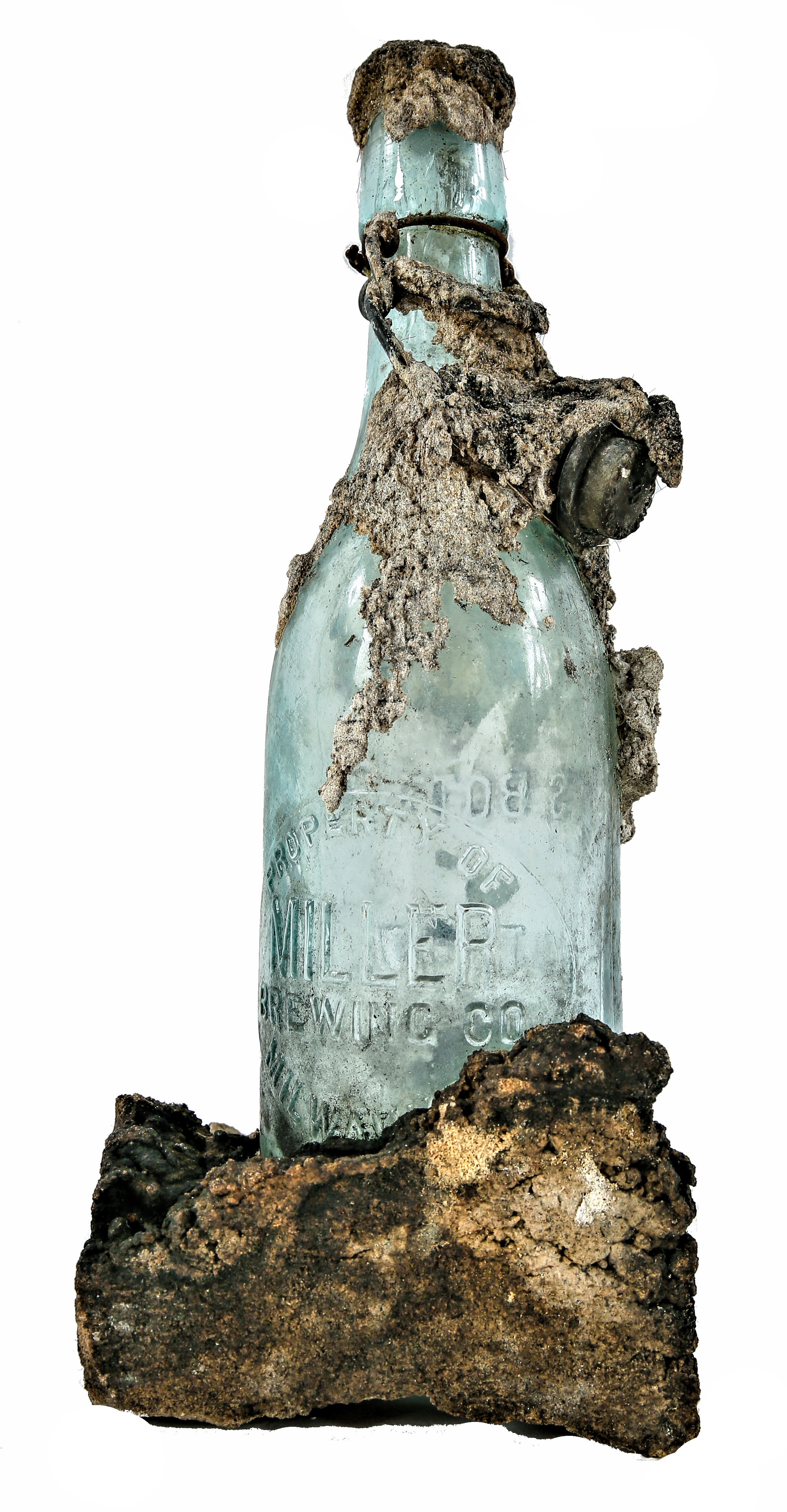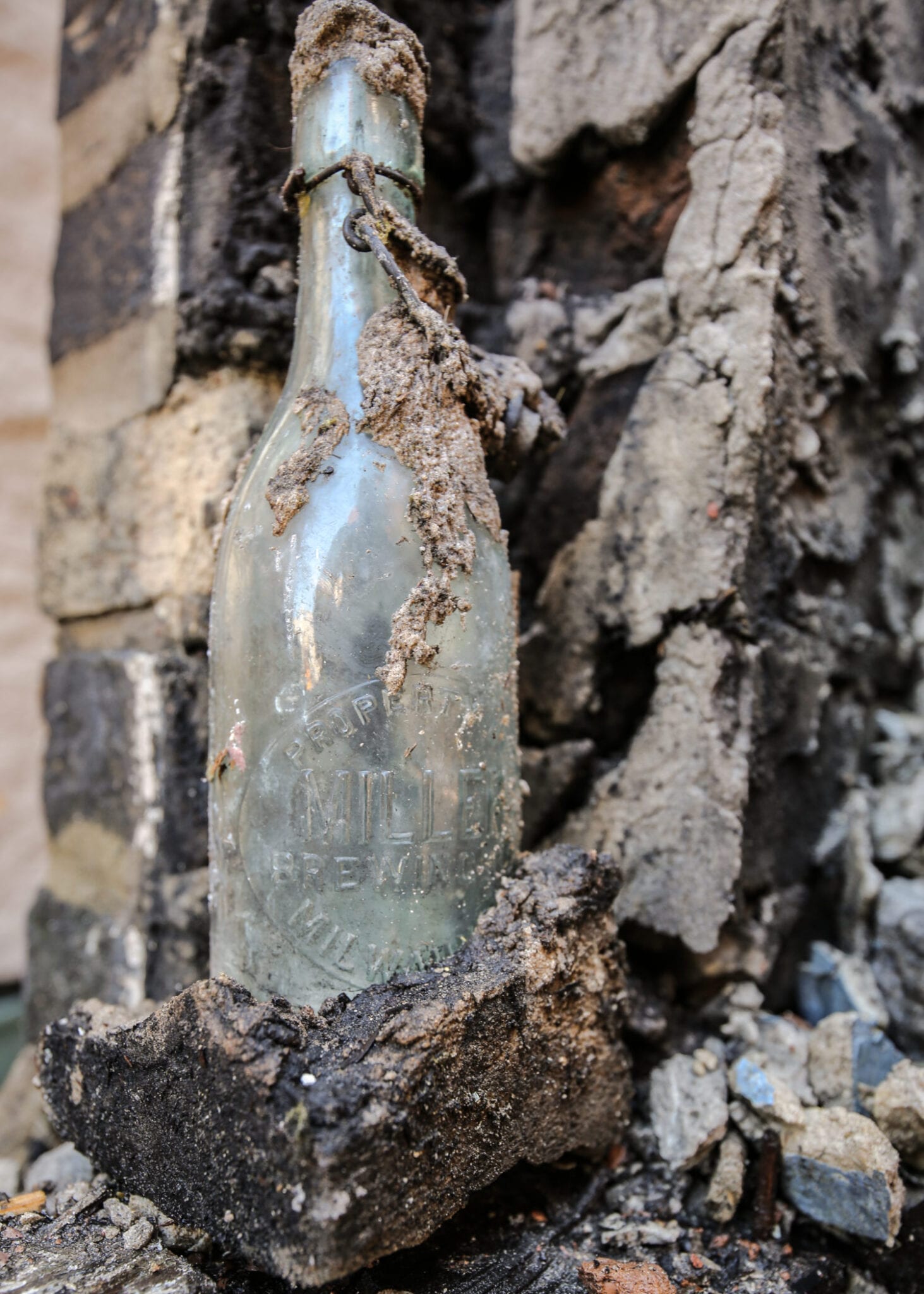 the bottle found towards the end of the demolition, when a single wall was left standing, dates to 1888-1892 (based on preliminary research of the miller brewing company and the bottles they distributed dating back to the 1850’s, when it was first established in milwaukee, wisc.), which coincides nicely with the build date of the brick two-flat. the beer bottle was deliberately left by a tradesmen – a plasterer in this case. the beer bottle remains amazingly intact, with original stopper, comprised of a metal bail and lever wire. the light green or aqua-colored glass is free from damage.