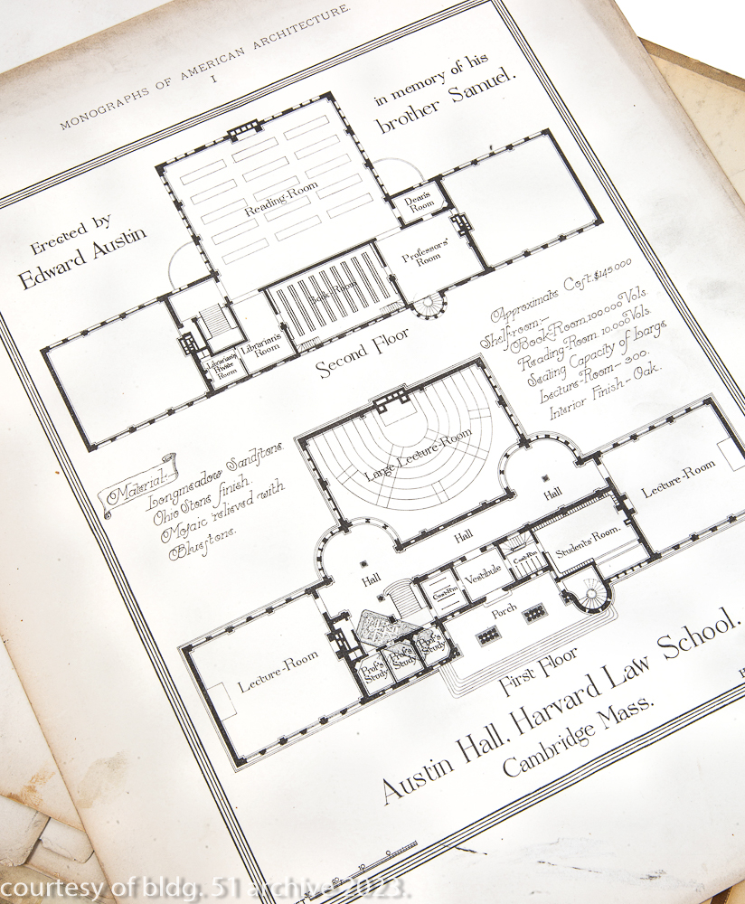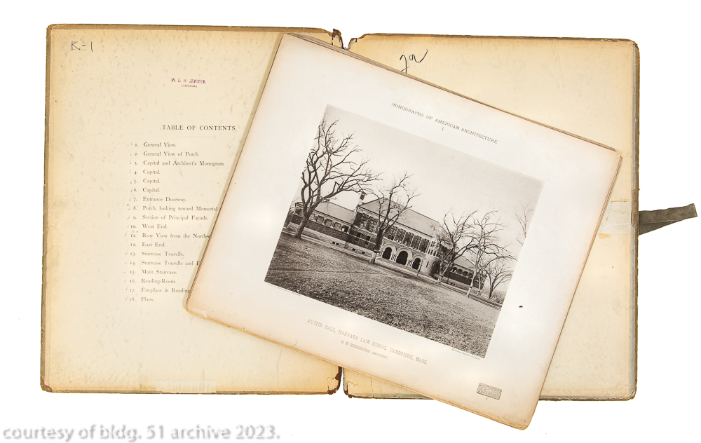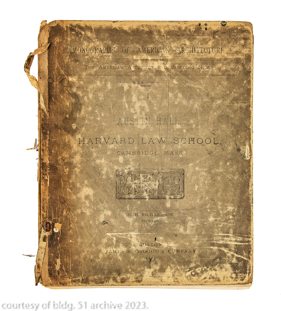 original monograph of h.h. richardson’s austin hall, harvard law school, cambridge, mass., from the architectural library of william le baron jenney. contains 18 bw heliotype plates of the law school’s interior and exterior. published by boston-based james r. osgood and company, 1885.