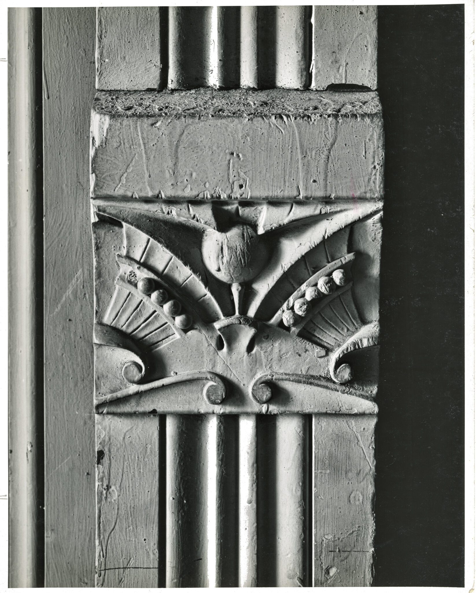 the house’s interior ornament – all designed by john edelmann during the 1880 remodel – was documented and salvaged by richard nickel, david norris, and john vinci. other examples can be found in private collections in and around chicago. the carved mahogany wood block, molding and plinth assemblage was stripped and refinished long ago.