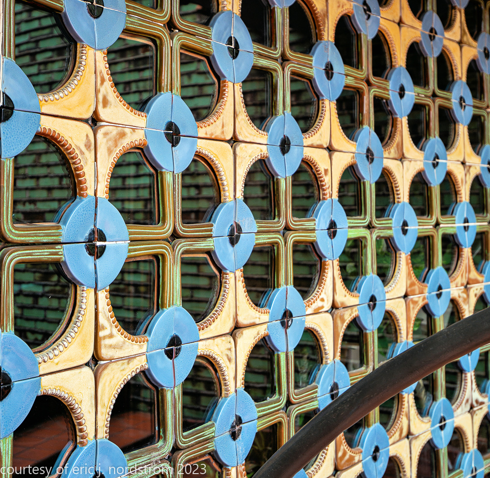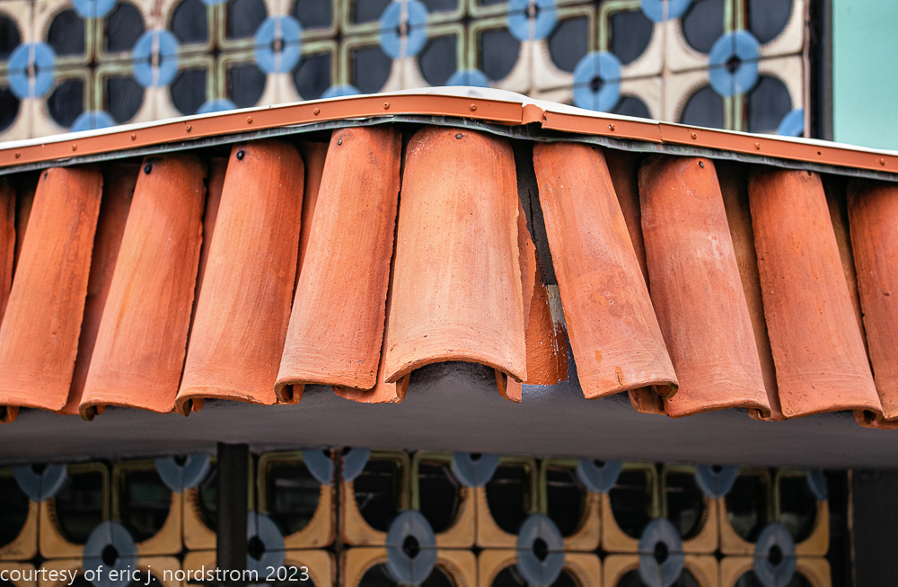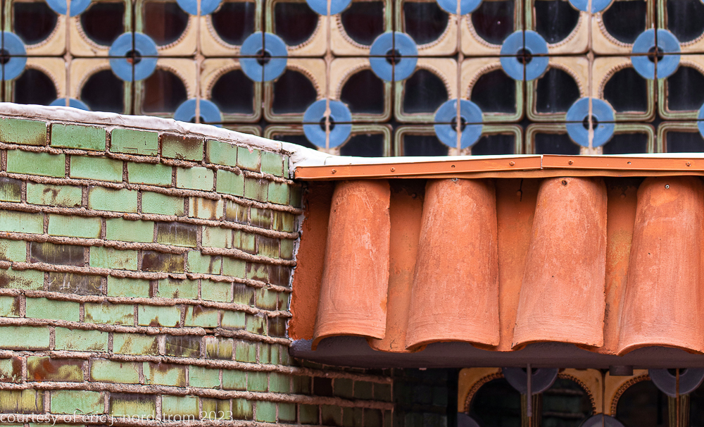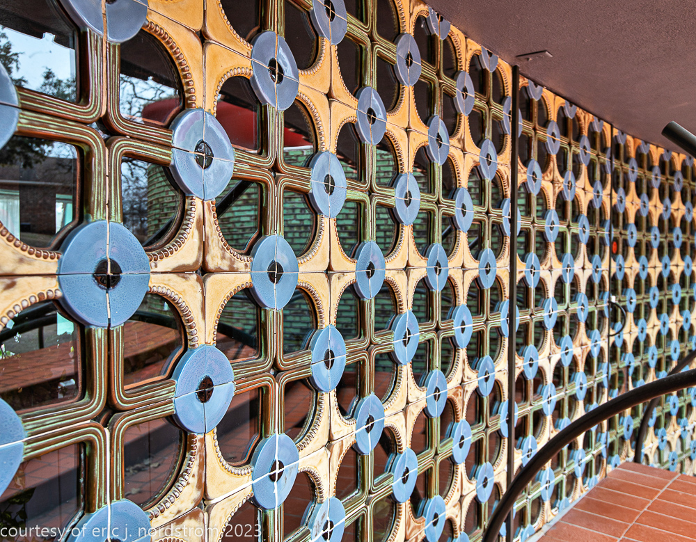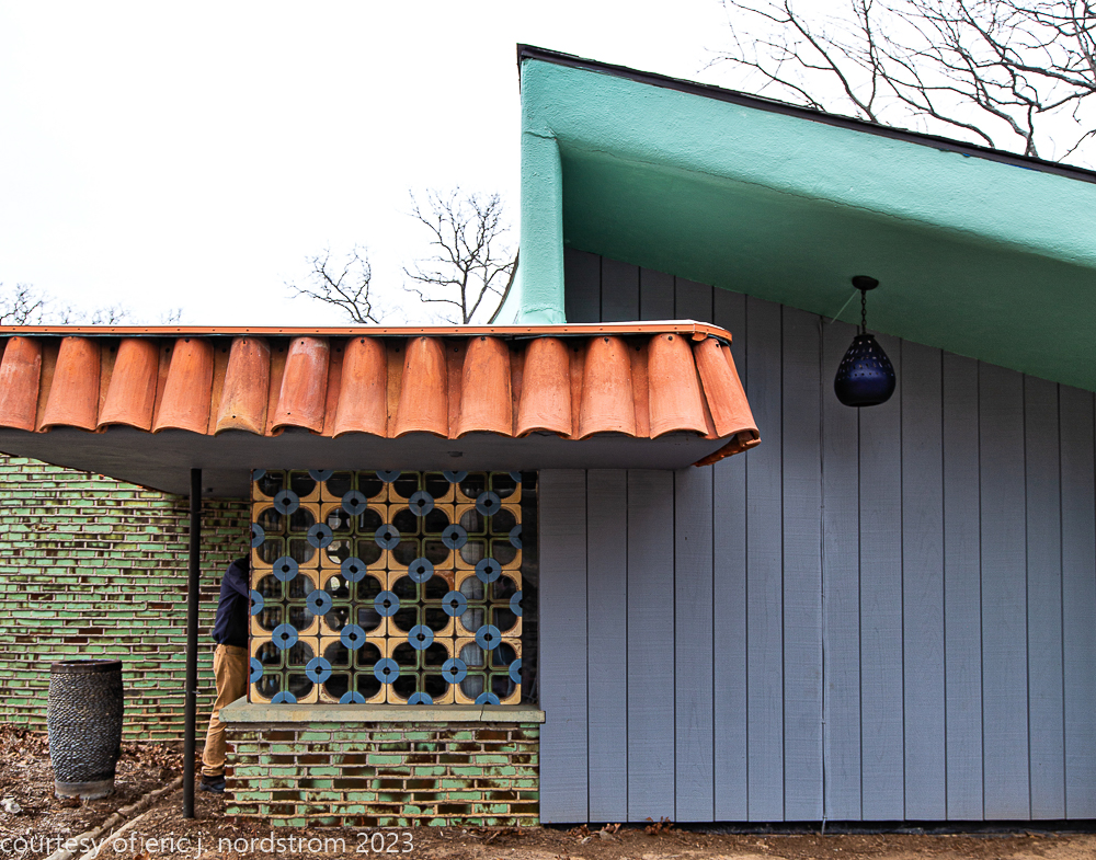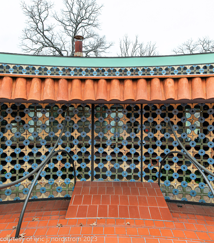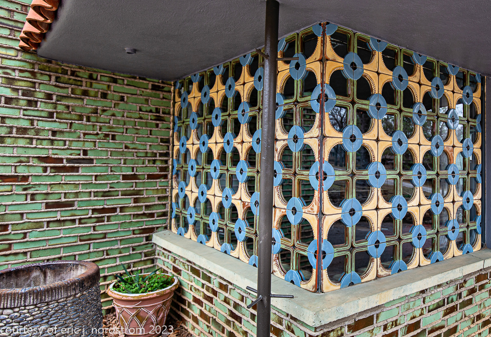 the house is a one-story building made of glazed brick and tile, stucco, terra cotta roofing tile, and glass that can be opened up to be one room by either sliding or folding the walls. they tend to keep them the way they are which is separating the rooms up because they have many pictures on the walls. there is no way to re-create the house today because of the details that were done, john and grace colored many pieces several times until they decided the color they made was right for the house.  grace hand glazed the tile with many coats of color that john frank designed. all the brick that is throughout the house was colored from frankomas colors and glazes that john and grace did together.