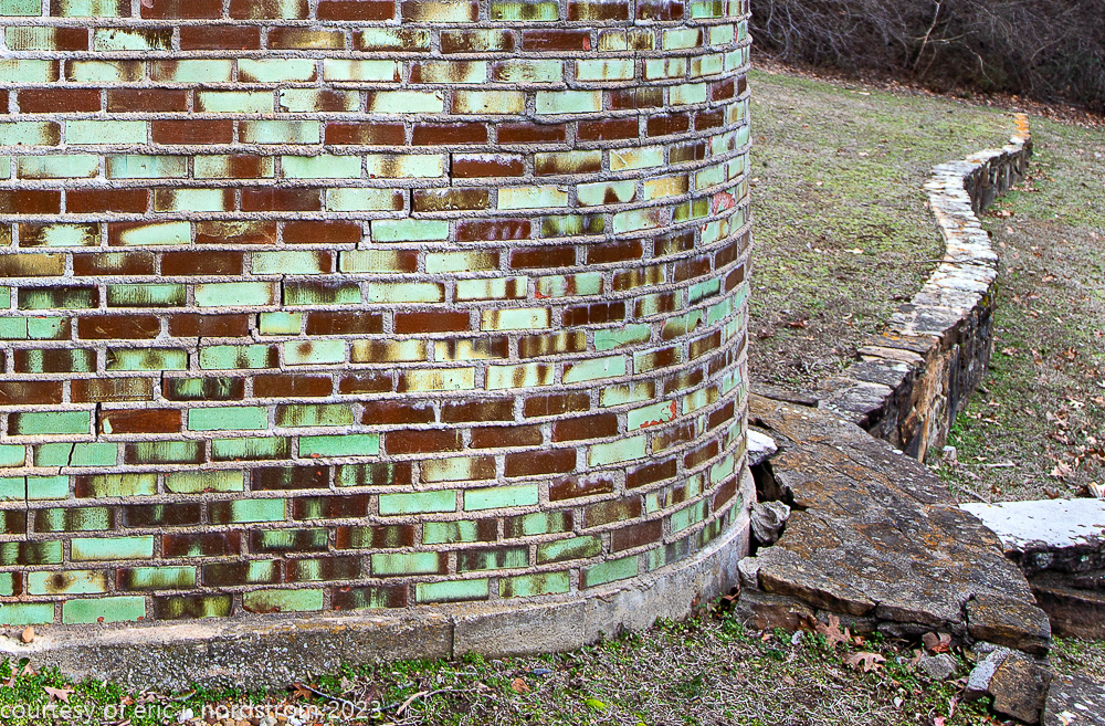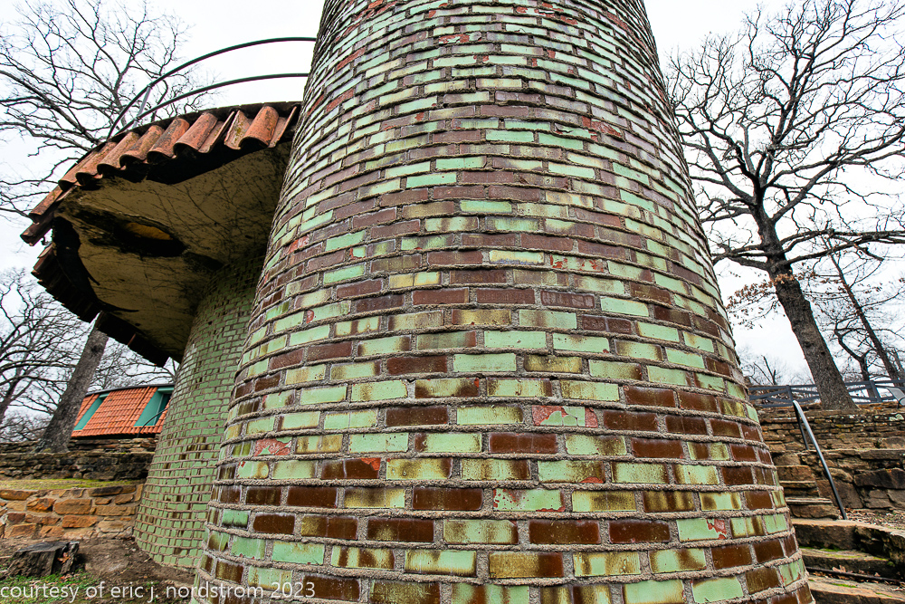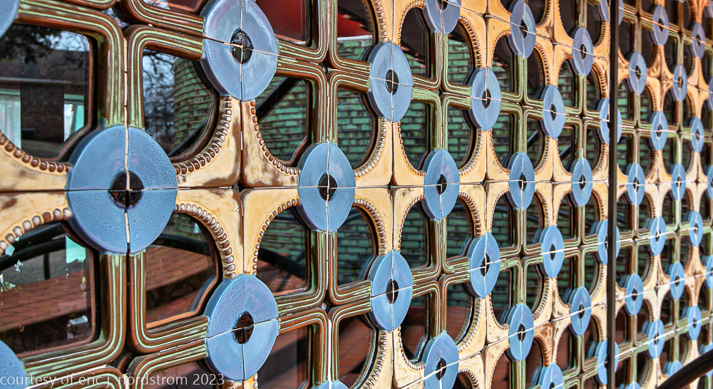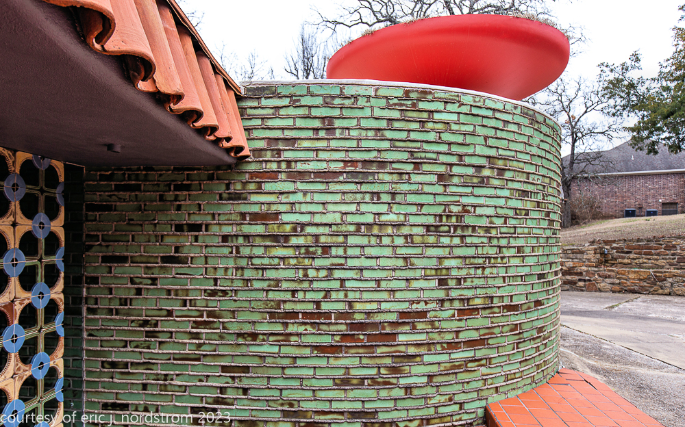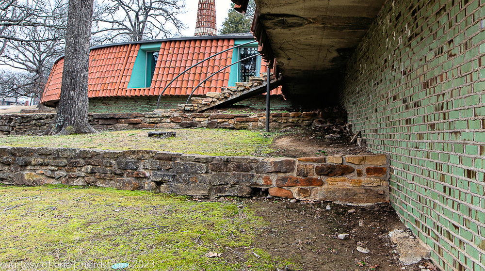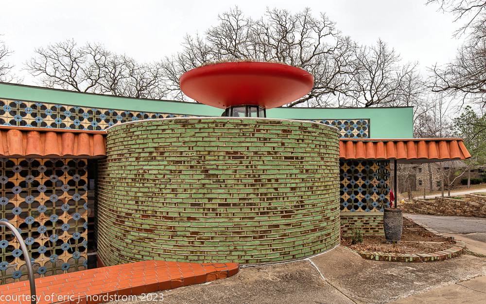 john frank designed and created the fireplace that is in the house. it is the focal point of the interior, which it is a circular fireplace and the sunken conversation pit surrounding it.  john and grace loved the pottery that they made so they wanted it to be incorporated into the house that was being built for them. many of the house details such as the bricks or colors, came from frankoma pottery where then they used to make it more unique and what they wanted.