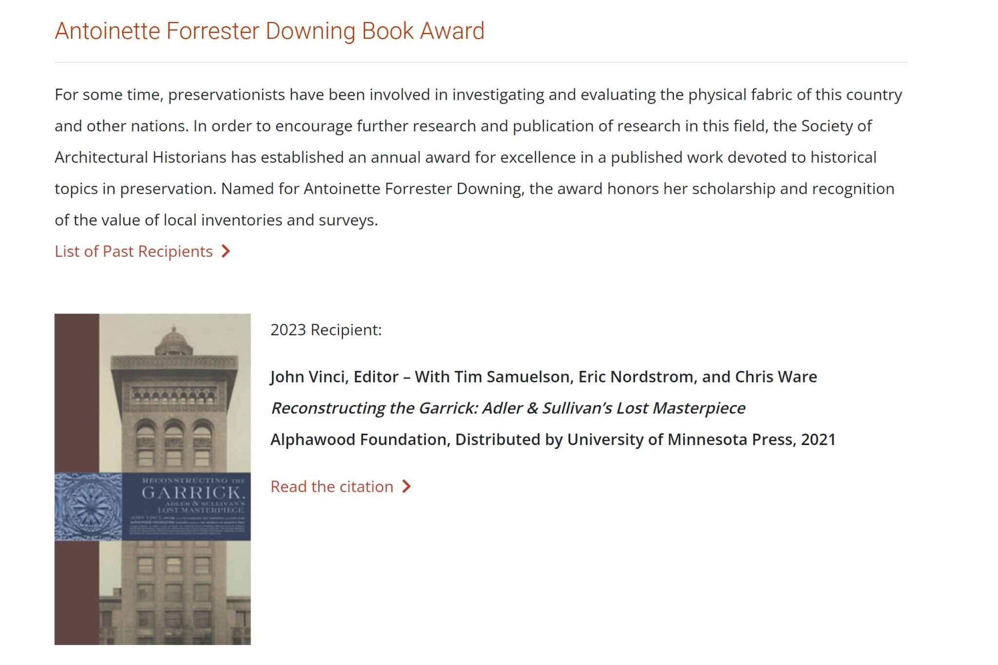 18 Apr RECONSTRUCTING THE GARRICK: ADLER & SULLIVAN’S LOST MASTERPIECE, WINS SAH’S 2023 Antoinette Forrester Downing Book Award