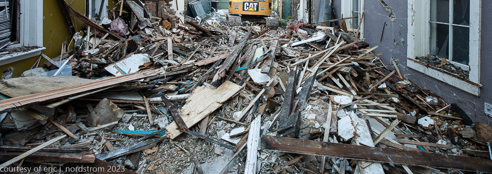 after documenting the brick cottage before, during, and after its disappearance from the cityscape ever since it landed on the demolition delay list some months ago, i managed to salvage the four unornamented lemont limestone window and door keystones buried in the rubble.