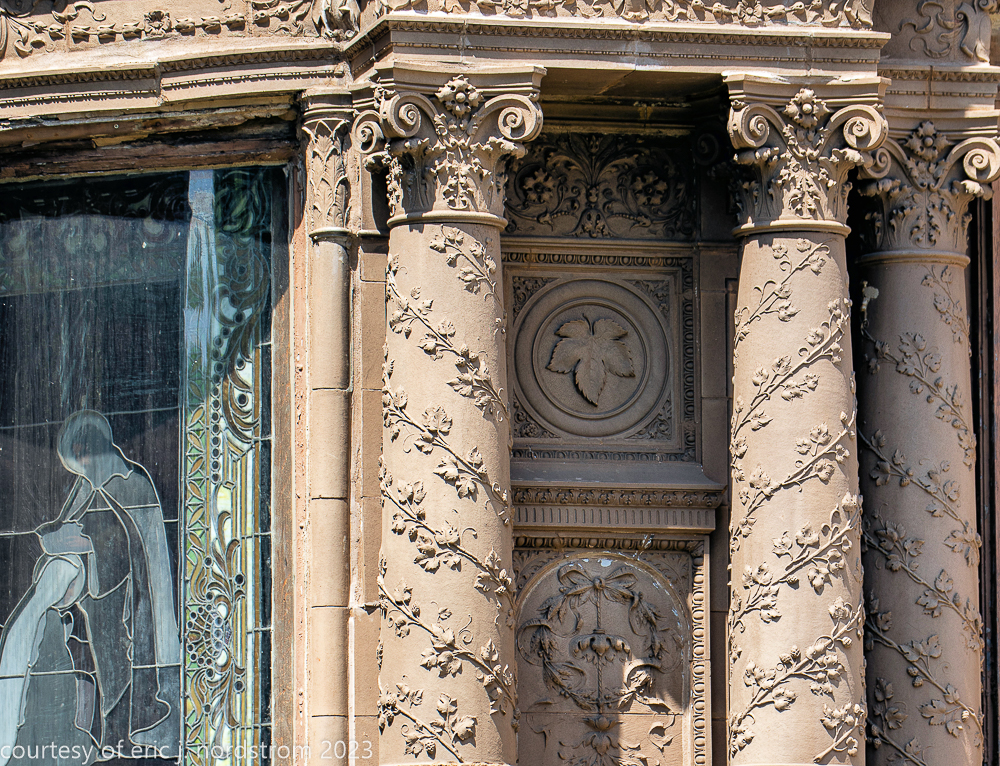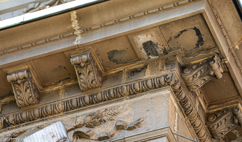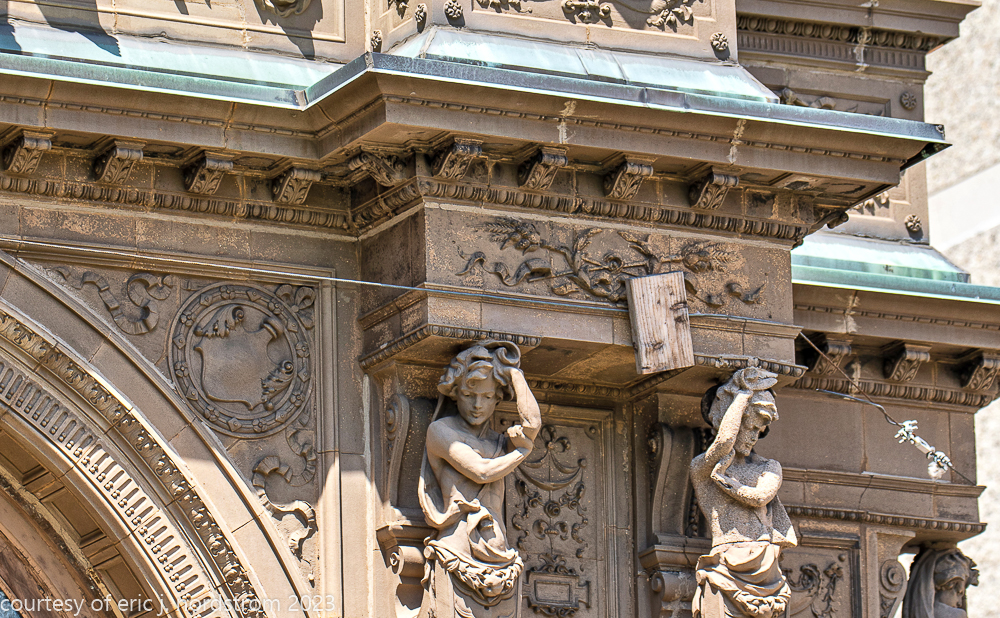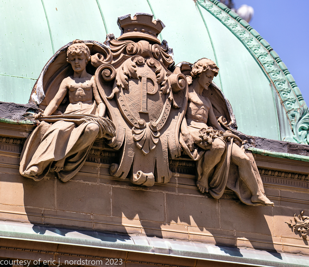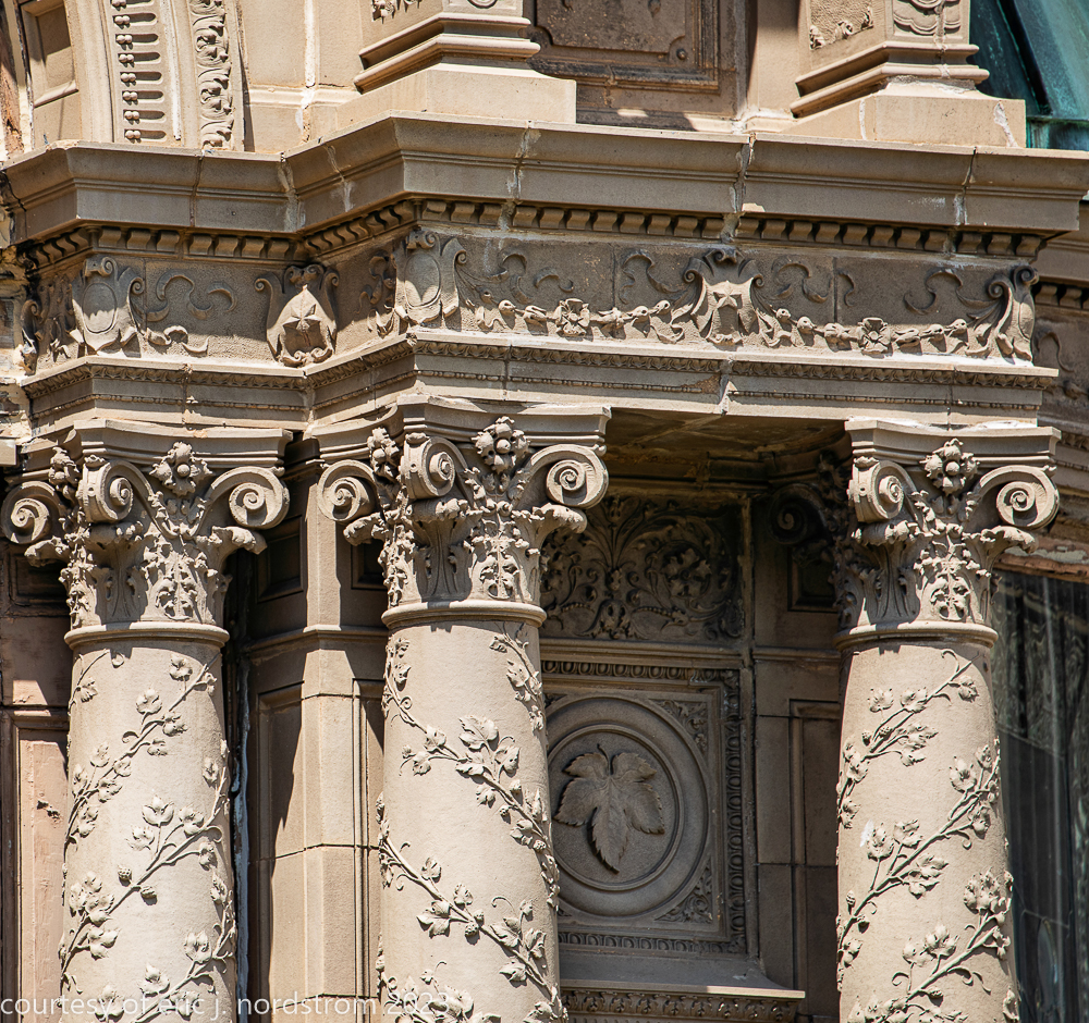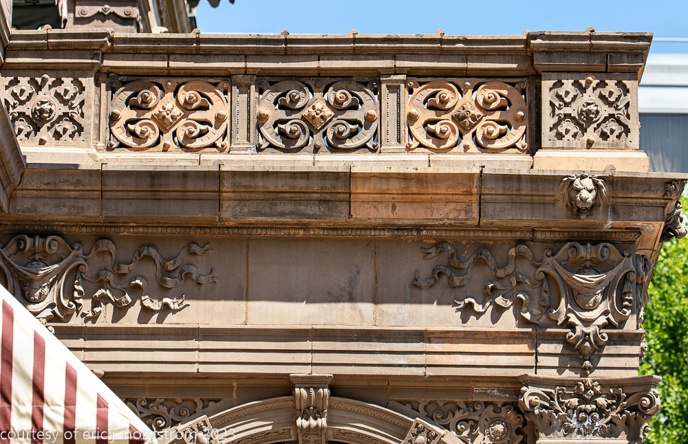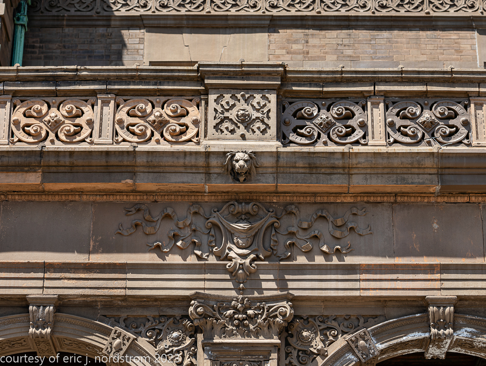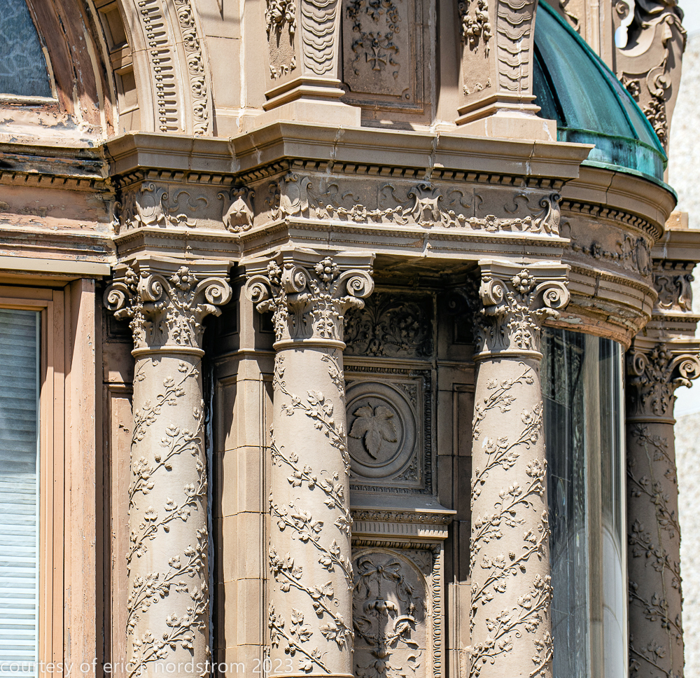 the exterior buff-colored ornamental terra cotta ornament on the flemish renaissance revival-styled frederick mansion (george ferry, architect, 1892) is in need of serious repair (see images below). restoration of the adjoining 1893 world’s fair pabst beer pavilion (designed by architect otto strack, who also designed the extant pabst theater), is underway, with the boston terra cotta company replicating and replacing the structure’s original terra cotta that was executed by the northwestern terra cotta company, chicago, ills. further information will be provided when time permits.