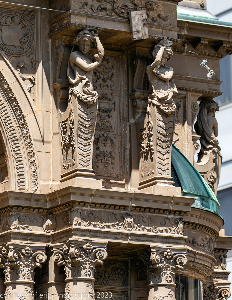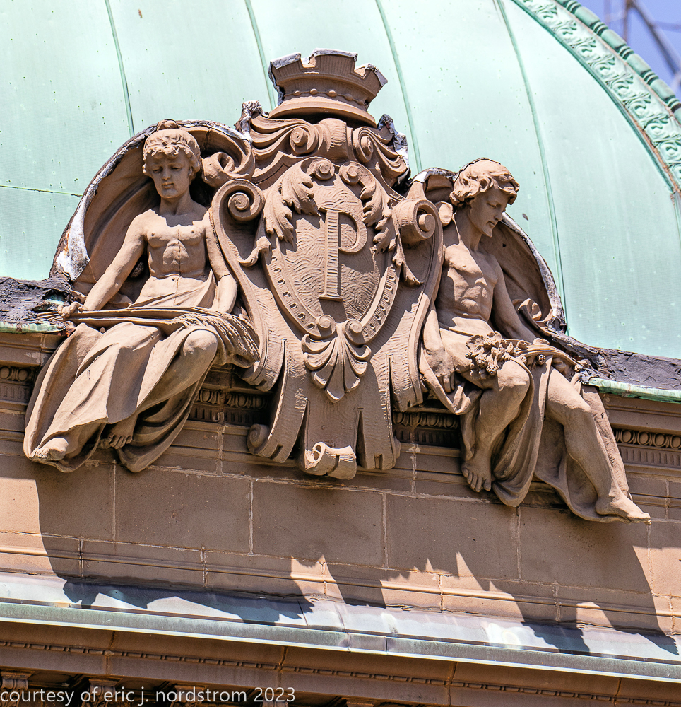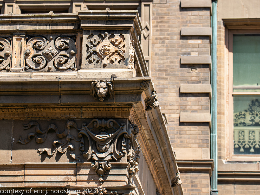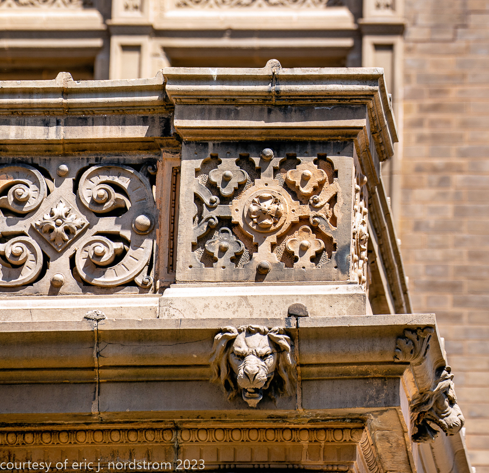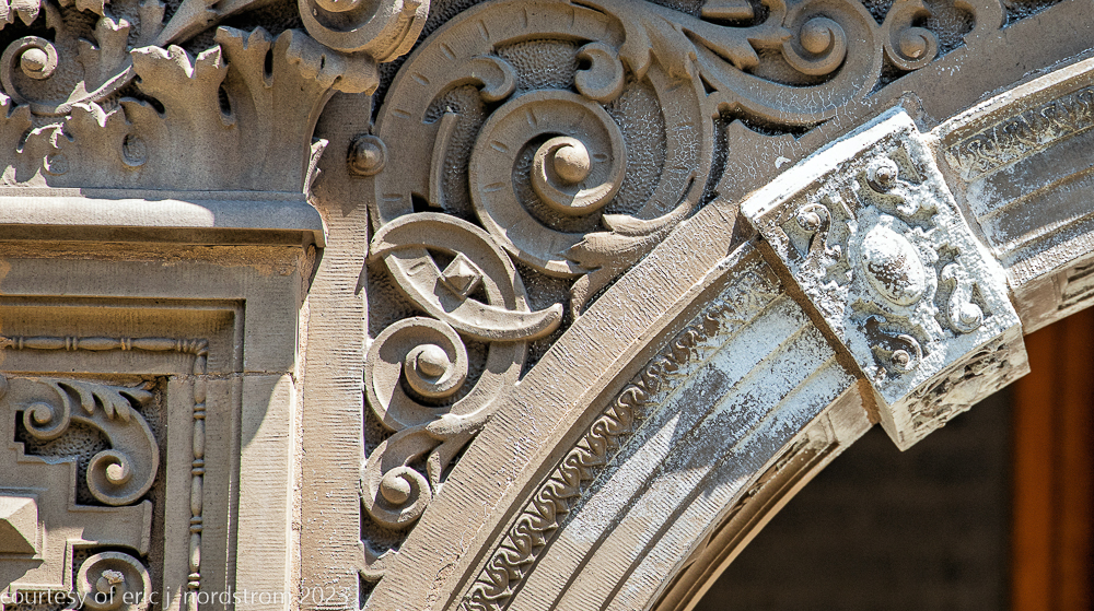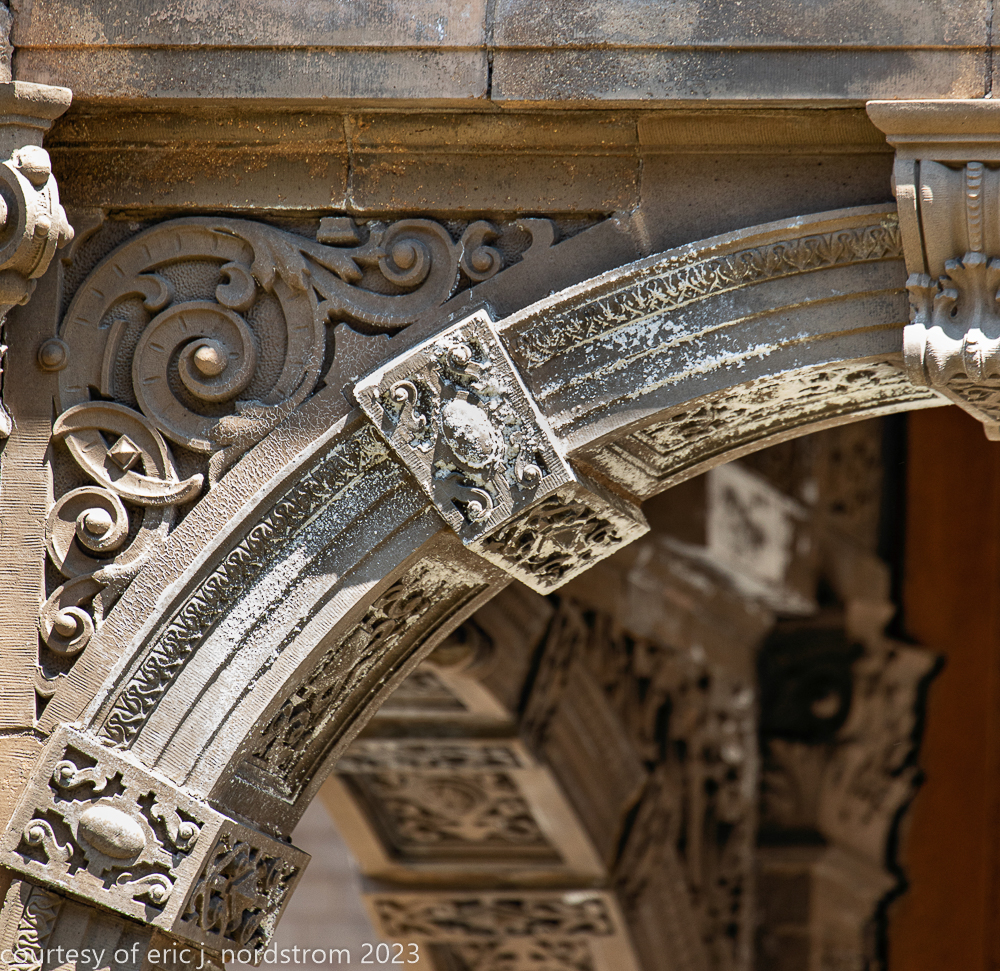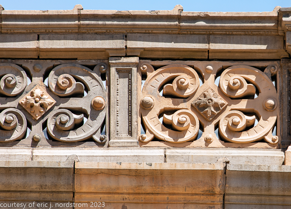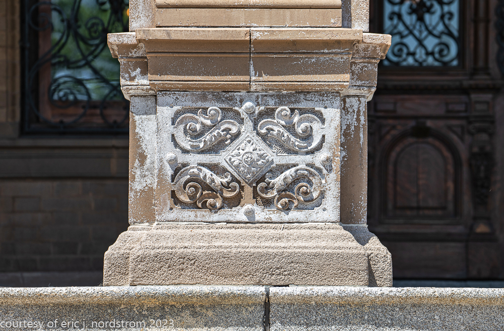 the exterior buff-colored ornamental terra cotta ornament on the flemish renaissance revival-styled frederick mansion (george ferry, architect, 1892) is in need of serious repair (see images below). restoration of the adjoining 1893 world’s fair pabst beer pavilion (designed by architect otto strack, who also designed the extant pabst theater), is underway, with the boston terra cotta company replicating and replacing the structure’s original terra cotta that was executed by the northwestern terra cotta company, chicago, ills. further information will be provided when time permits.