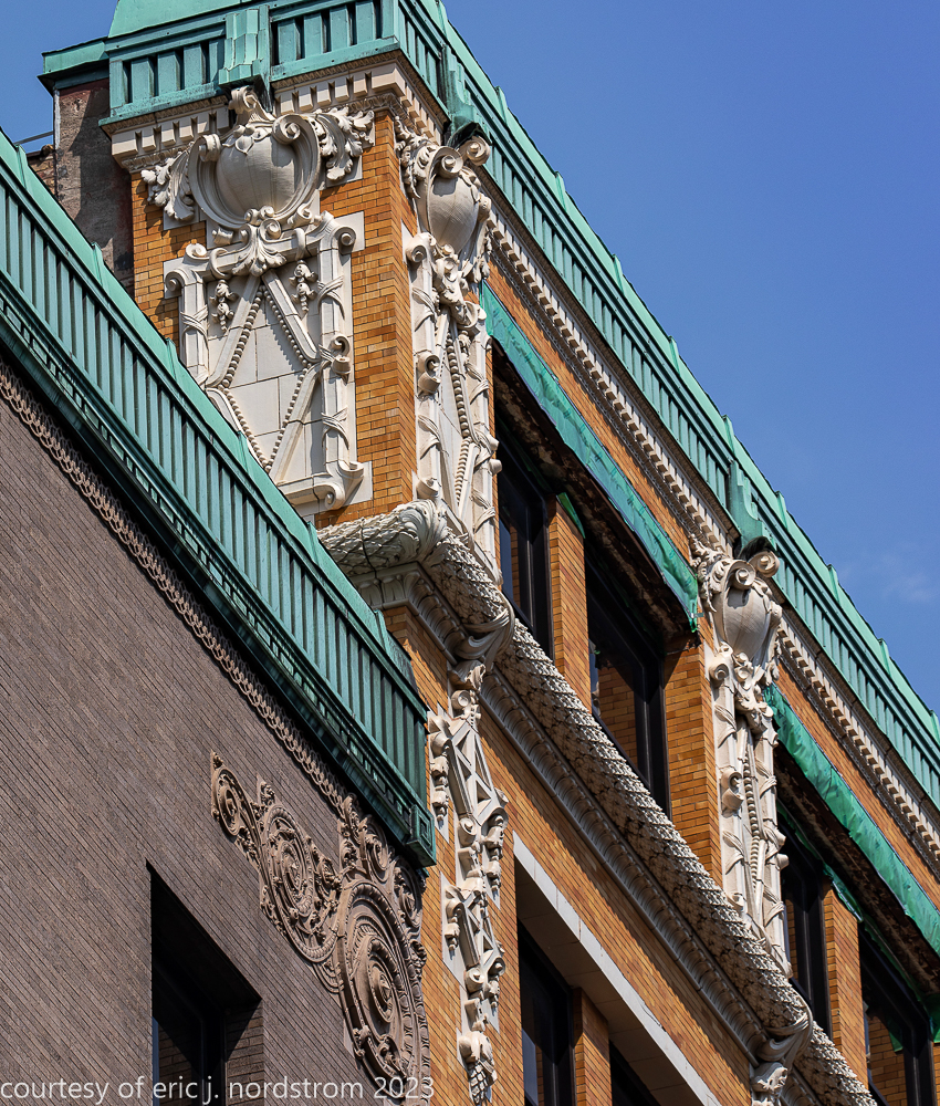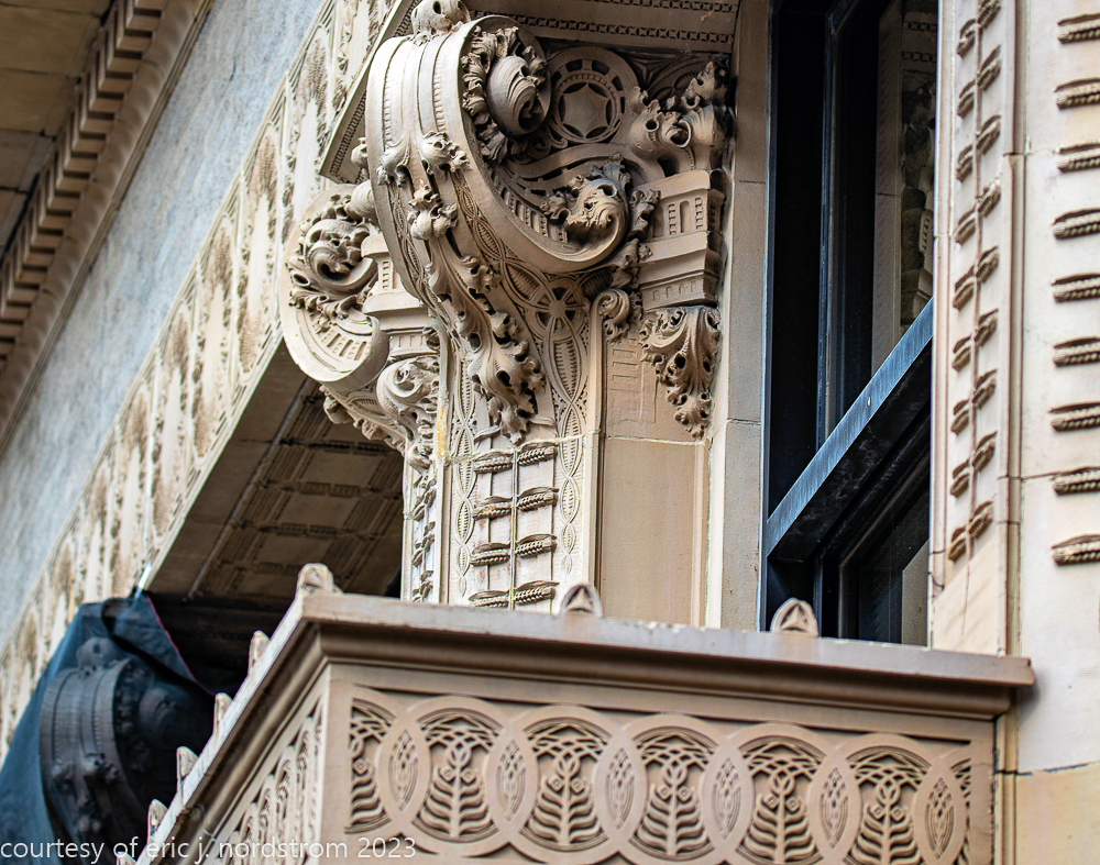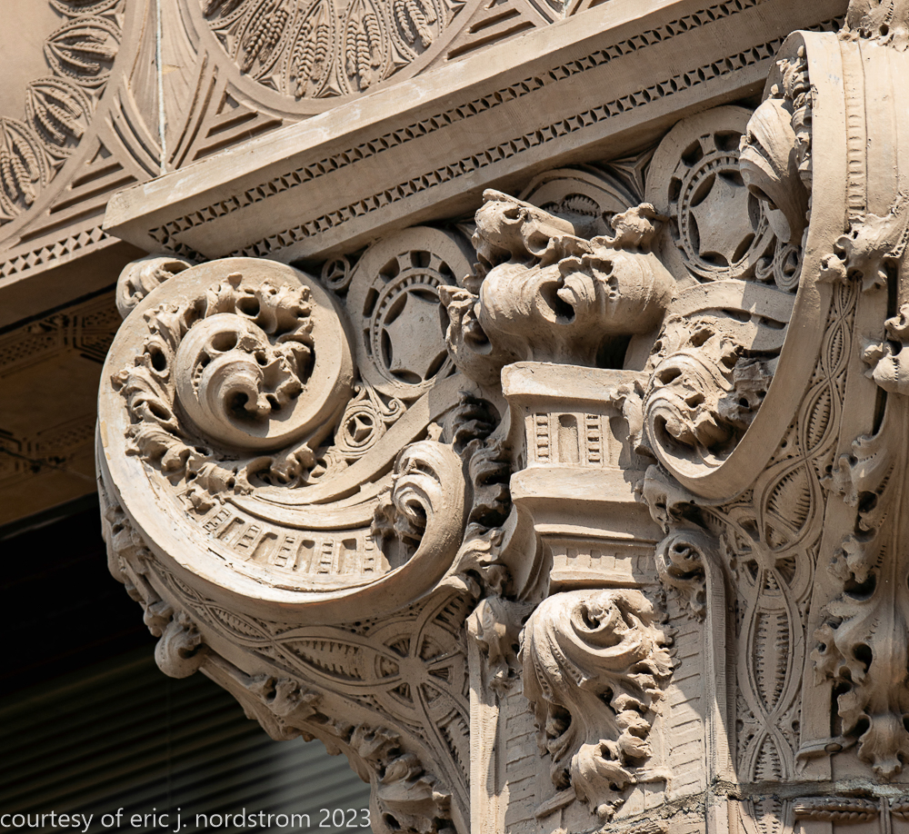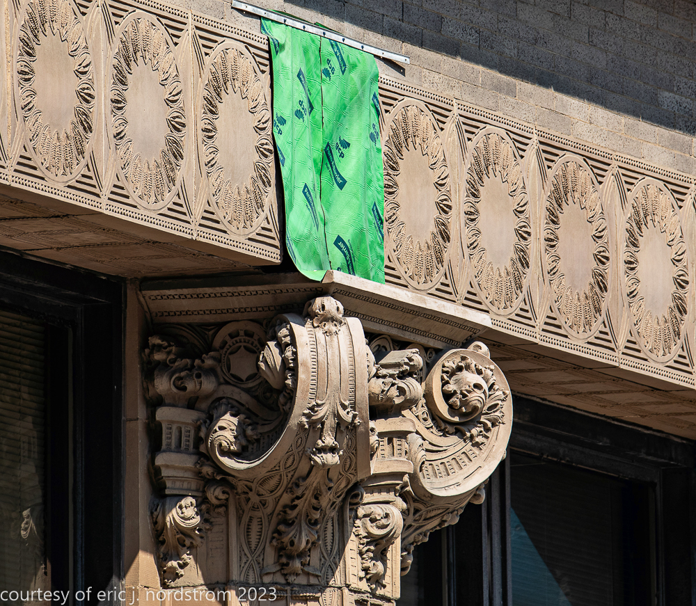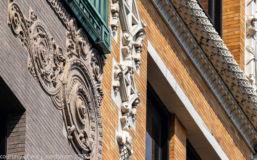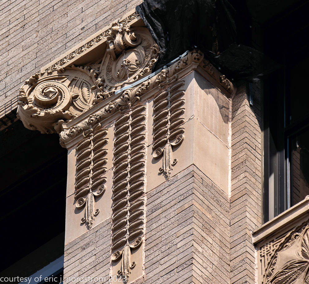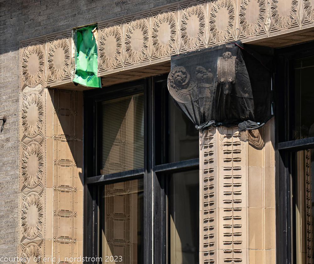 2023 terra cotta facade restoration in progress on kees and colburn’s sullivanesque style grain exchange building
