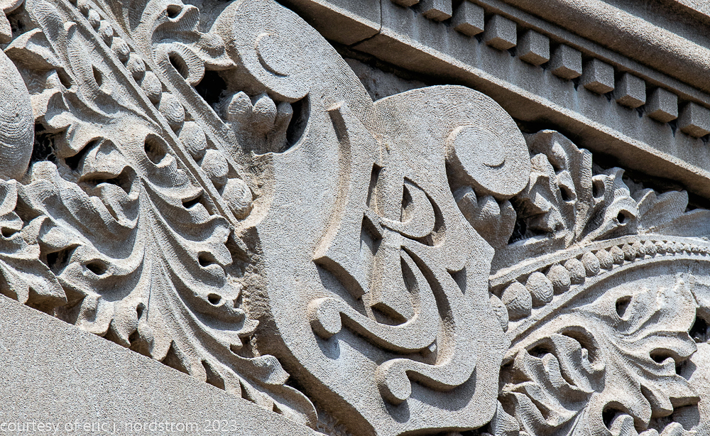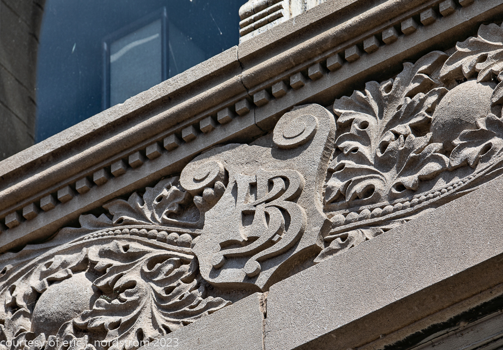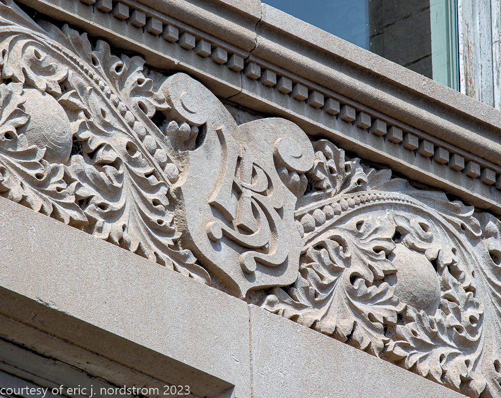 a major remodeling in 1927 moved the entry from the center of the building to the east side and the first floor was further altered by the replacement of the Bedford limestone surface with polished red granite in 1957. the bay windows on the south and west facade were also removed from their original size. these senseless alterations and subsquent damage is evident in the images of the exterior below the monogrammed spandrels.