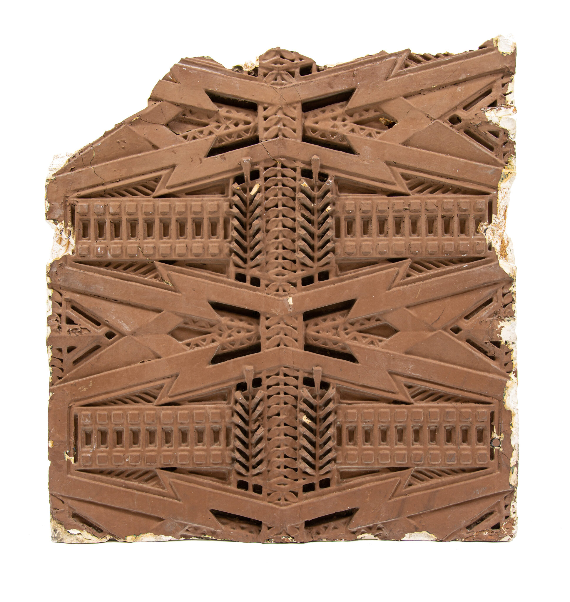 original museum quality 1902 ornamented painted cast plaster “sumac pattern” exterior frieze fragment removed from frank lloyd wright’s susan lawrence dana house in 1979 shortly before restoration commenced. the replacement panels consist of a vinyl-coated plywood. the restoration involved the recasting of the original frieze in a more durable material and put back into place. a few sections (such as the one shown above) of the original frieze are now in museums and private collections.
