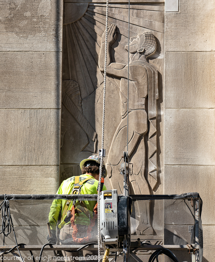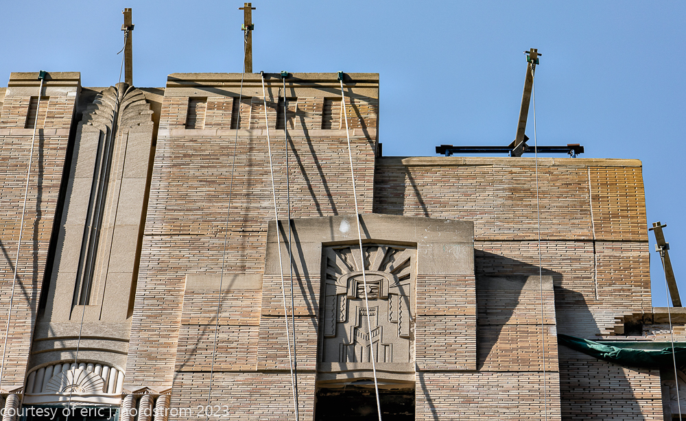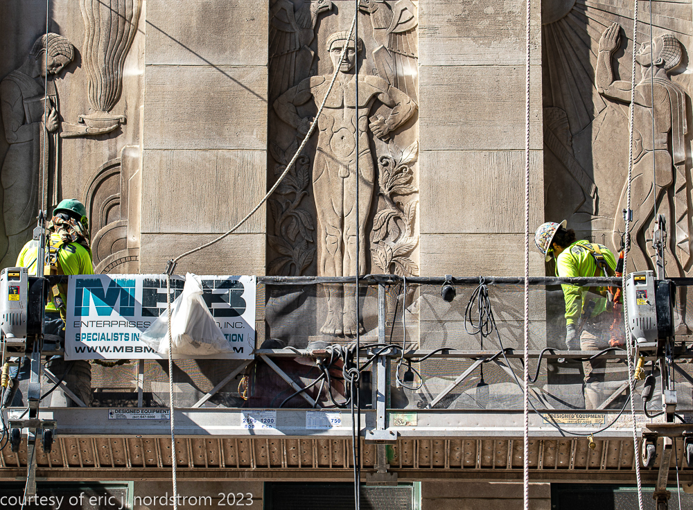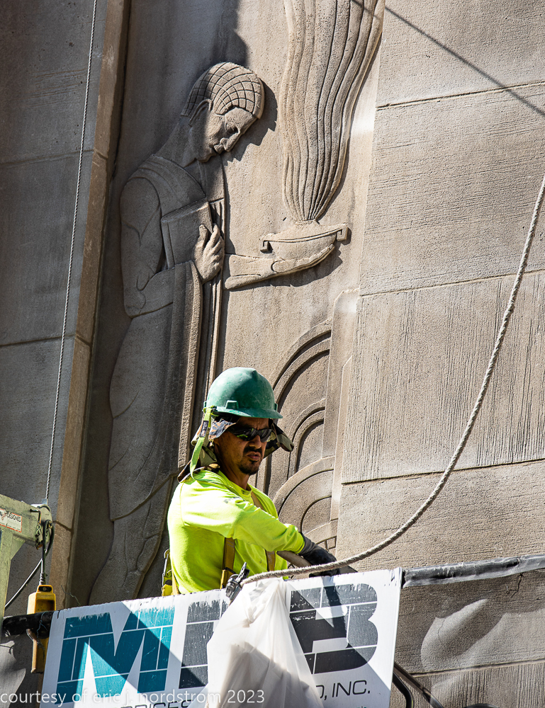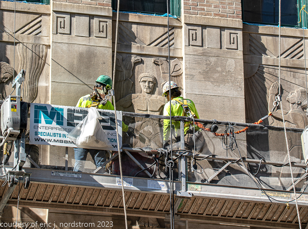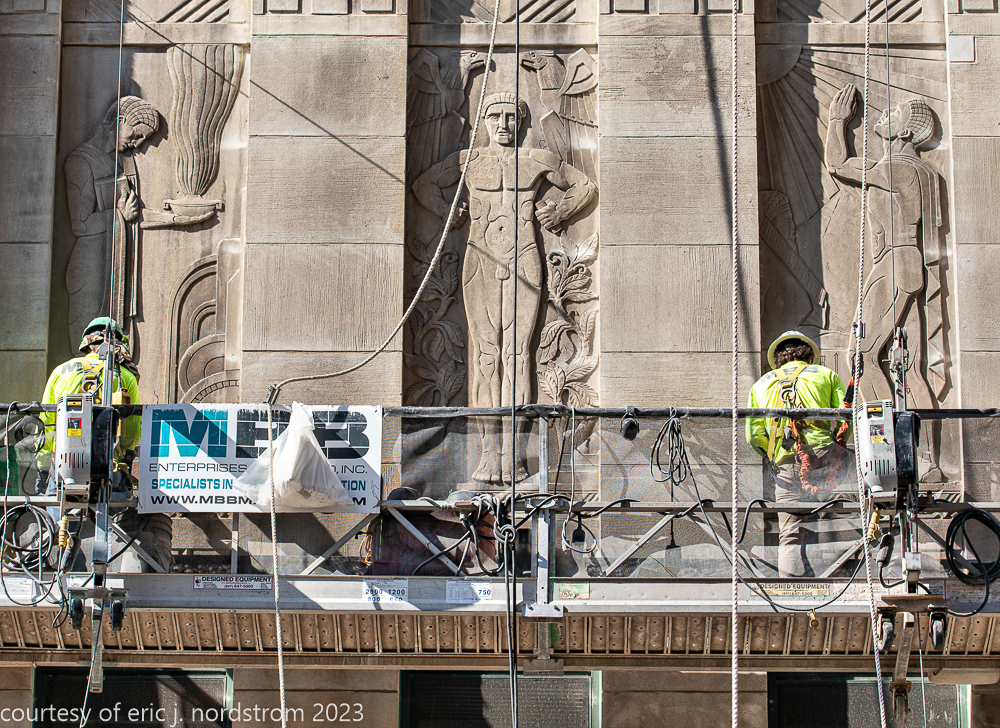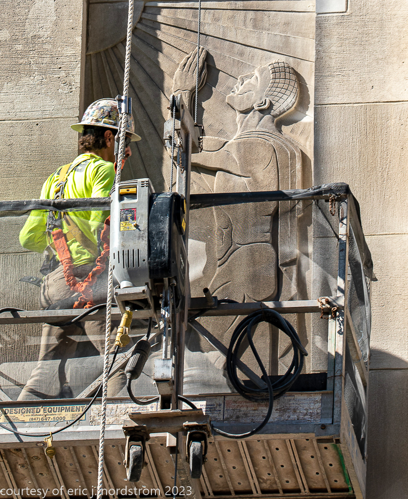 men at work: restoration of victor lawson ymca memorial building (1931) bedford limestone facade well underway