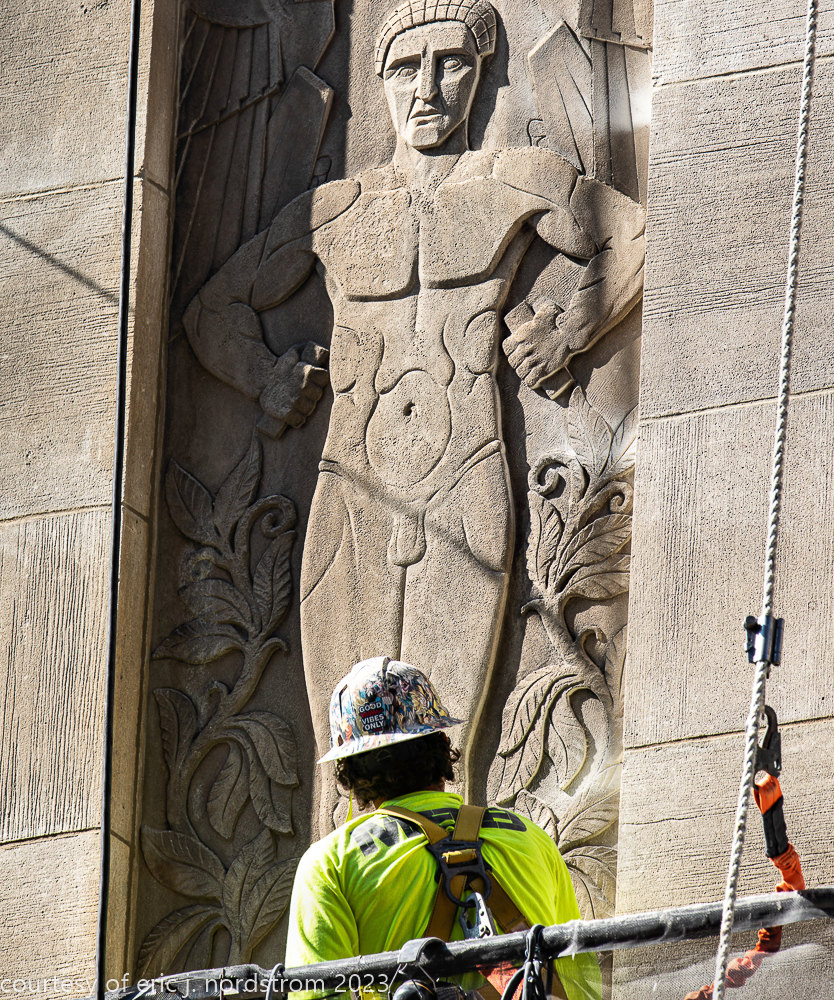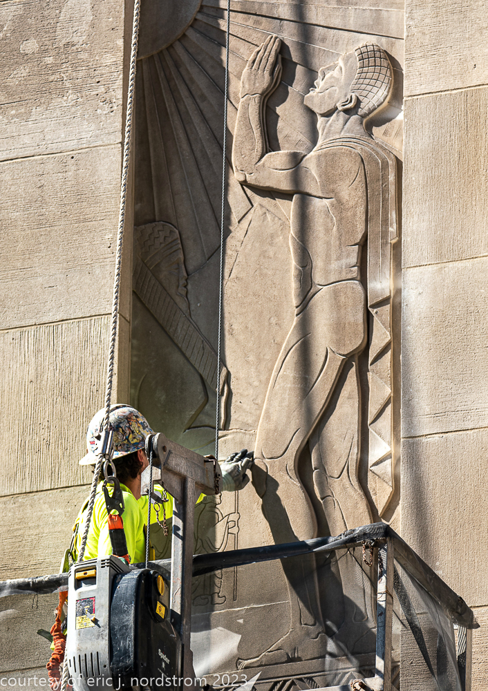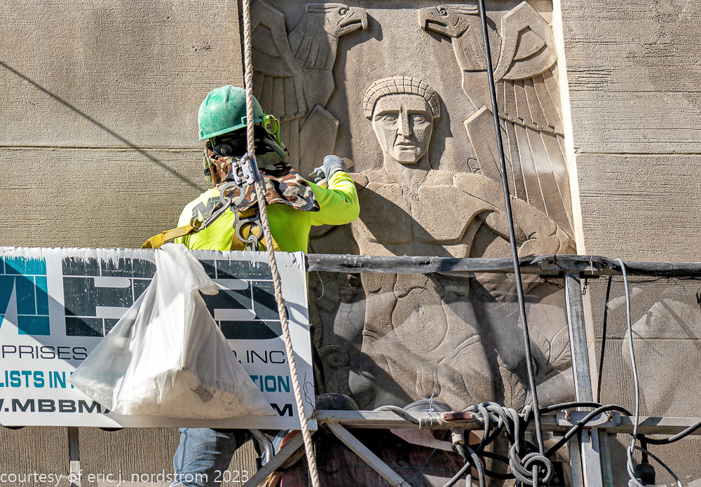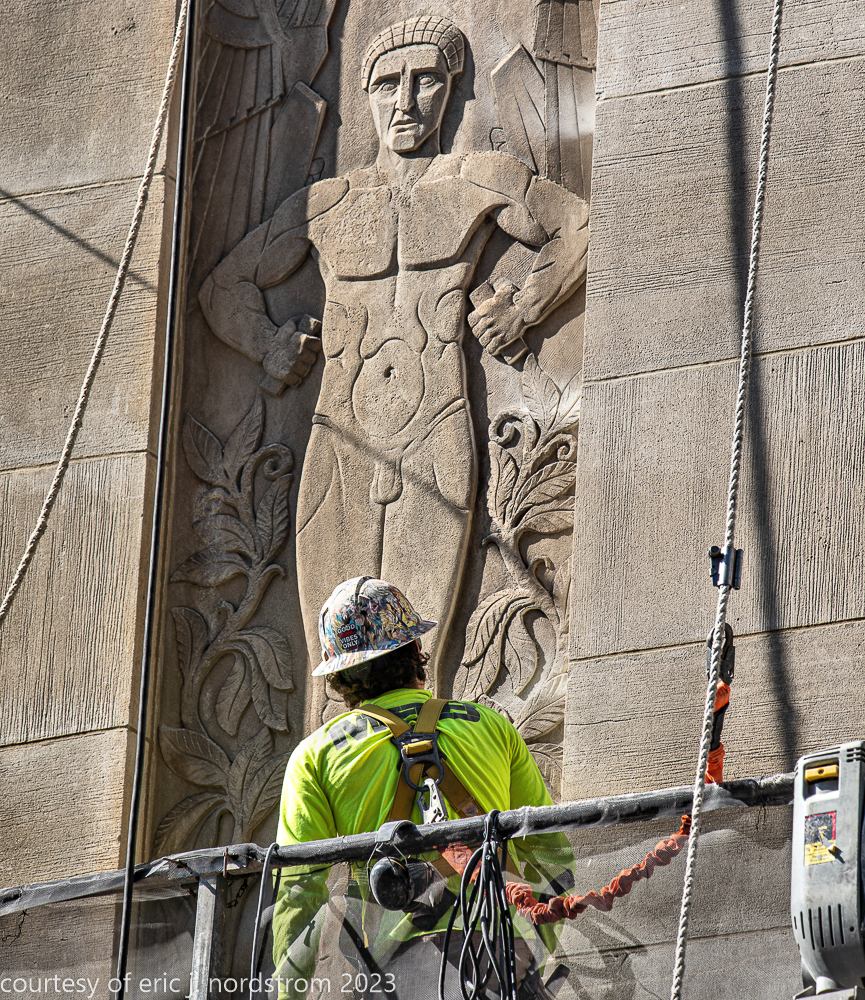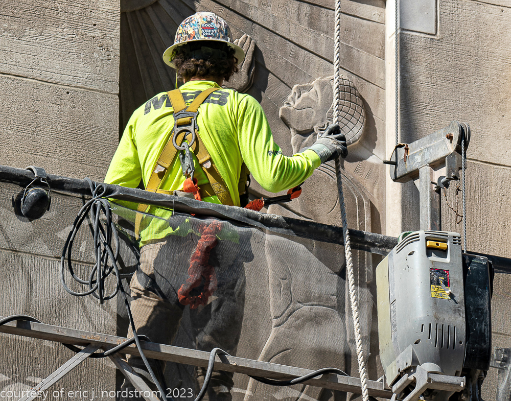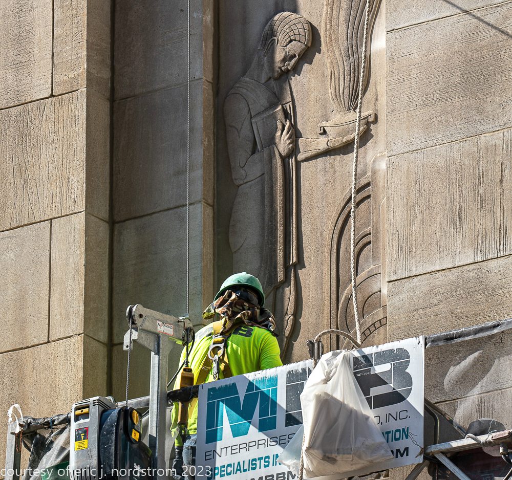 men at work: restoration of victor lawson ymca memorial building (1931) bedford limestone facade well underway