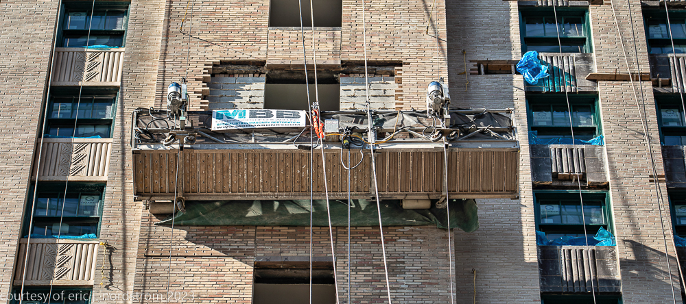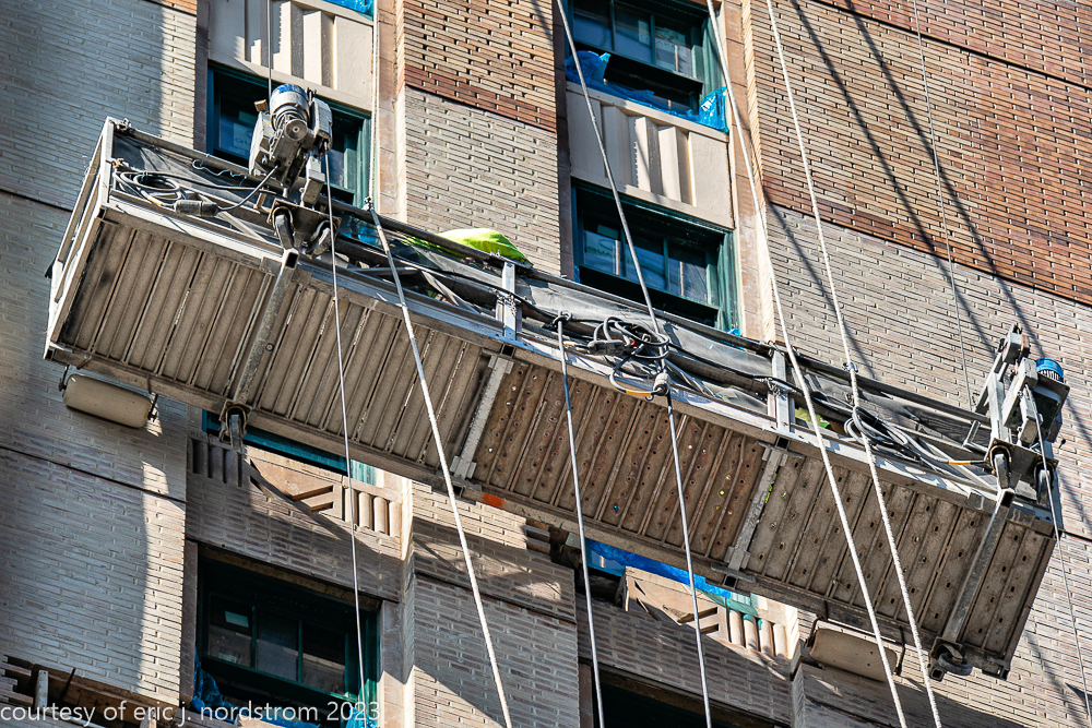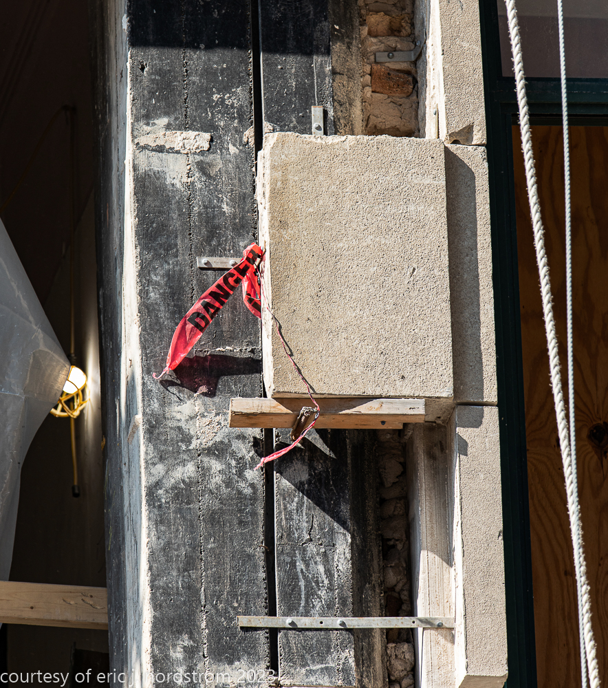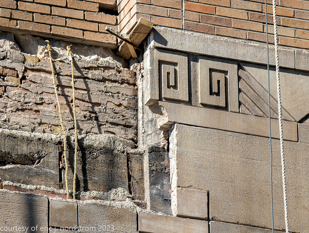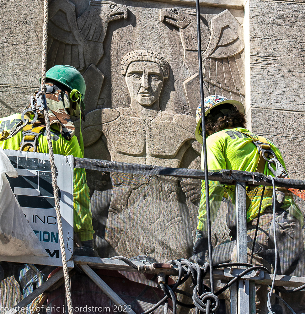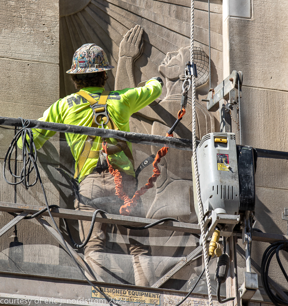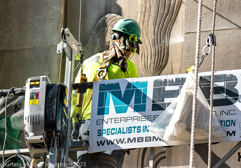 men at work: restoration of victor lawson ymca memorial building (1931) bedford limestone facade well underway