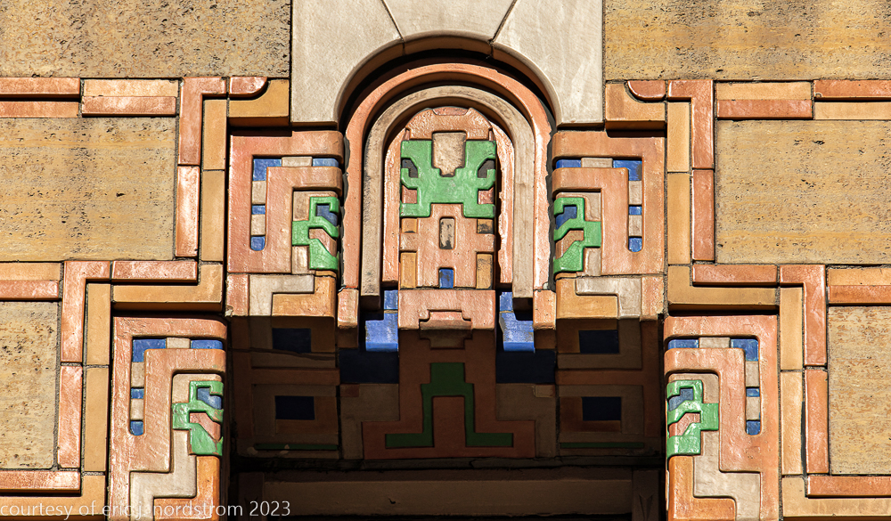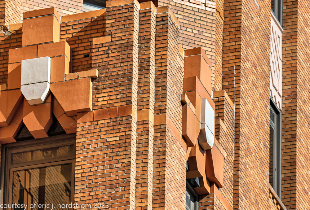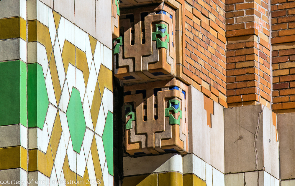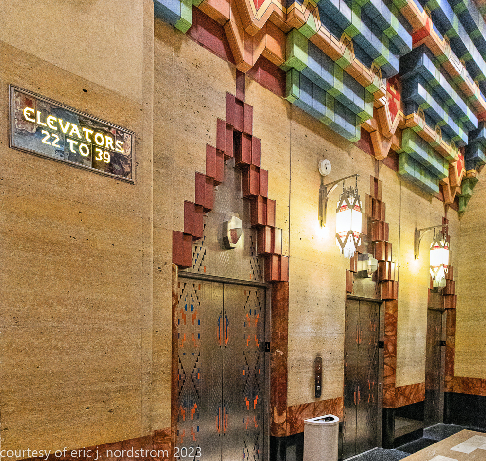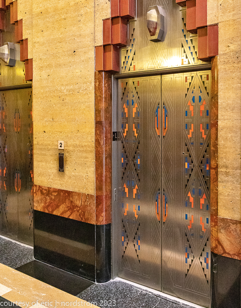 The Guardian Building featured innovations in both design and technology. The building’s designer, Wirt Rowland, specified Monel metal in place of the commonly used brass and bronze for all exposed metalwork on the building, an innovation which was widely adopted, most notably on New York’s Chrysler Building. Rowland dispensed with traditional forms of decoration, using instead colored materials (brick, stone, and terra cotta) set in geometric patterns on both the interior and exterior of the structure. The building’s elevator system represented the first use of technology which automatically stopped the car level with the floor and opened the doors, tasks formerly handled by the operator.[8]