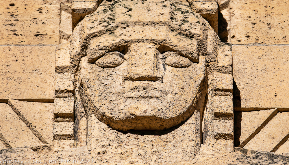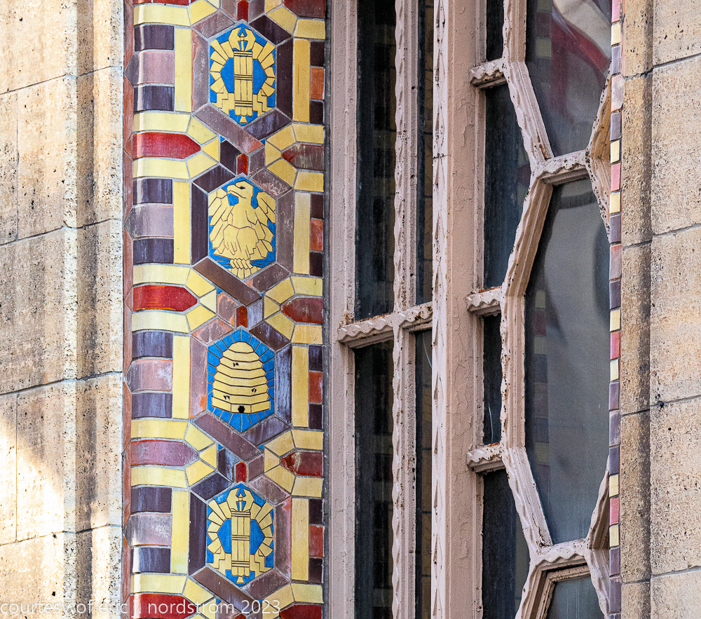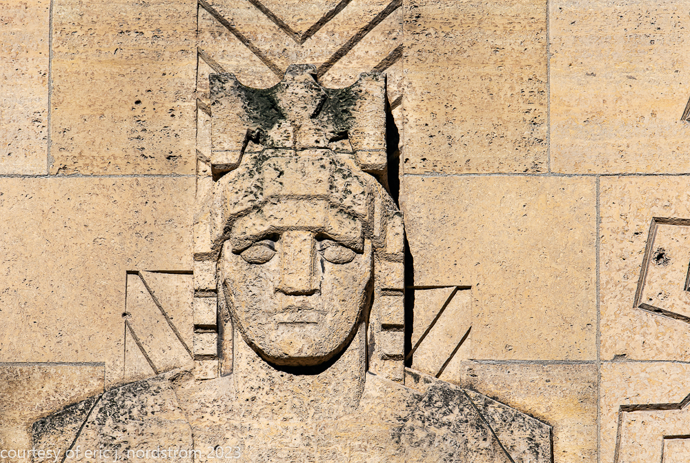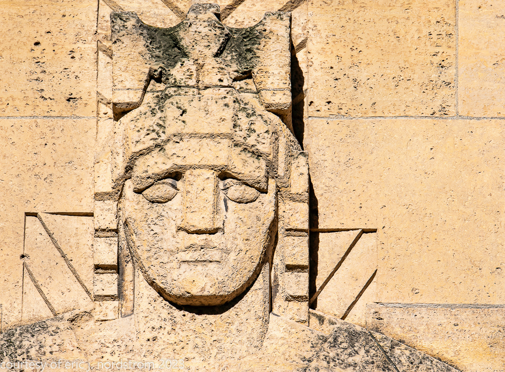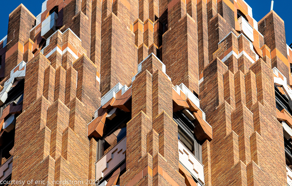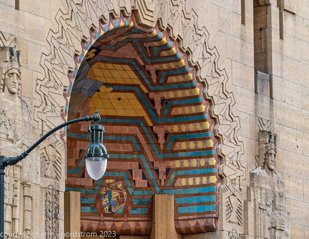 The main frame of the skyscraper rises 36 stories, capped by two asymmetric spires, one extending for four additional stories. The roof height of the building is 496 ft (151 m), the top floor is 489 feet (149 m), and the spire reaches 632 ft (192.6 m). Its nickname, Cathedral of Finance, alludes both to the building’s resemblance to a cathedral—with its tower over the main entrance and octagonal apse at the opposite end—and to New York City’s Woolworth Building, which had earlier been dubbed the Cathedral of Commerce.[4] Native American themes are common inside and outside the building. Wirt C. Rowland, of the Smith, Hinchman & Grylls firm, was the building’s architect. The building rises from a granite and stone six story base with two Corrado Parducci created sculptures flanking the Griswold Street entrance. The exterior blends brickwork with tile, limestone, and terra cotta. Rowland’s attention to detail was meticulous. He supervised the creation of the colored brick cladding to achieve the desired color for the exterior. Afterward, the brick was marketed by the manufacturer as “Union Trust Brick” and after 1939, as Guardian brick”.[5] Rowland designed furniture for the bank’s offices and his attention went as far as designing tableware, linens and waitress uniforms for a restaurant in the building.
