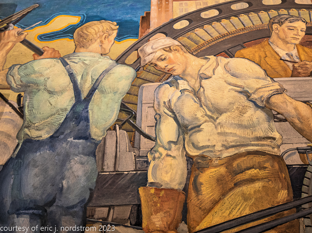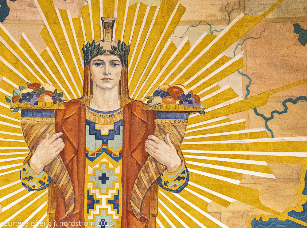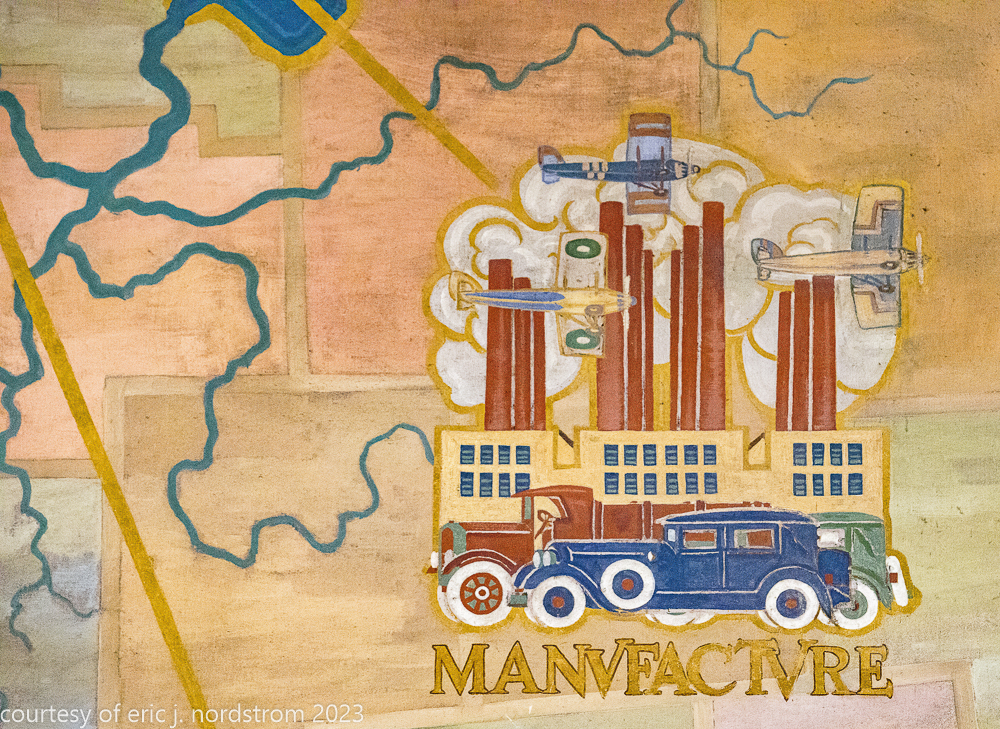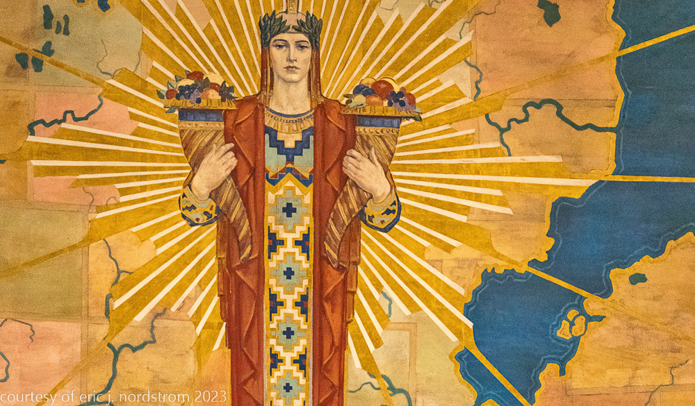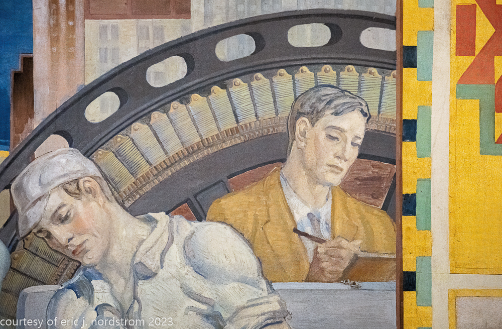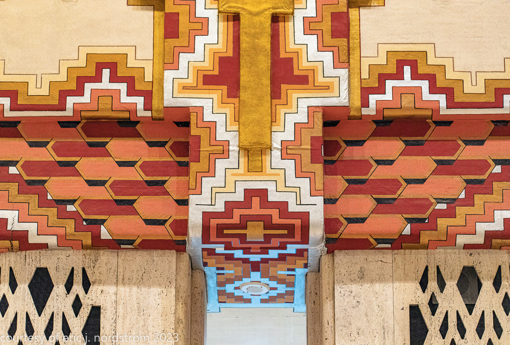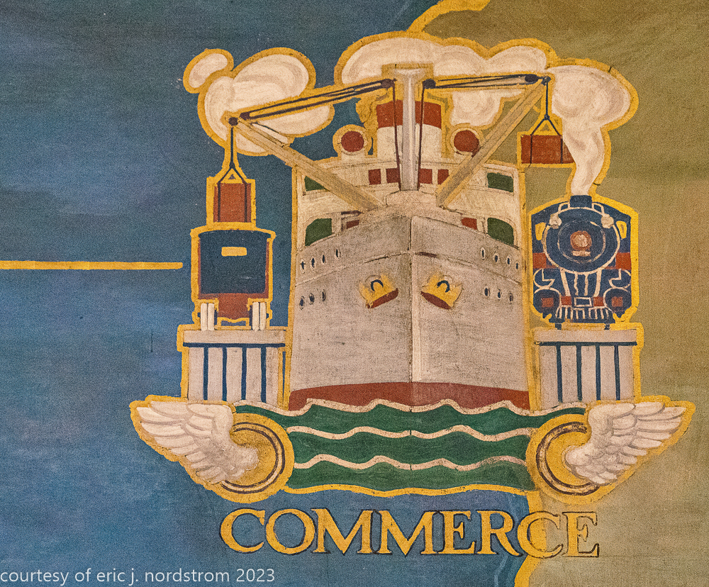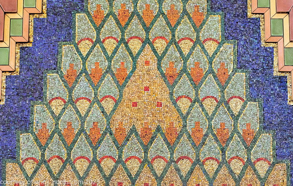 The building’s three story, vaulted lobby is lavishly decorated with Pewabic and Rookwood tile. The semi-circular exterior domes are filled with Pewabic Pottery; Mary Chase Perry Stratton worked closely with the architect in the design of the symbolic decorations.[6] (See Savage, infra.) A Monel metal screen divides the lobby from the banking hall on the second floor, the screen features a clock in the center designed by Tiffany. The building includes works by muralist Ezra Winter in the mosaic above the main lobby desk and the mural at the end of the banking hall.[7] The large mosaic is of a pine tree and text that states the Union Trust Company’s purpose for the building, “Founded on principles of faith and understating, this building is erected for the purpose of continuing and maintaining the ideals of financial services which promoted the organization of the institution”. The mural highlights Michigan’s industries such as manufacturing, farming and mining. In order to dampen the sound in the banking hall, its cement-plaster ceiling features a hand-painted canvas ceiling, which was stretched over a mat of horsehair.