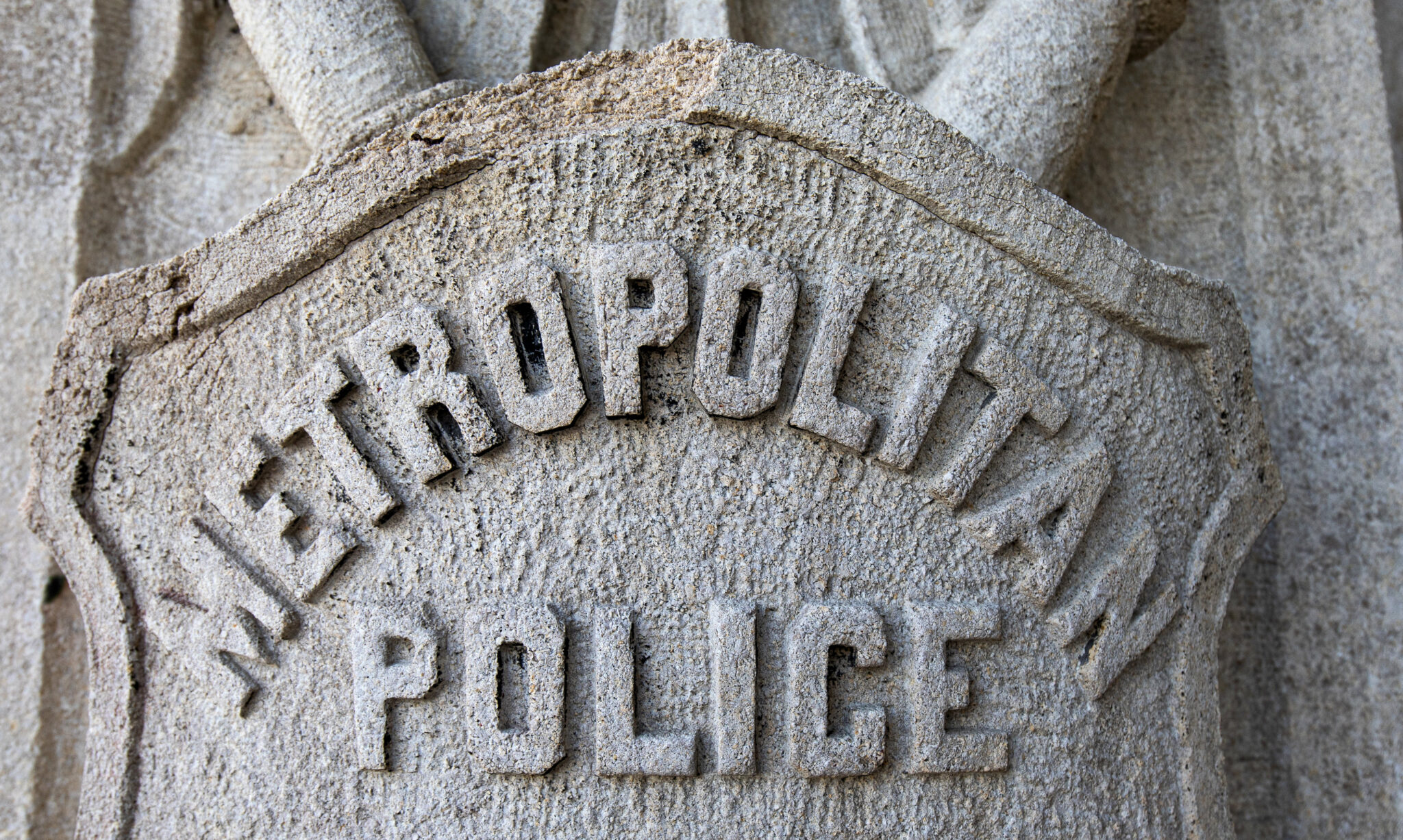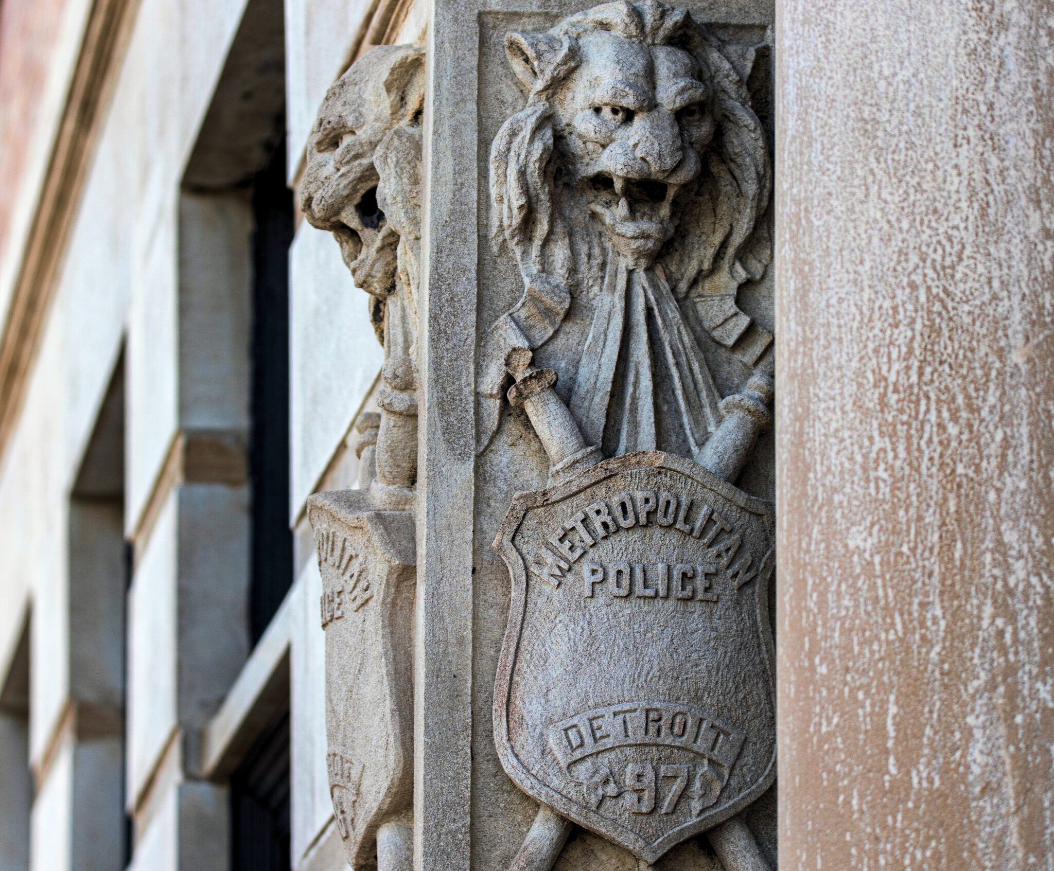 the carved limestone portico is quite unique, featuring the heads of policemen surrounded by leafage, badges or shields with cuffs and batons, and menacing lionheads.
