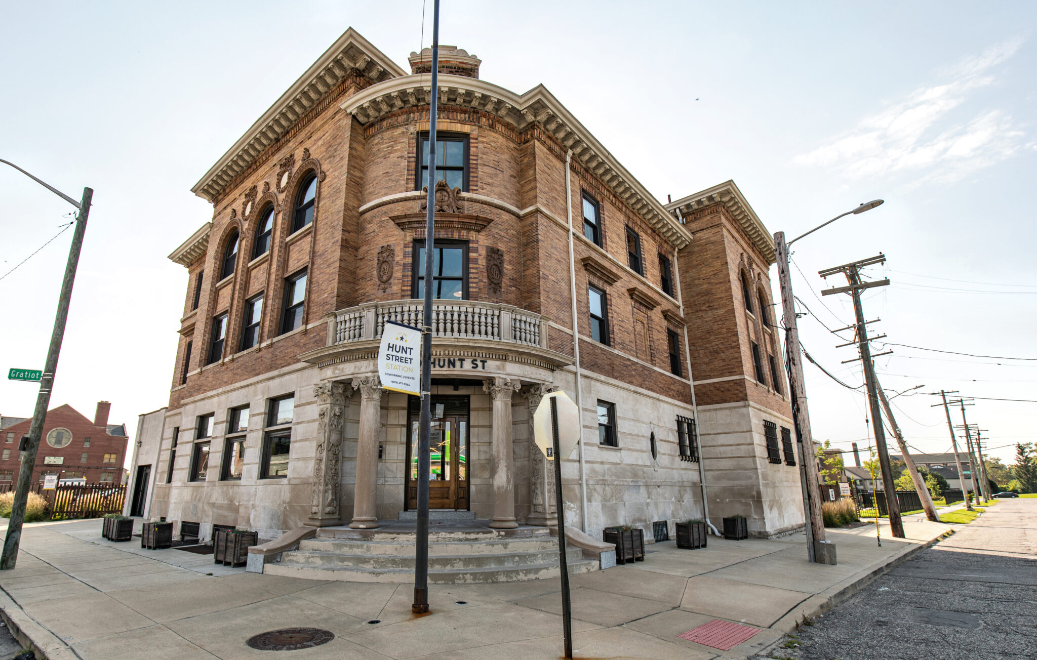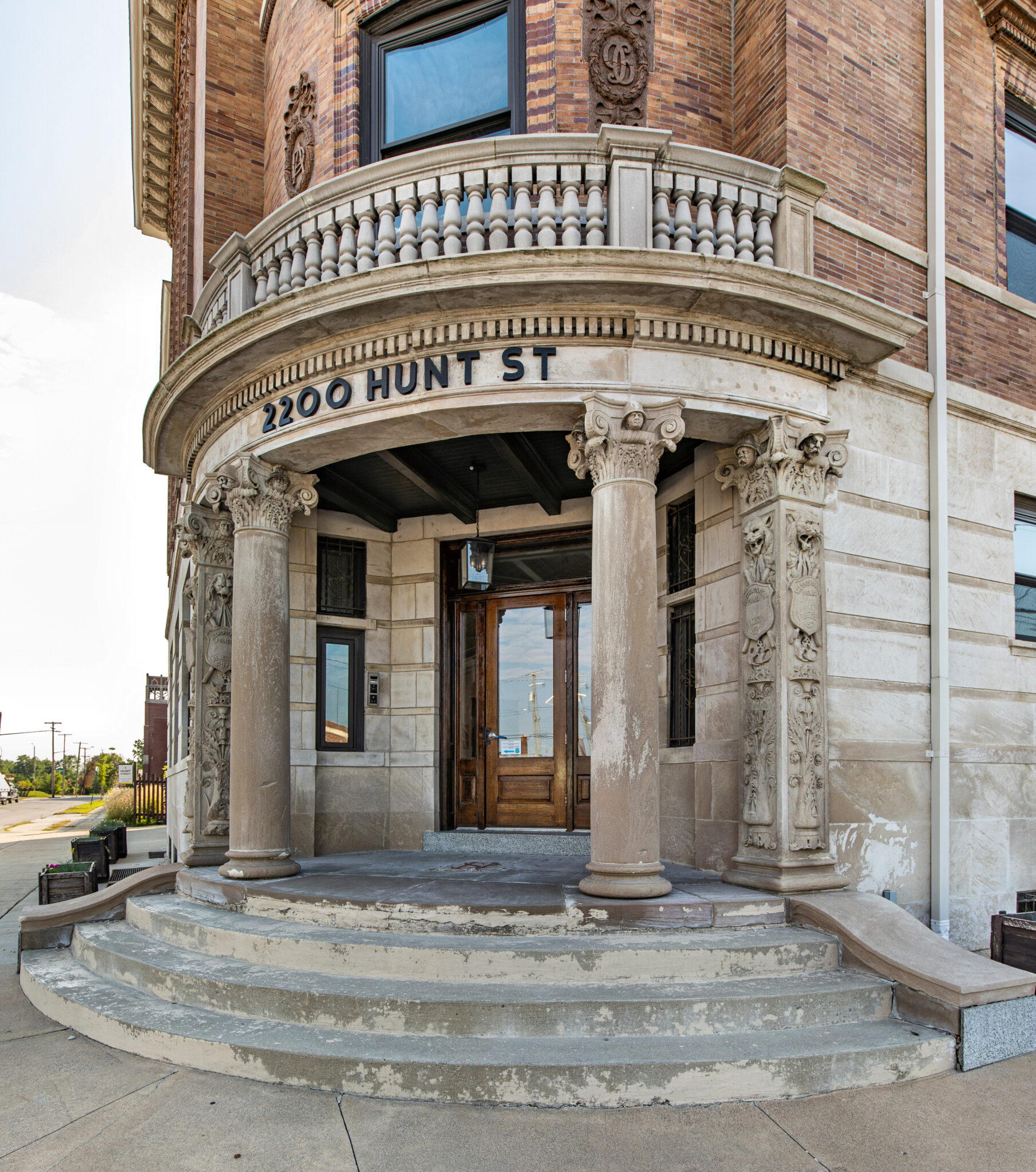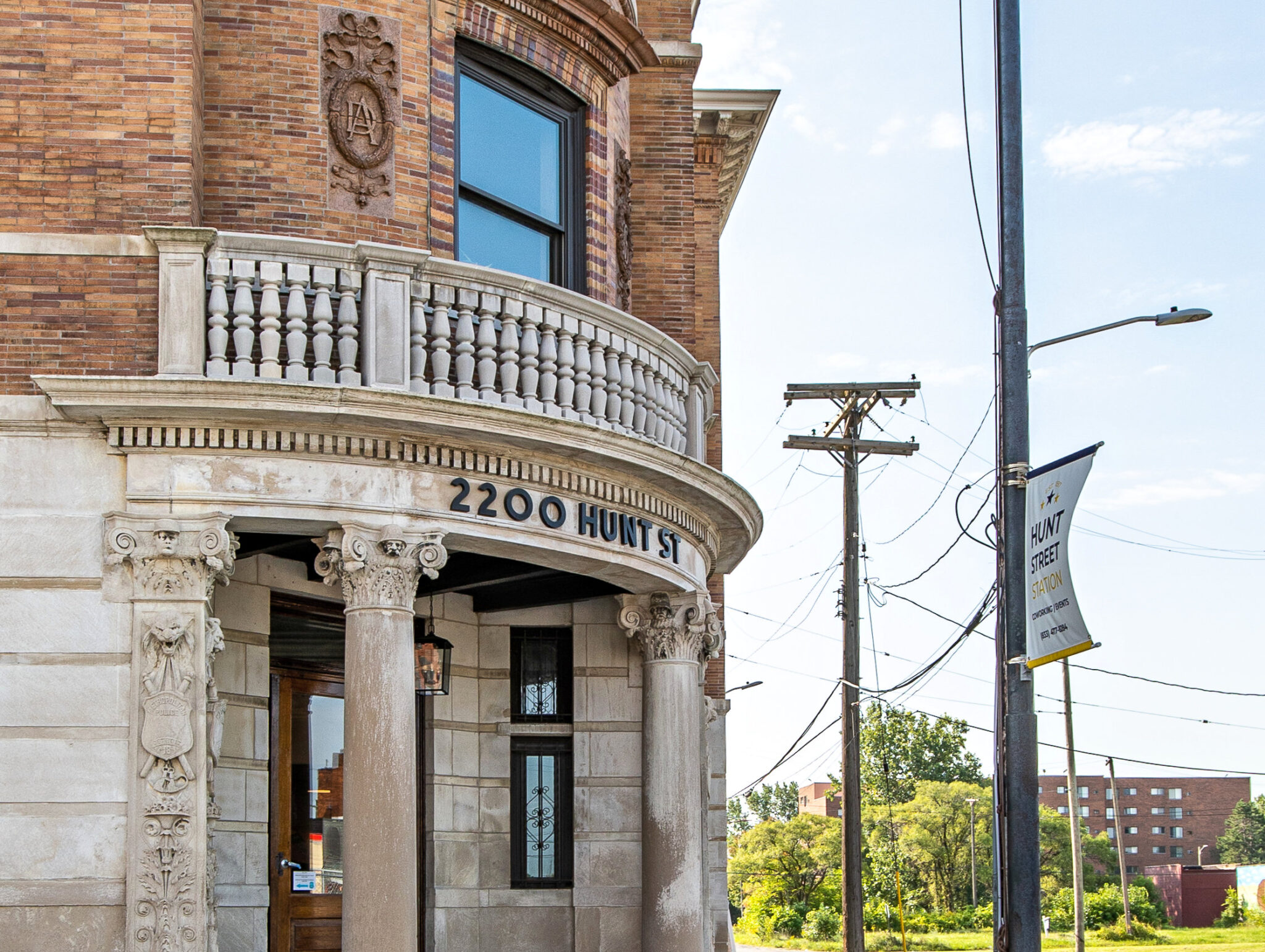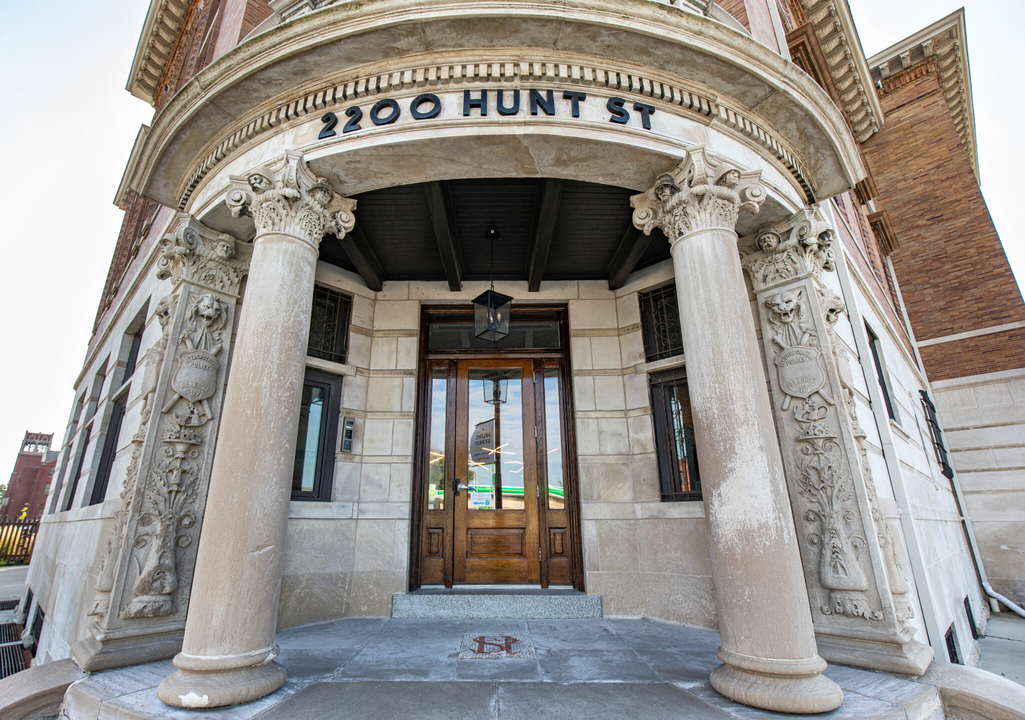 exterior images of edward c. van leyen’s beax-arts style three-story brick and bedford limestone third precinct station (1896), located at 2200 hunt street, detroit, mich.