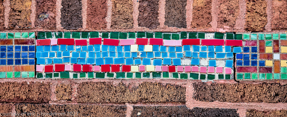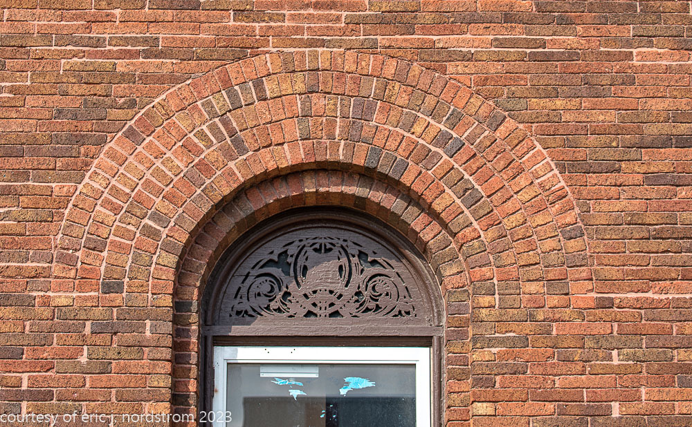 elmslie punctuated the dark red tapestry brick exterior with polychromatic sullivanesque terra cotta ornament (i.e., opposed panels above main entrance), oversized cartouches bearing name of bank (unfortunately, a reckless name alteration/eradication left the centrally located portion of the panels visibly scarred), richly colored mosaic tile borders surrounding the polychromatic panels, a single delicate fret-sawn painted wood lunette above the arched entrance located above the side door, and leaded art glass windows.