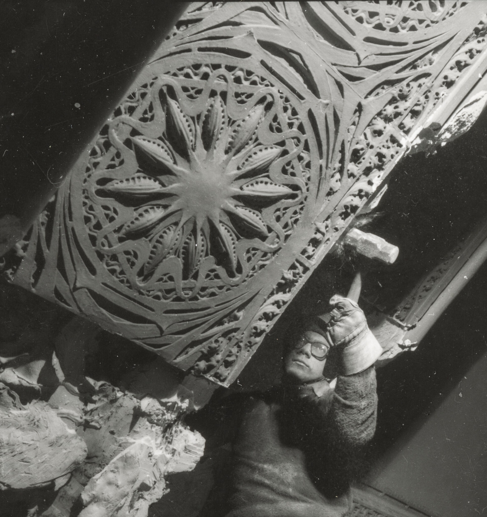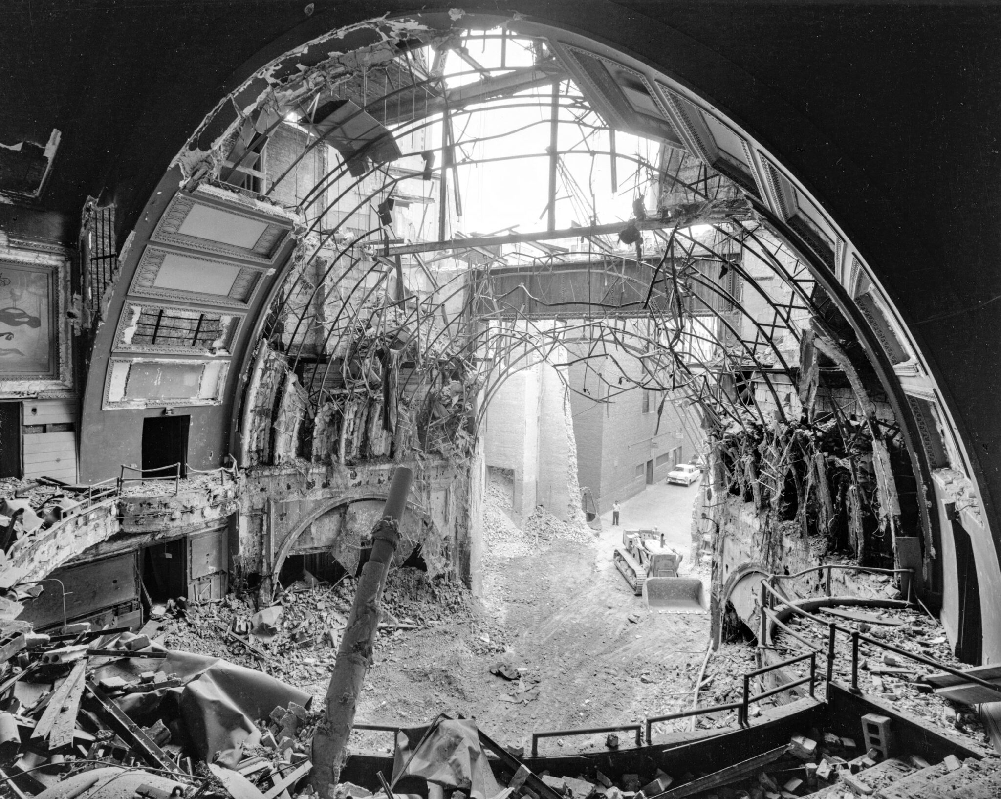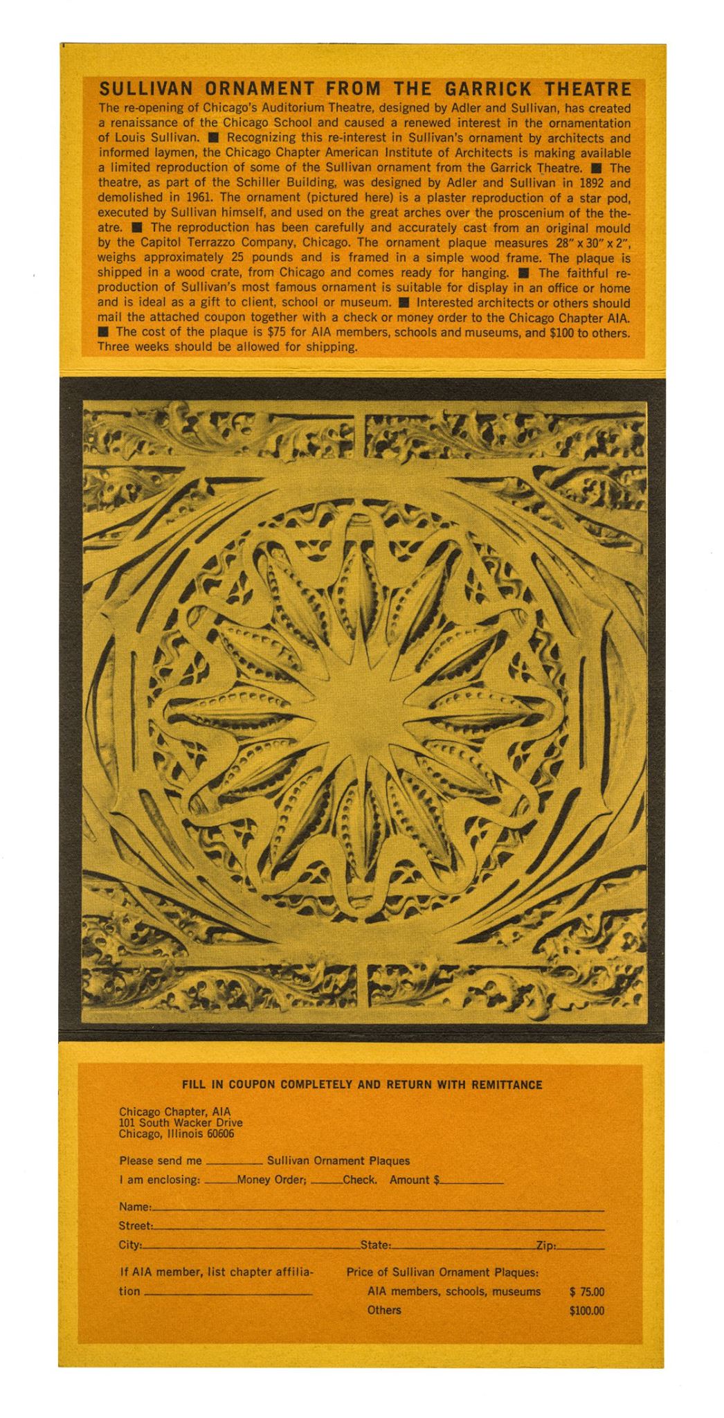 when adler and sullivan’s schiller building (1892) – later known as the garrick theater – was undergoing demolition in 1961 (a multitude of preservation groups and notable figures around the world vigorously protested and fought to save it from destruction months prior), a small number of forward-thinking organizations generously provided financial assistance towards saving the building’s interior and exterior ornament, spear-headed by richard nickel, who would ultimately be responsible for carefully extracting the ornament – with help from john vinci and david norris – and later, oversee the distribution of it to various museums, universities, and other non-profit institutions or organizations around the world.