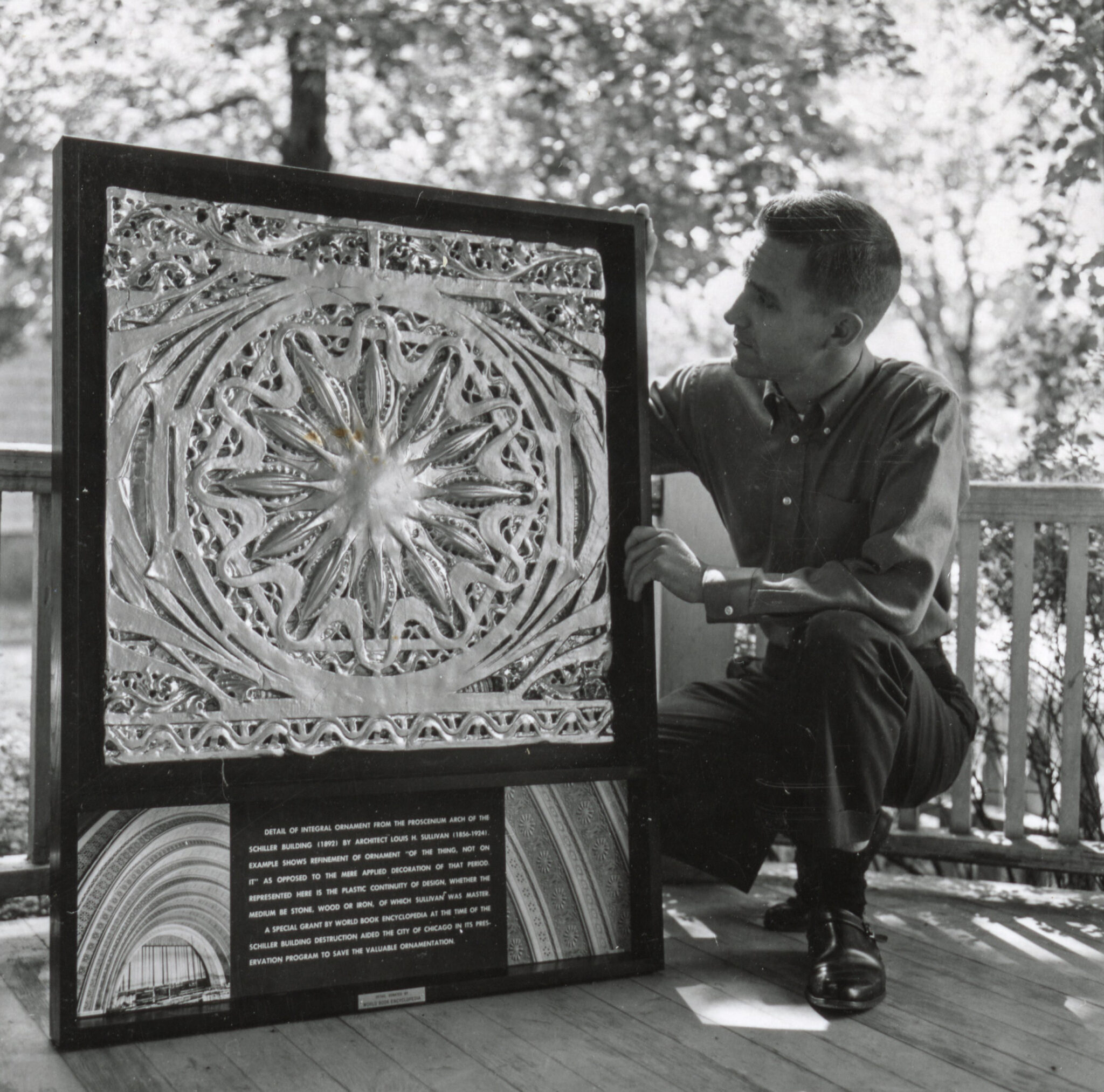 the ornament chosen was known at the time as the “star-and-pod,” a term nickel coined when providing a description to the highly visible panels used in the auditorium’s multiple proscenium vaults. the panels were then painted gold (later analysis determined the original color scheme consisted of shades of green) and mounted in black-painted oak wood shadow boxes with a centrally located description below, flanked by two photographic images taken by richard nickel and aaron siskind. a small brushed steel rectangular-shaped plaque with lightly incised black lettering located at the very bottom edge of the shadow box identified the assemblage as a donation by world book encyclopedia.