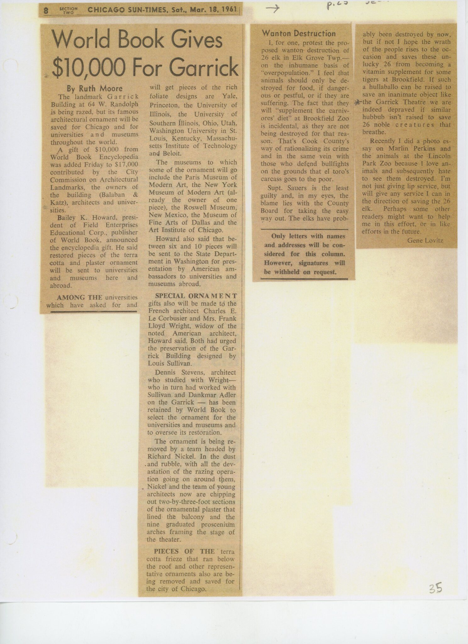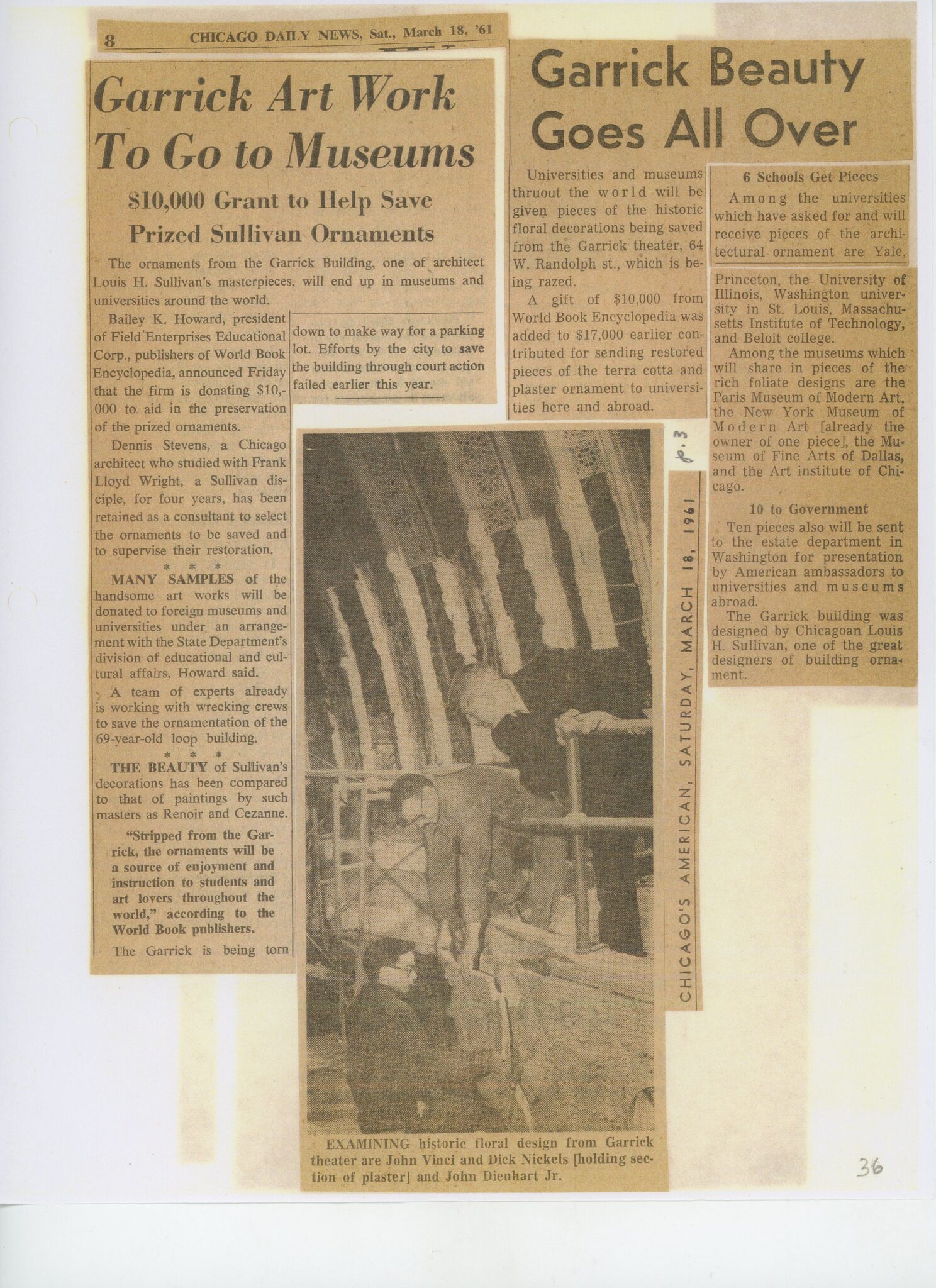 one the of the financial backers that contributed 10,000 dollars to what later became known as the “garrick ornament removal funds,” was field enterprises educational corporation, publishers of world book encyclopedia, who retained the services of chicago-based architect dennis stevens, who was charged with selecting the ornament and overseeing its restoration in preparation for presentation to numerous universities.