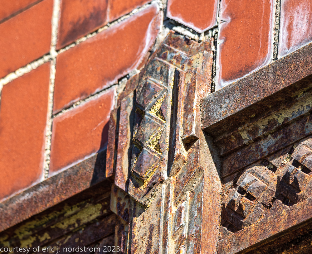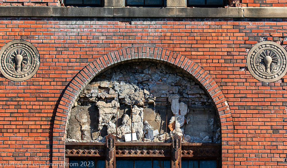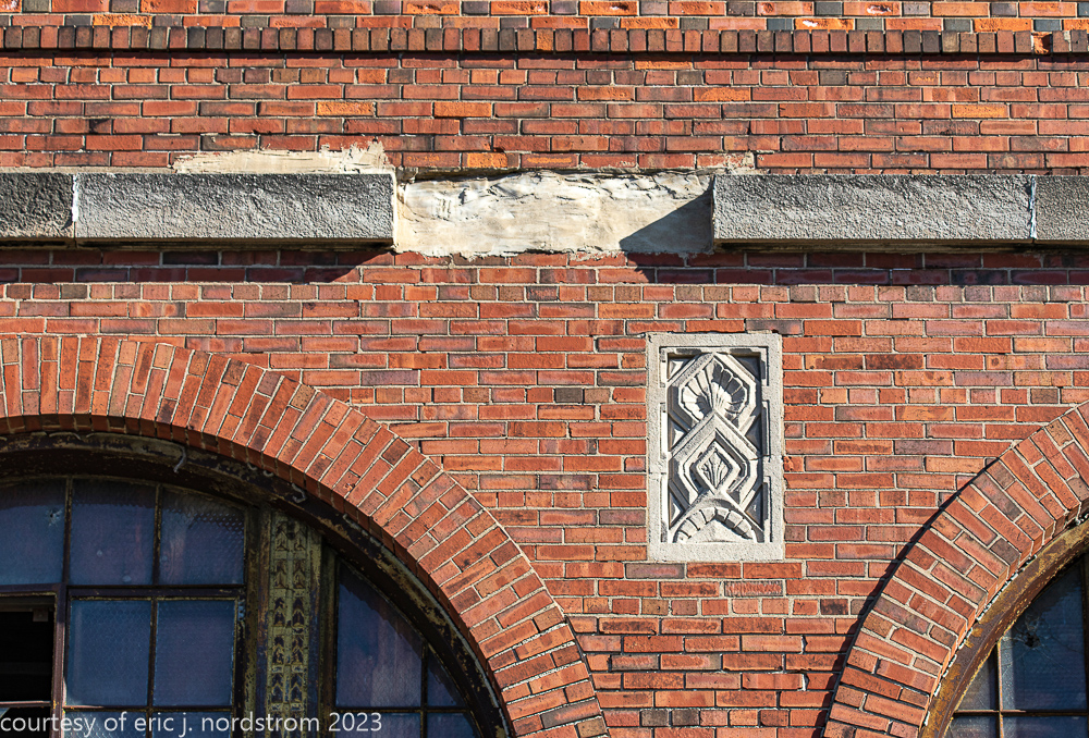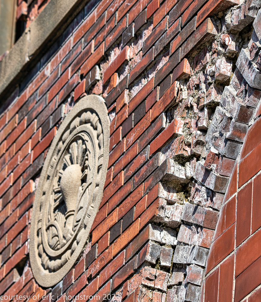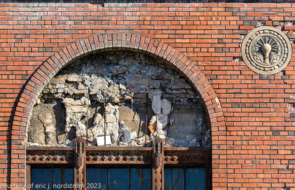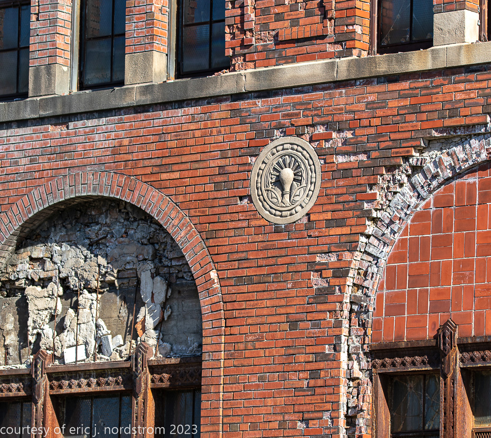 several of holst’s signature patterned tile lunettes found a new home on the sidewalk below. one of the bedford limestone rondels with lightbulb fell from the building and disappeared since my last visit in fall of 2020.