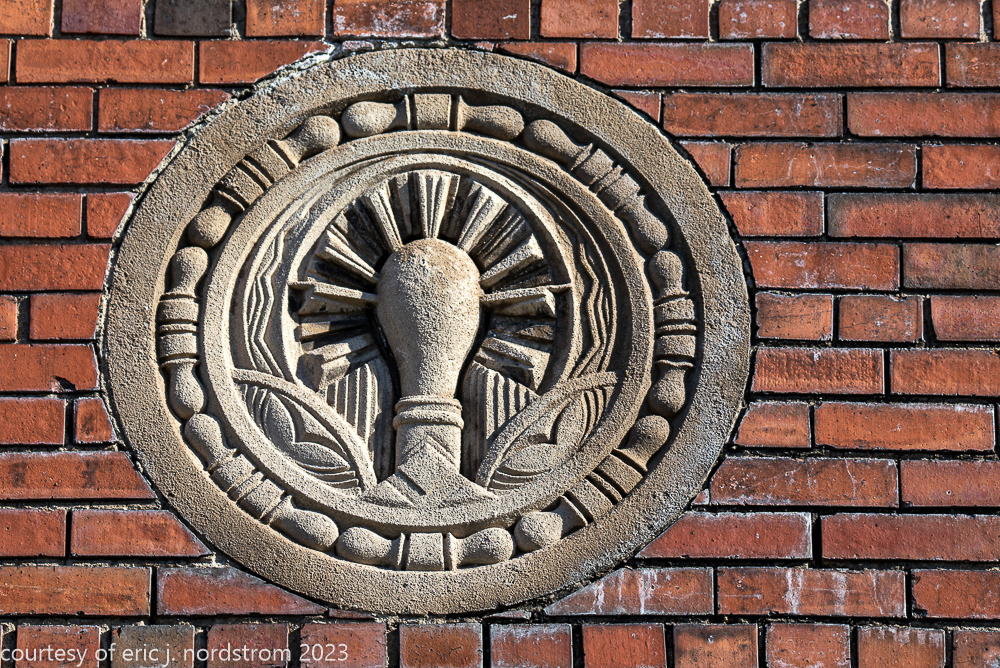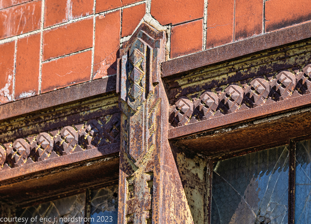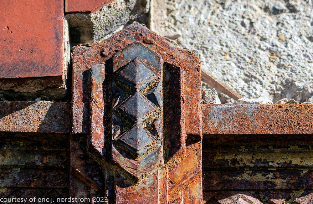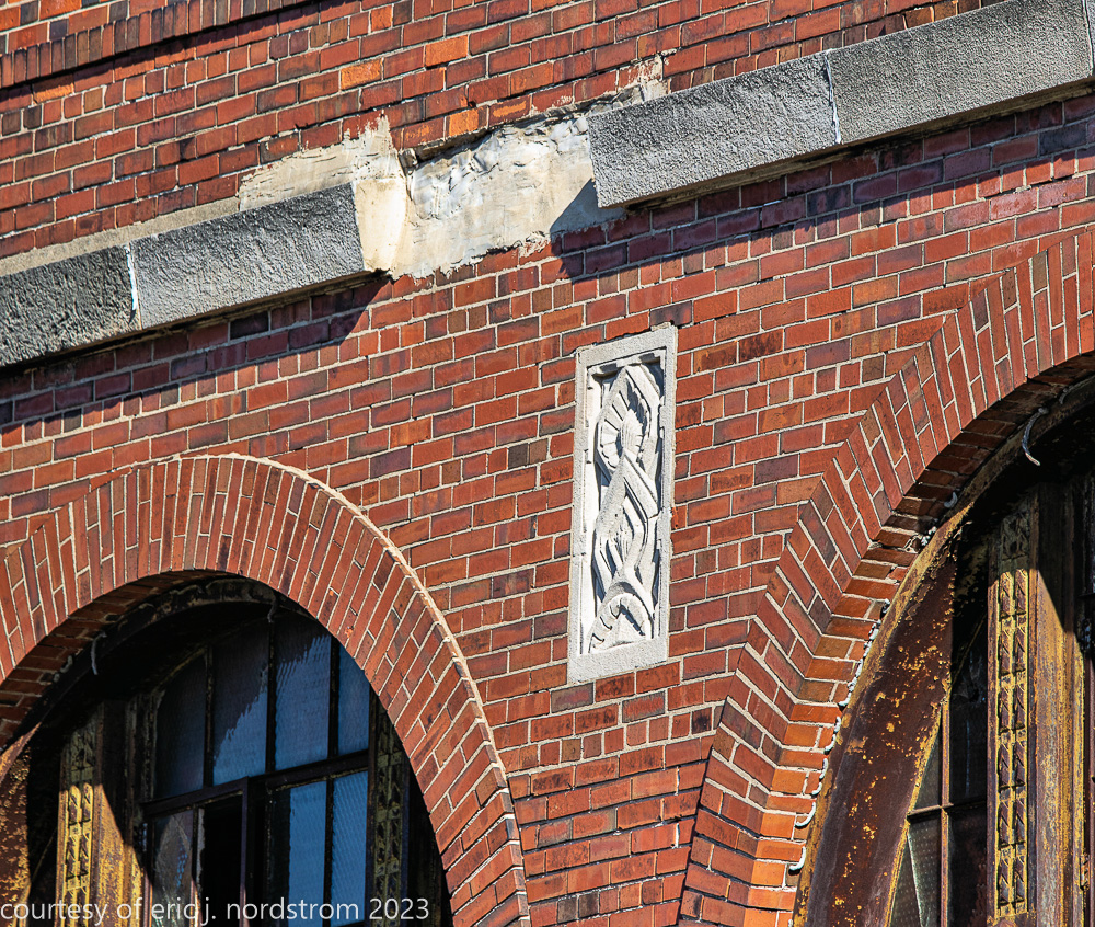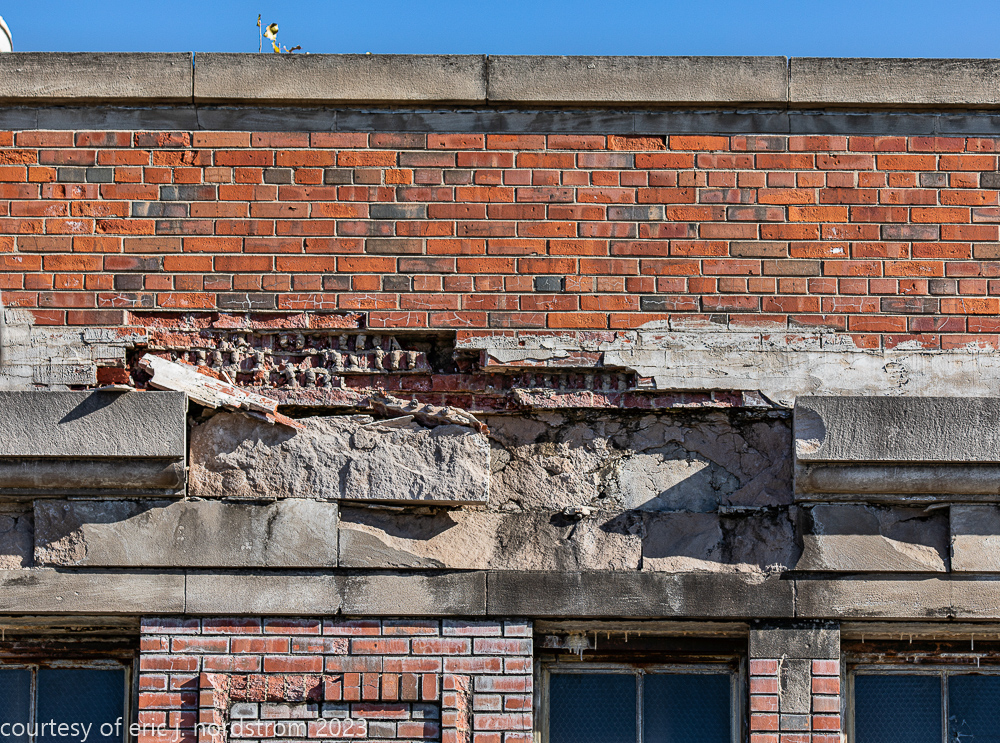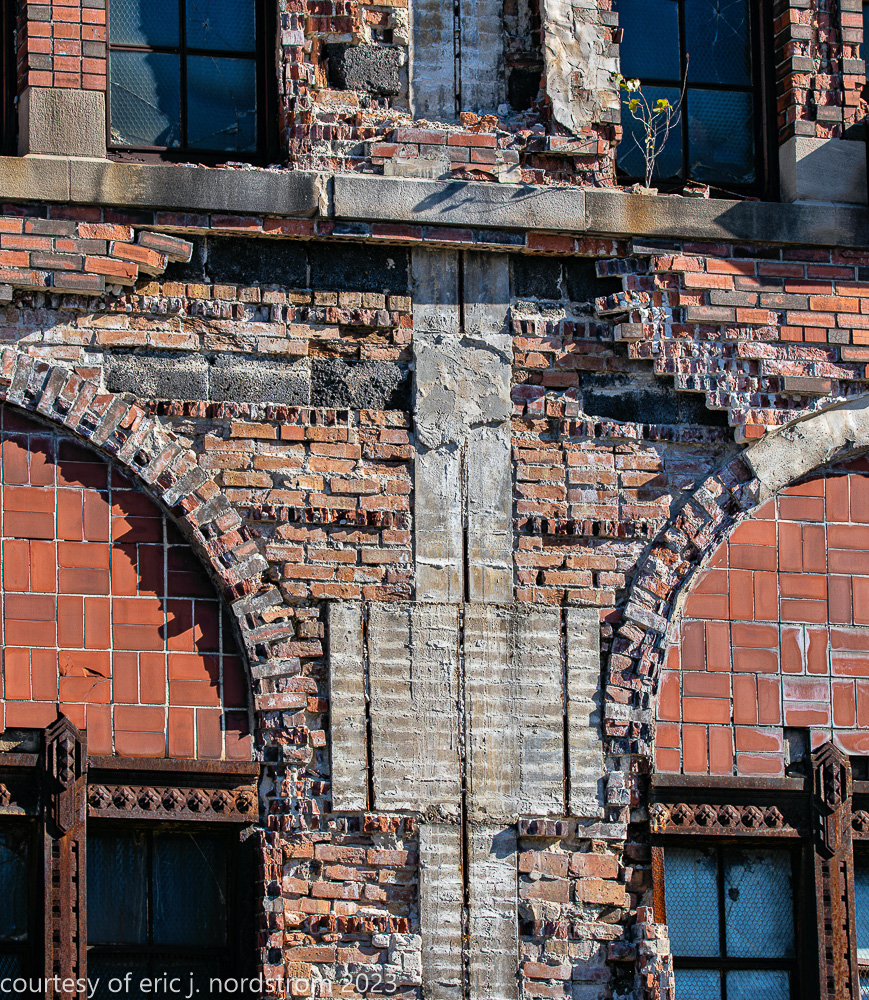 several of holst’s signature patterned tile lunettes found a new home on the sidewalk below. one of the bedford limestone rondels with lightbulb fell from the building and disappeared since my last visit in fall of 2020.
