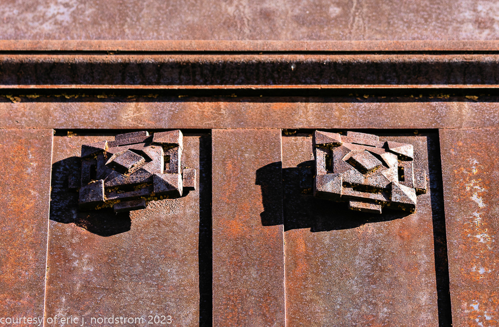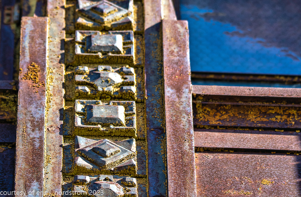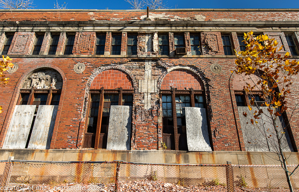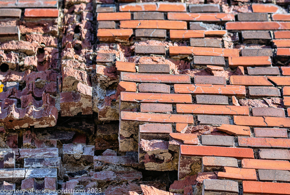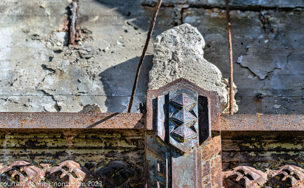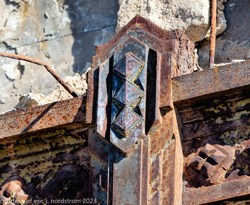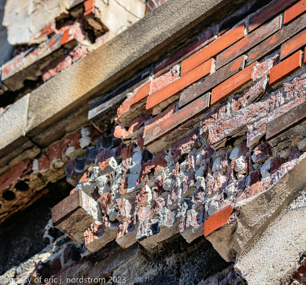several of holst’s signature patterned tile lunettes found a new home on the sidewalk below. one of the bedford limestone rondels with lightbulb fell from the building and disappeared since my last visit in fall of 2020.