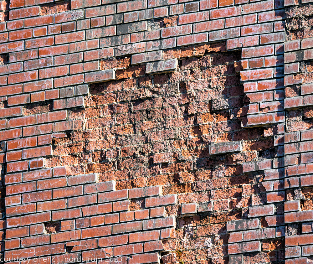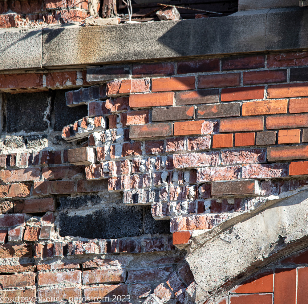moisture penetration deeply embedded in exterior walls has caused the facade to buckle in some places. spalling of original face brick continues to spread far and wide.