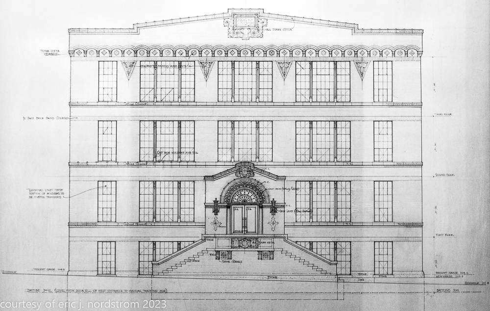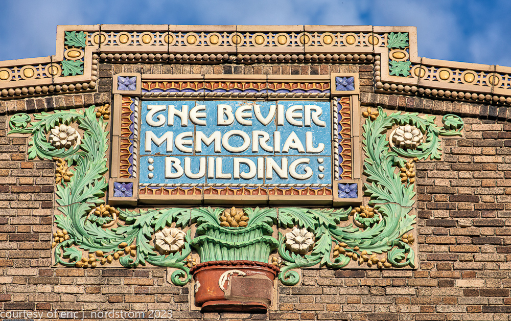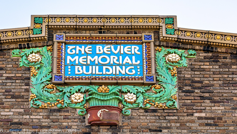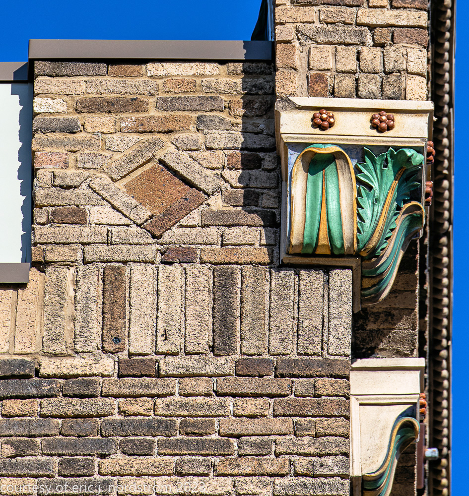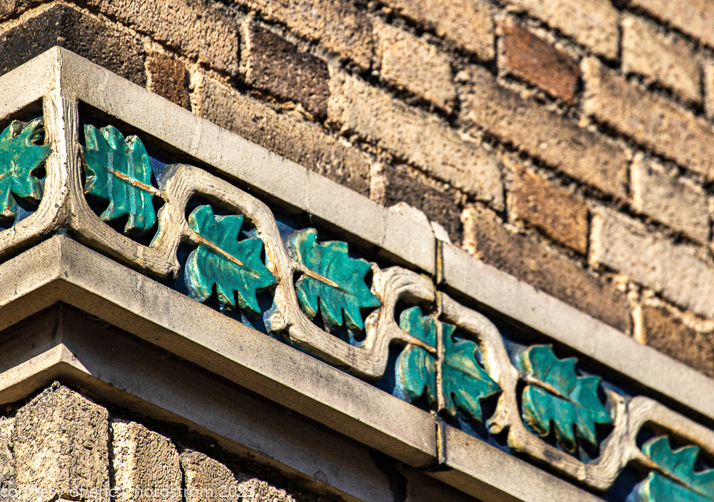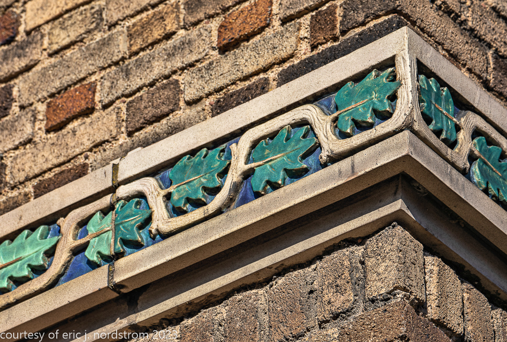 photographic study of claude bragdon-designed exterior polychromatic ornament on the three-and-a-half story bevier memorial building (1910), located at the corner of spring and s. washington streets, rochester, ny.