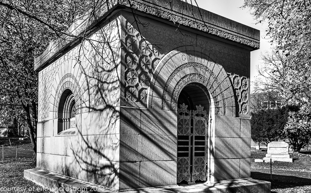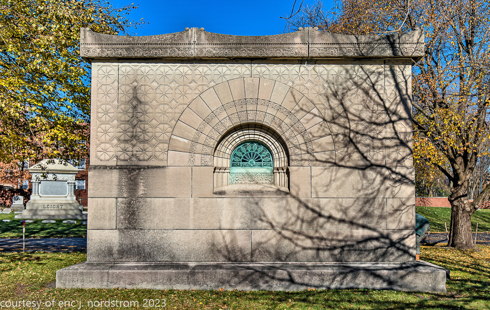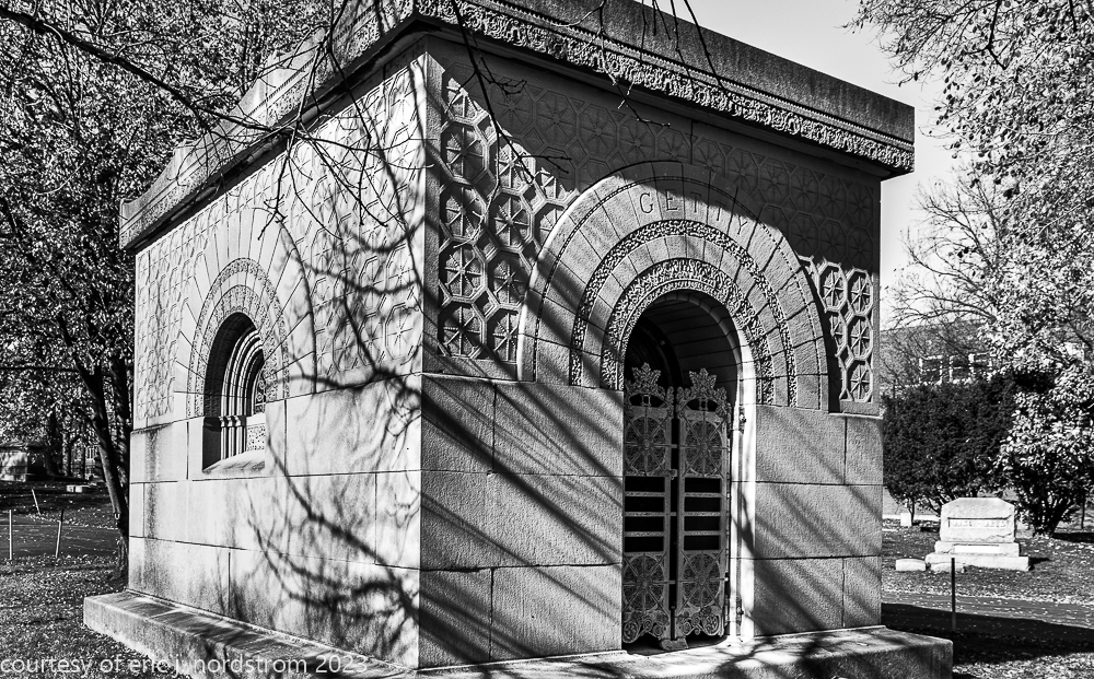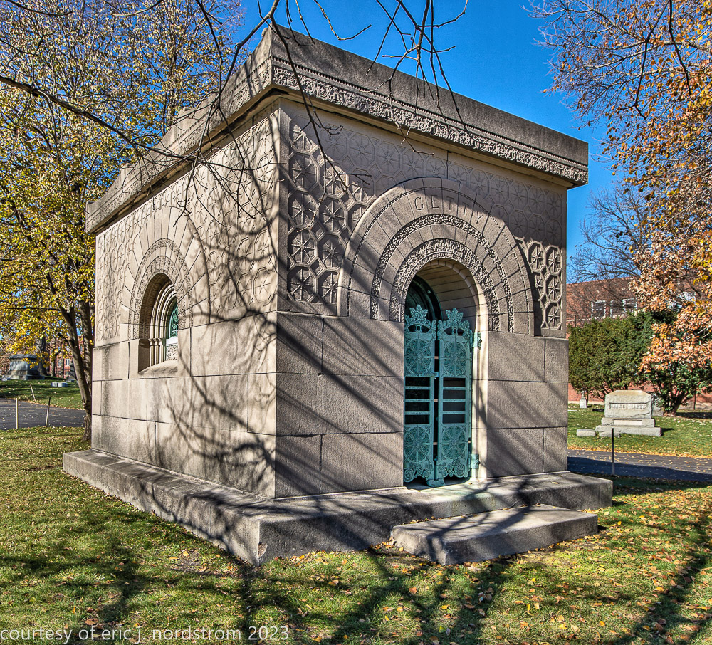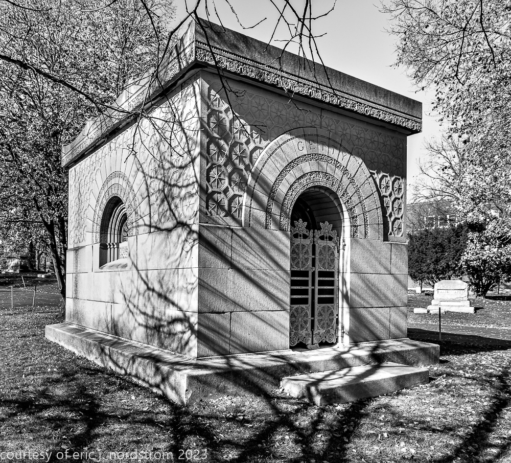 the indiana limestone mausoleum was completed in 1890. adler & sullivan, architects. frank lloyd wright considered the tomb one of sullivan’s greatest works.