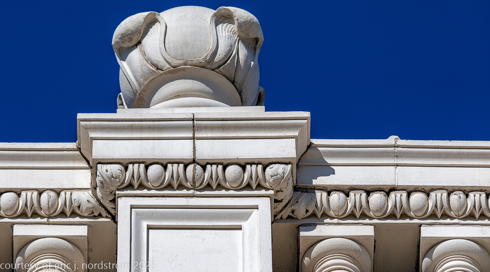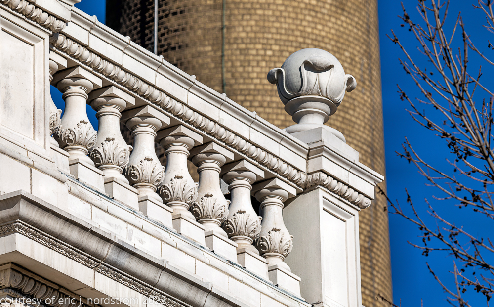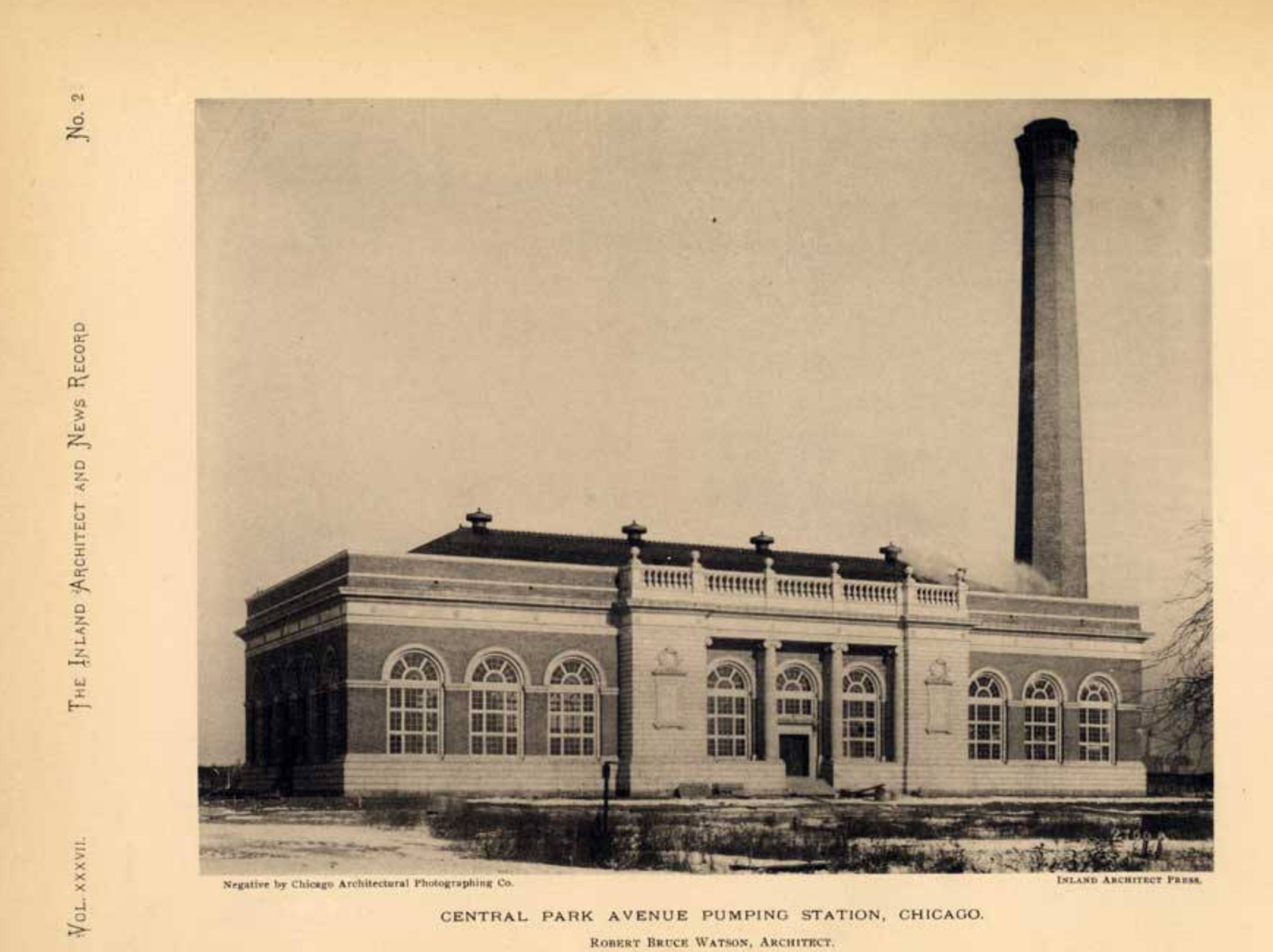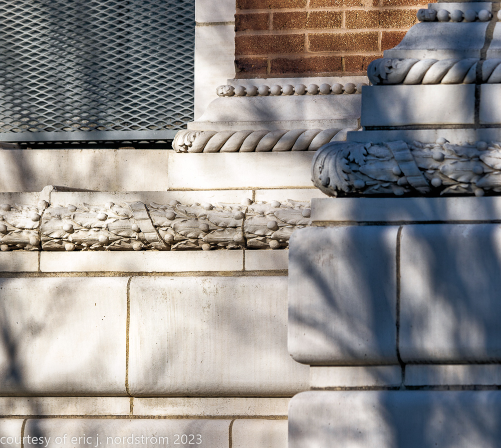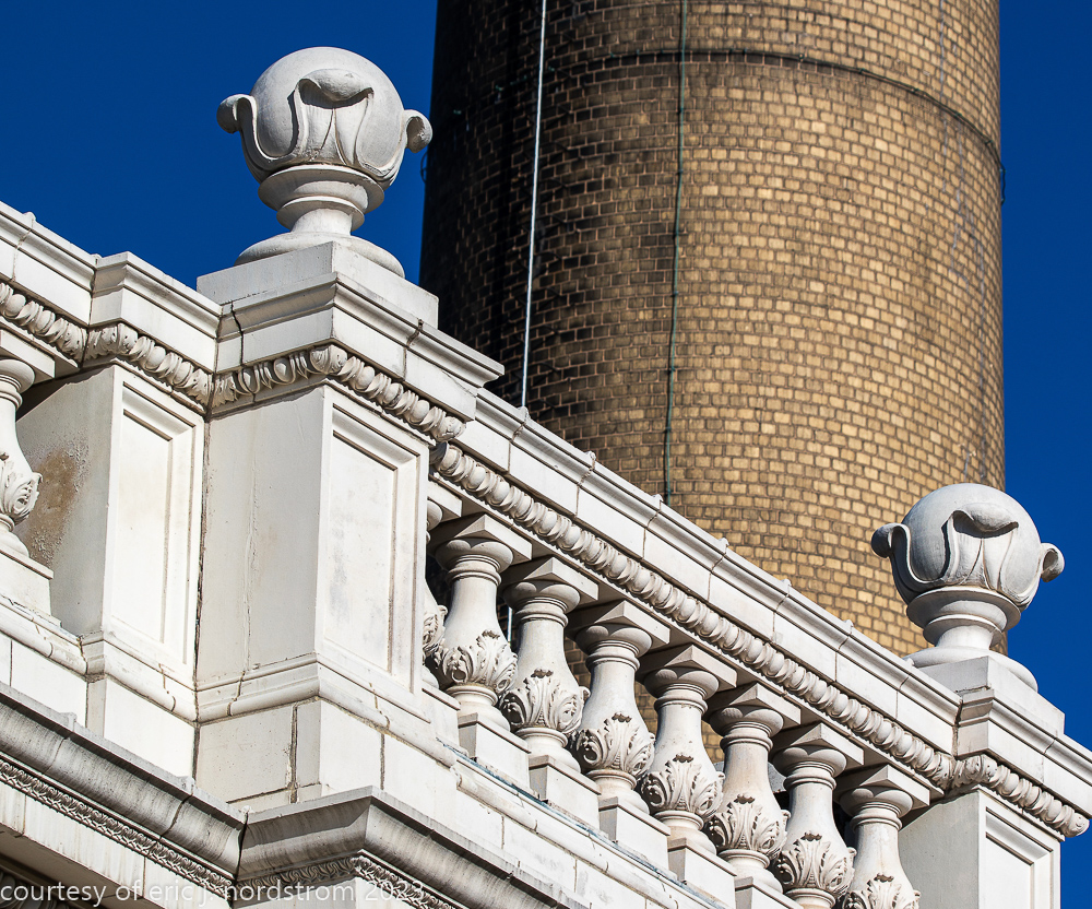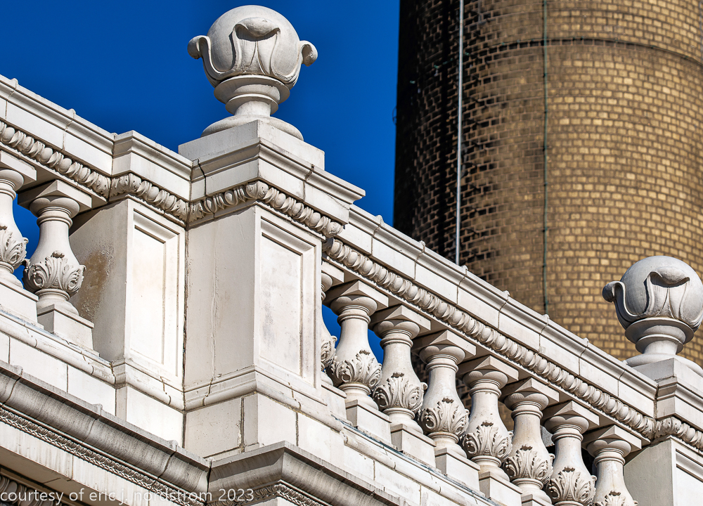 series of detailed images of robert bruce watson’s white glazed terra cotta ornament on the imposing 1897 central park avenue pumping station, located on the west side of chicago, ills.