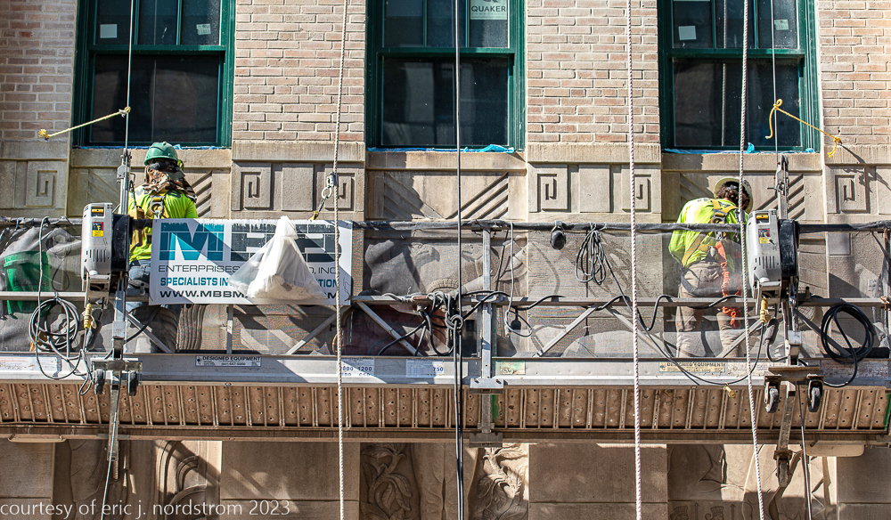 MEN AT WORK: RESTORATION OF VICTOR LAWSON YMCA MEMORIAL BUILDING (1931) BEDFORD LIMESTONE FACADE WELL UNDERWAY