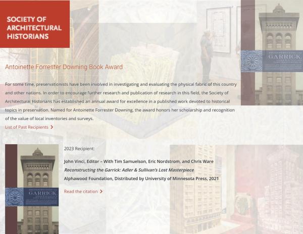 RECONSTRUCTING THE GARRICK: ADLER & SULLIVAN’S LOST MASTERPIECE, WINS SAH’S 2023 ANTOINETTE FORRESTER DOWNING BOOK AWARD