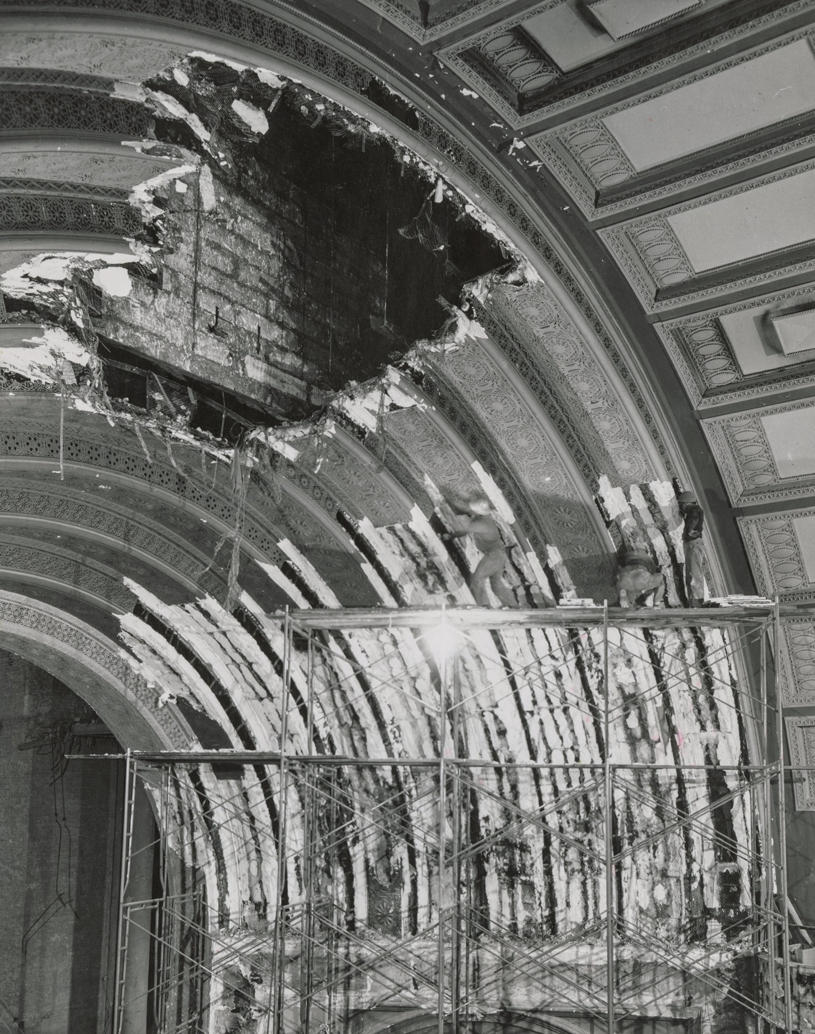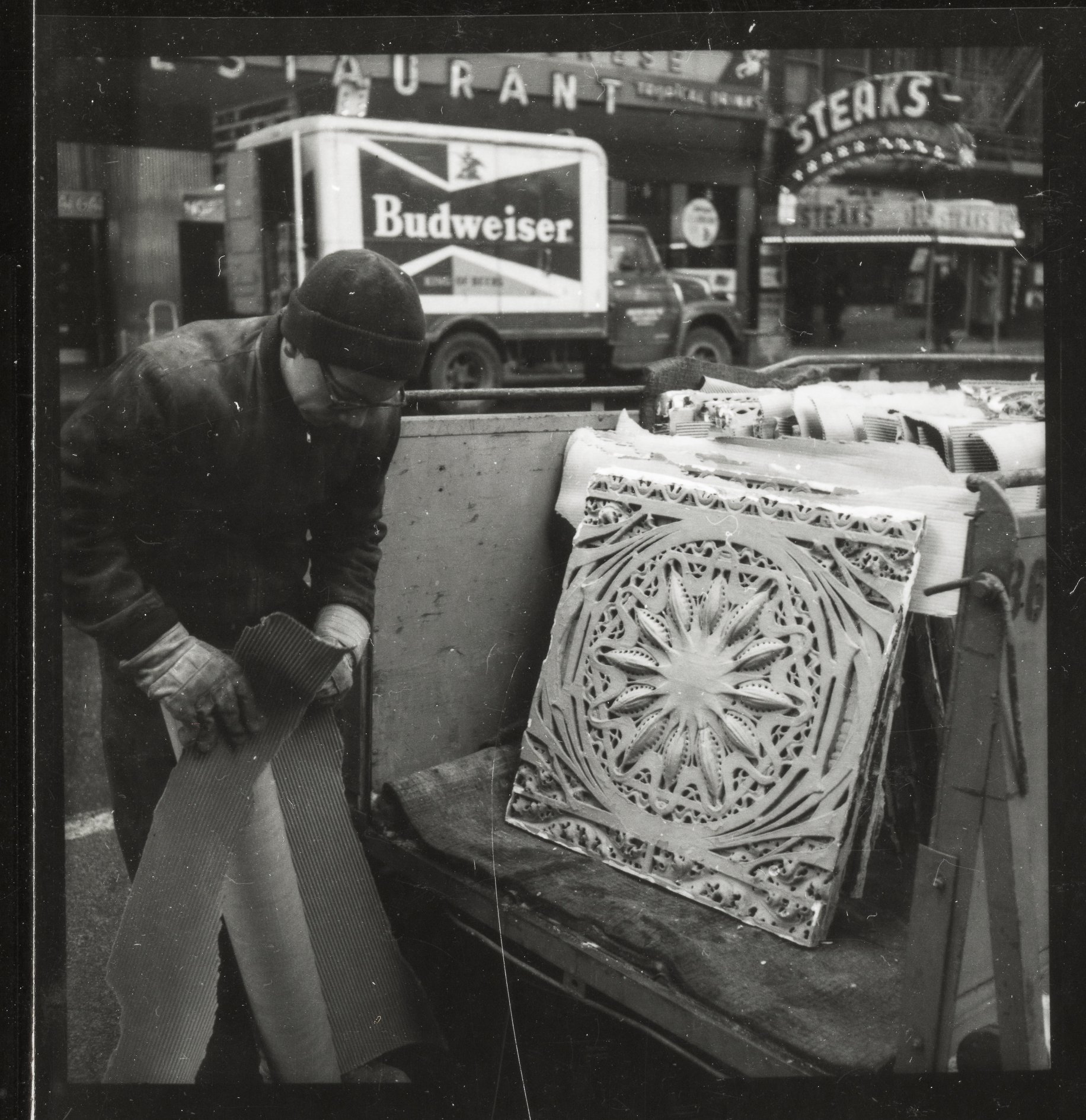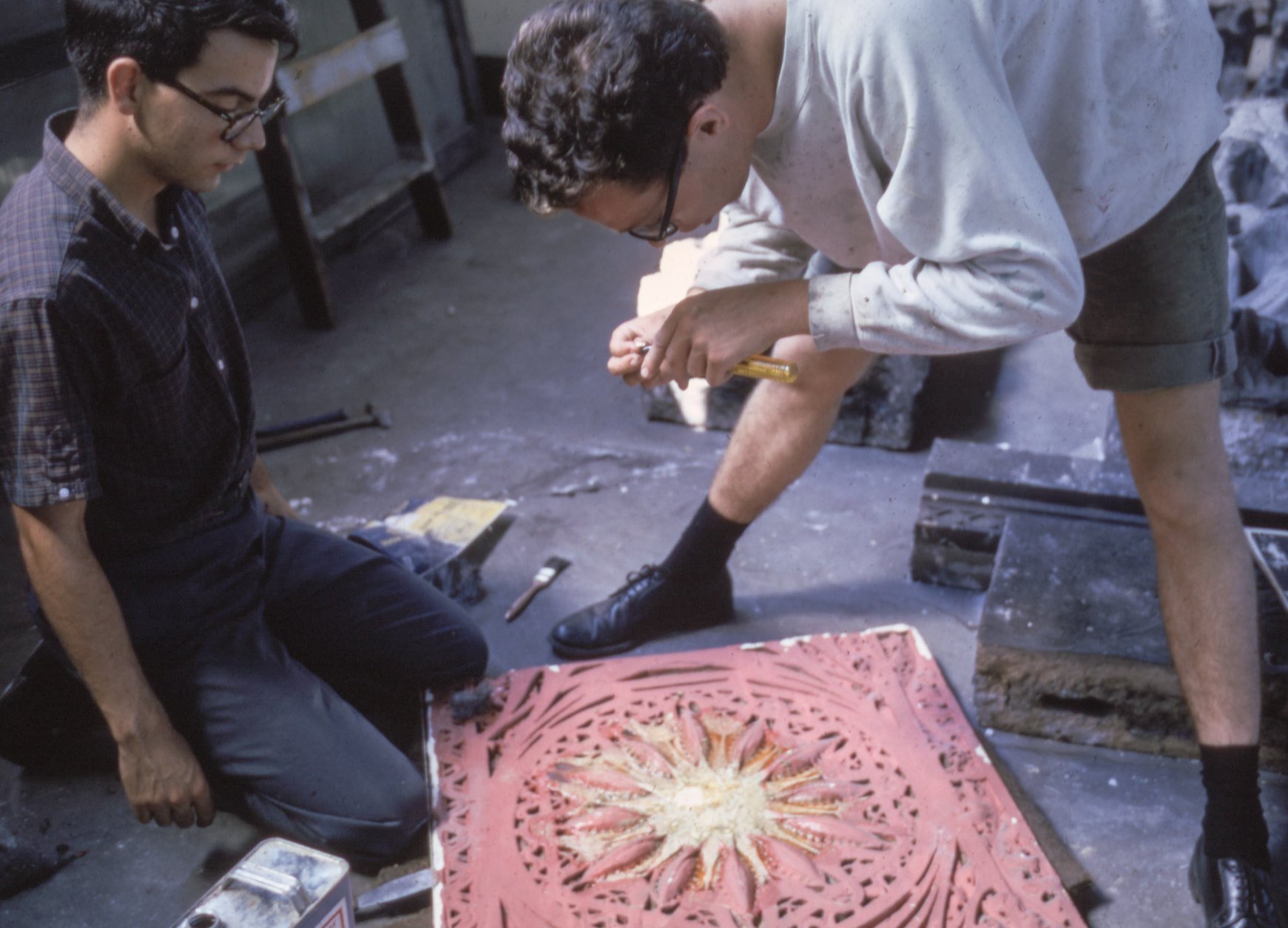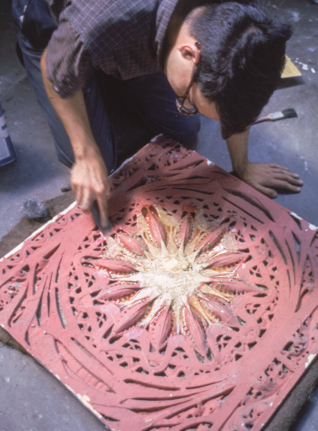 the louis h. sullivan and frank l. wright-designed ornamental plaster within the auditorium of adler and sullivan’s garrick theater (1892) was painted hideous colors around the time it was converted into a television studio in 1951. one such example – a star-pod panel – from the proscenium vault was recently acquired by the bldg. 51 museum collection this week.