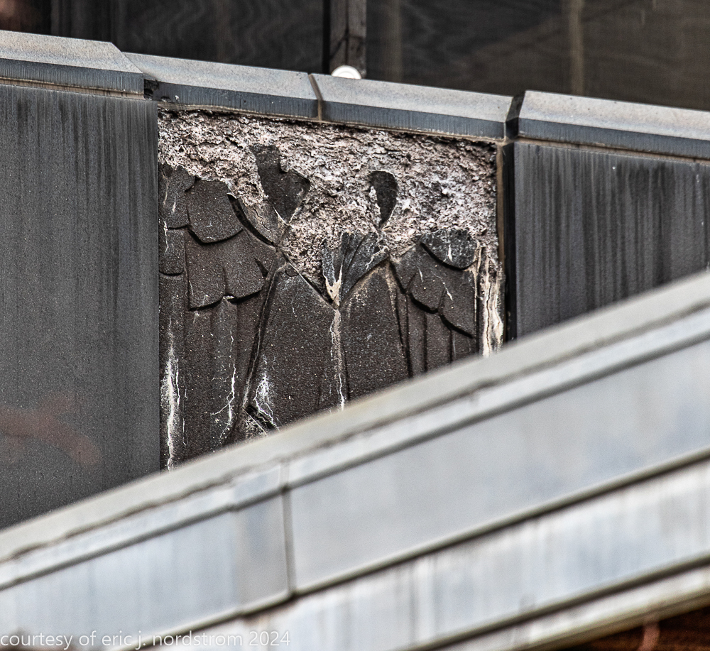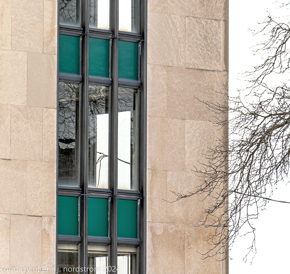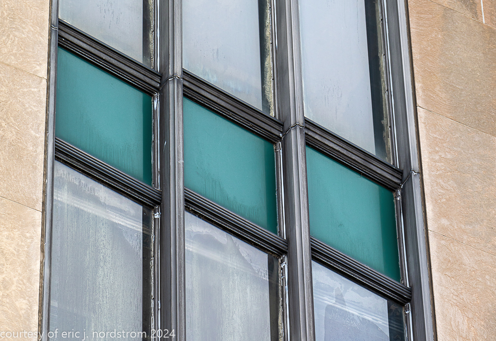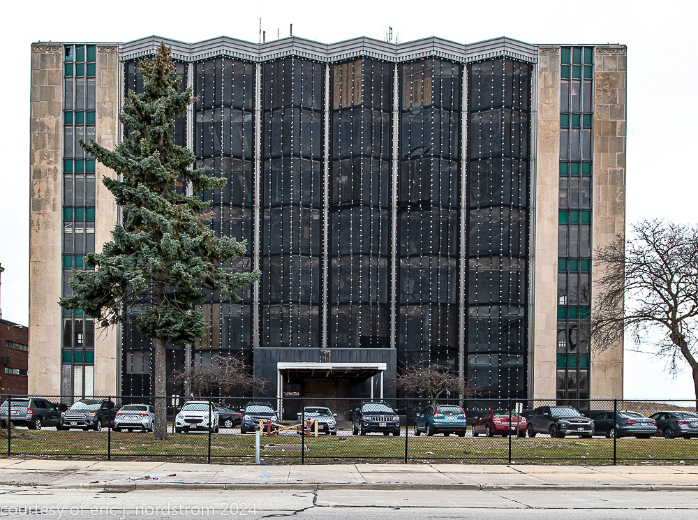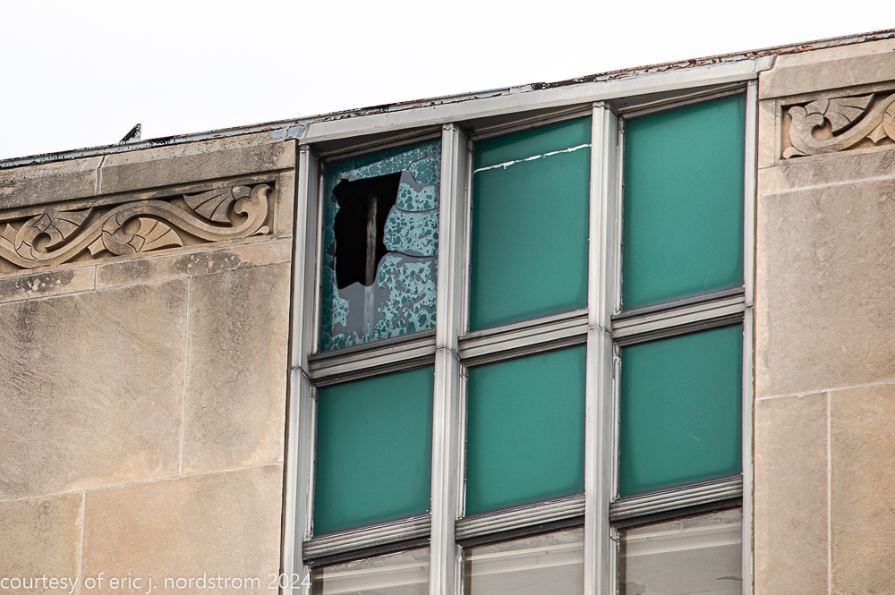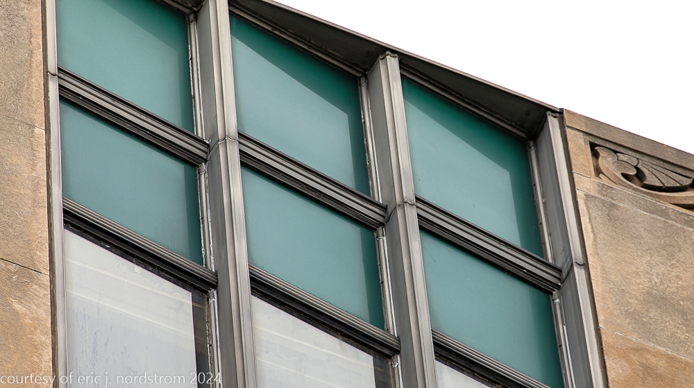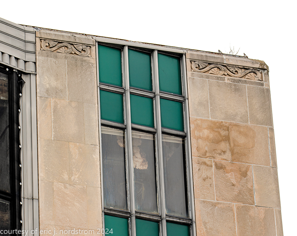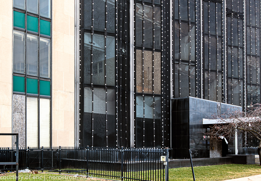 sadly, the abandoned building has spent the latter half of its lifetime largely forgotten, neglected and rapidly falling into both exterior and interior disrepair without much notice or concern. ken hedrich of hedrich and blessing documented the building shortly after it was comppleted. thankfully, the images ken took of the interior with company’s logo embedded and illuminated in the terrazzo floor, along with the custom-designed brushed aluminum and steel furniture offers us an incredibly important visual record of what was – a far cry from how the lobby appears today.