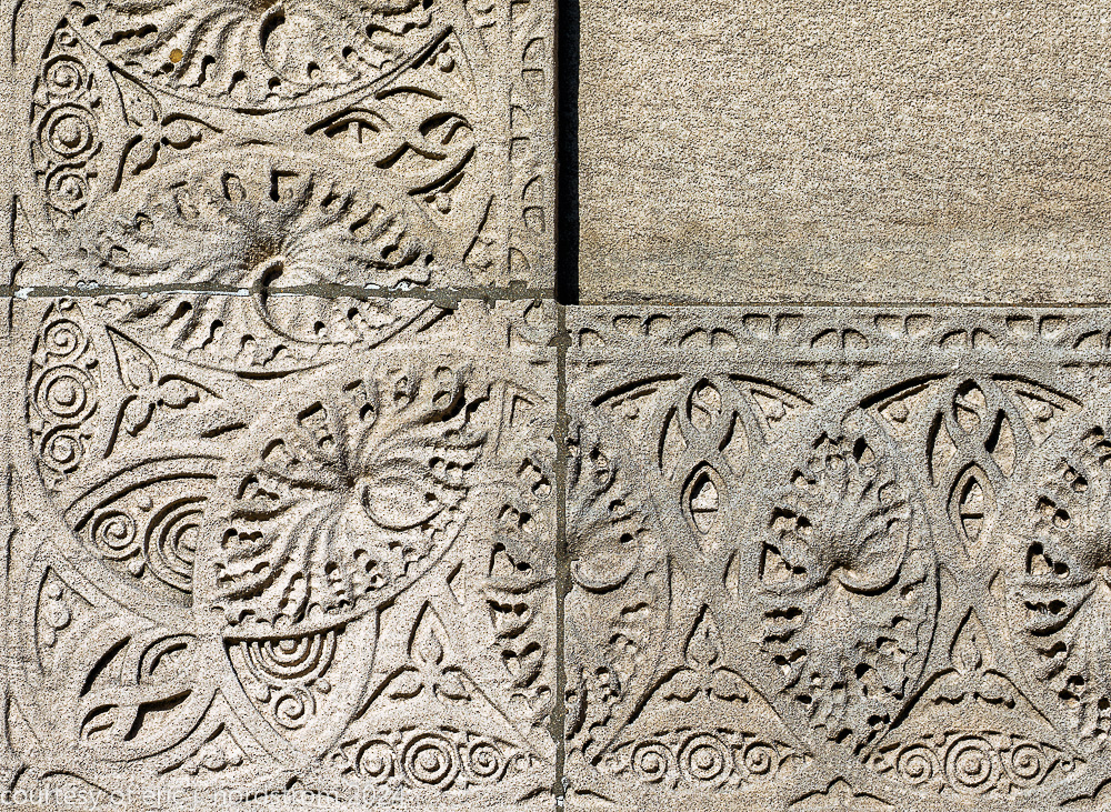 the tomb itself is a domed cubic building comprised of exterior buff Indiana limestone with hand-carved ornament designed by sullivan. the tomb’s entrance contains a double-leafed ornamental patinated bronze grill concealing inner double-doors.