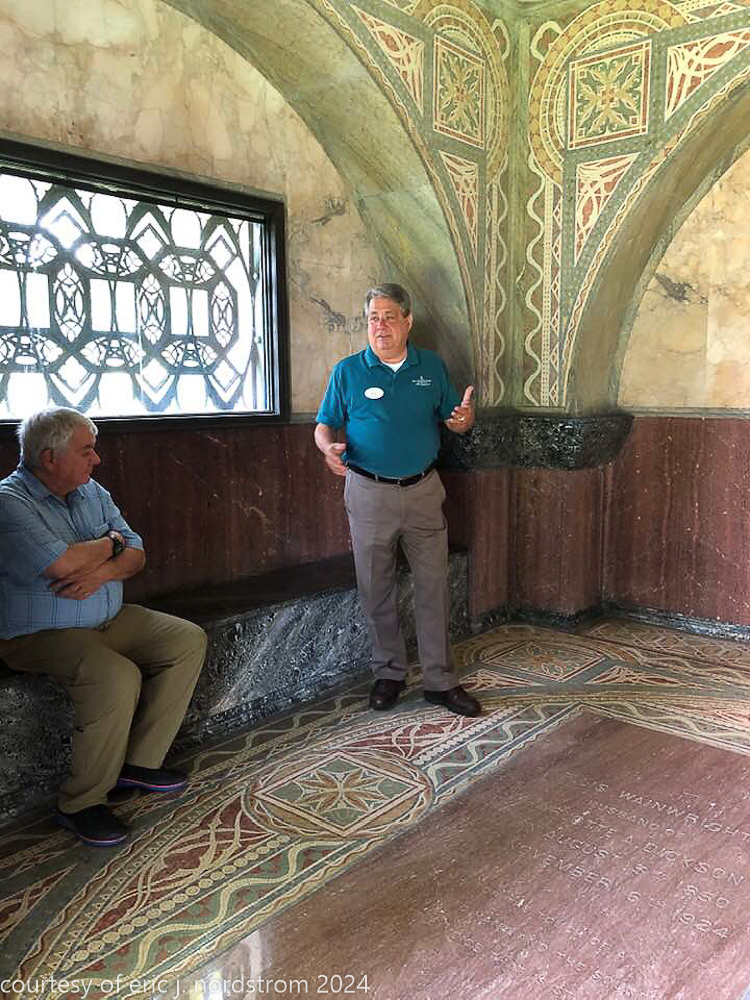the sides of the tomb contain recessed windows with ornamented bronze window guards. the tomb’s interior contains two burial slabs (for ellis and his wife) and a richly colored mosaic floor and domed ceiling. the wainwright tomb has been described as “the most sensitive and the most graceful of sullivan’s tombs” and as “one of sullivan’s masterpieces.”