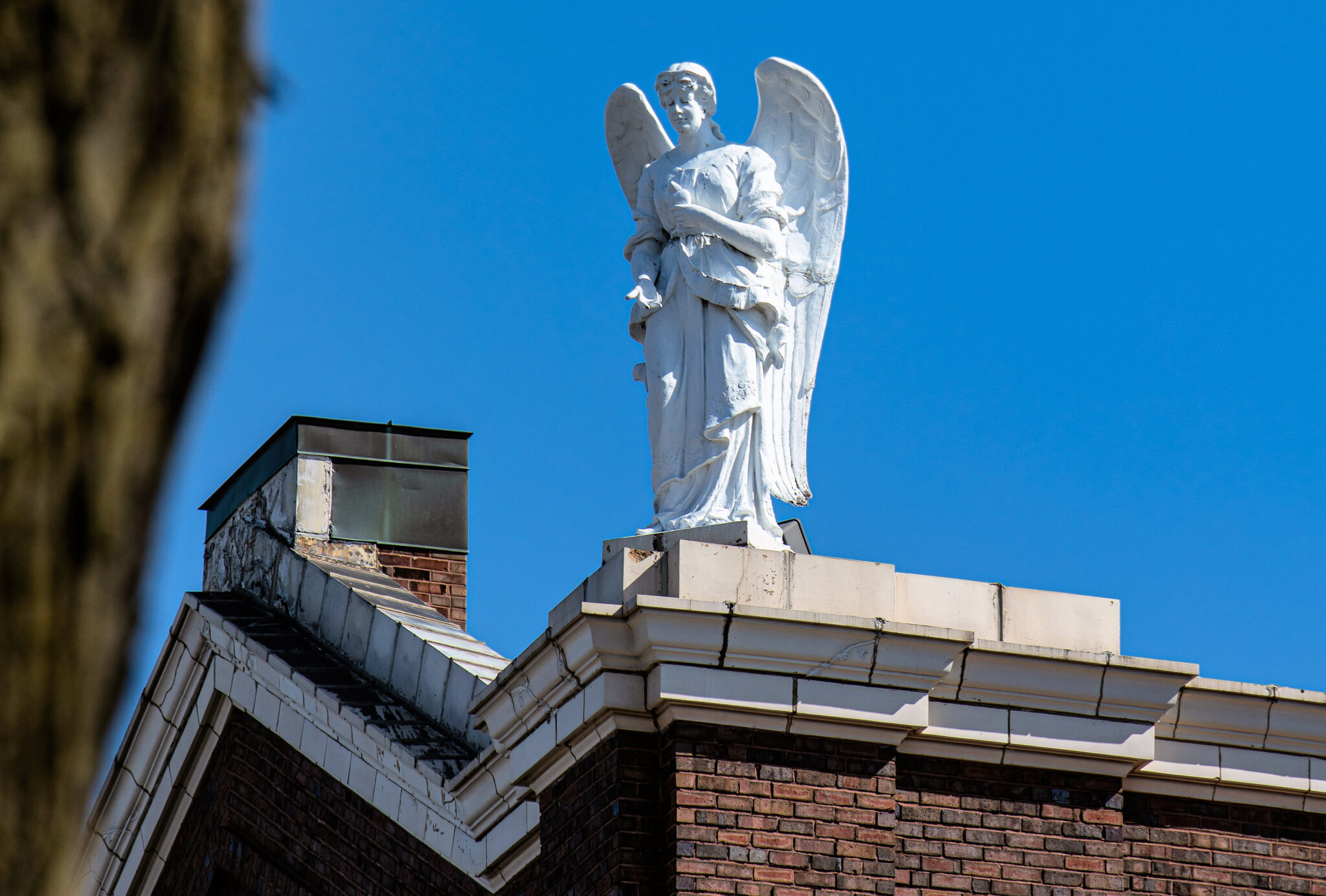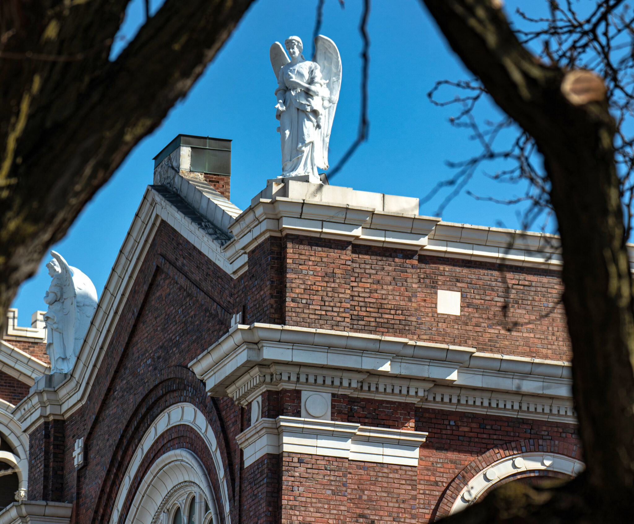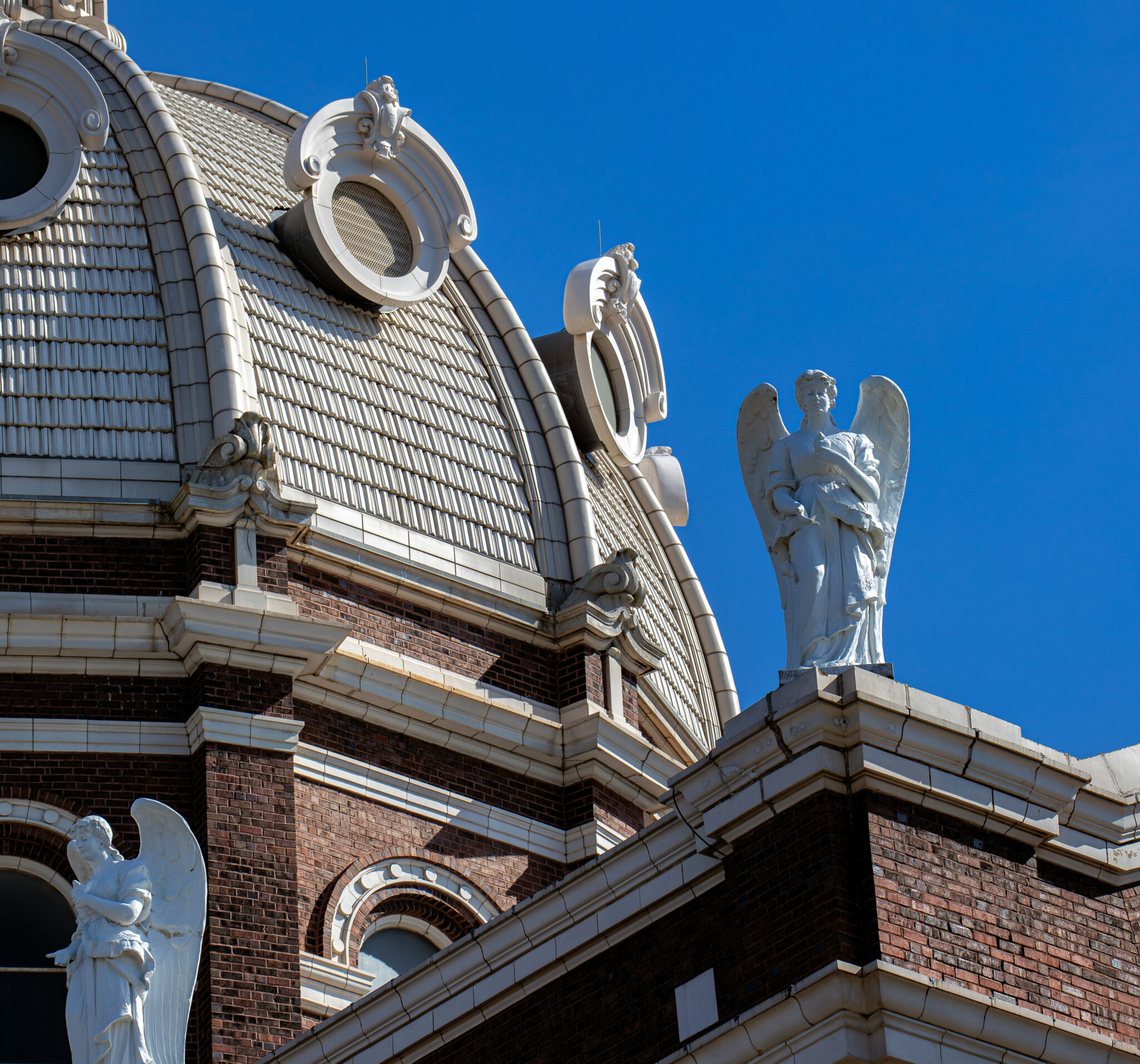 he admired the neighboring towering stamped tin full-figured winged angels along the roofline of st. mary of angels (1899) looking down on his building.