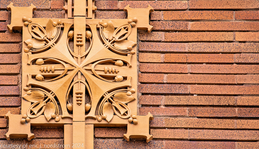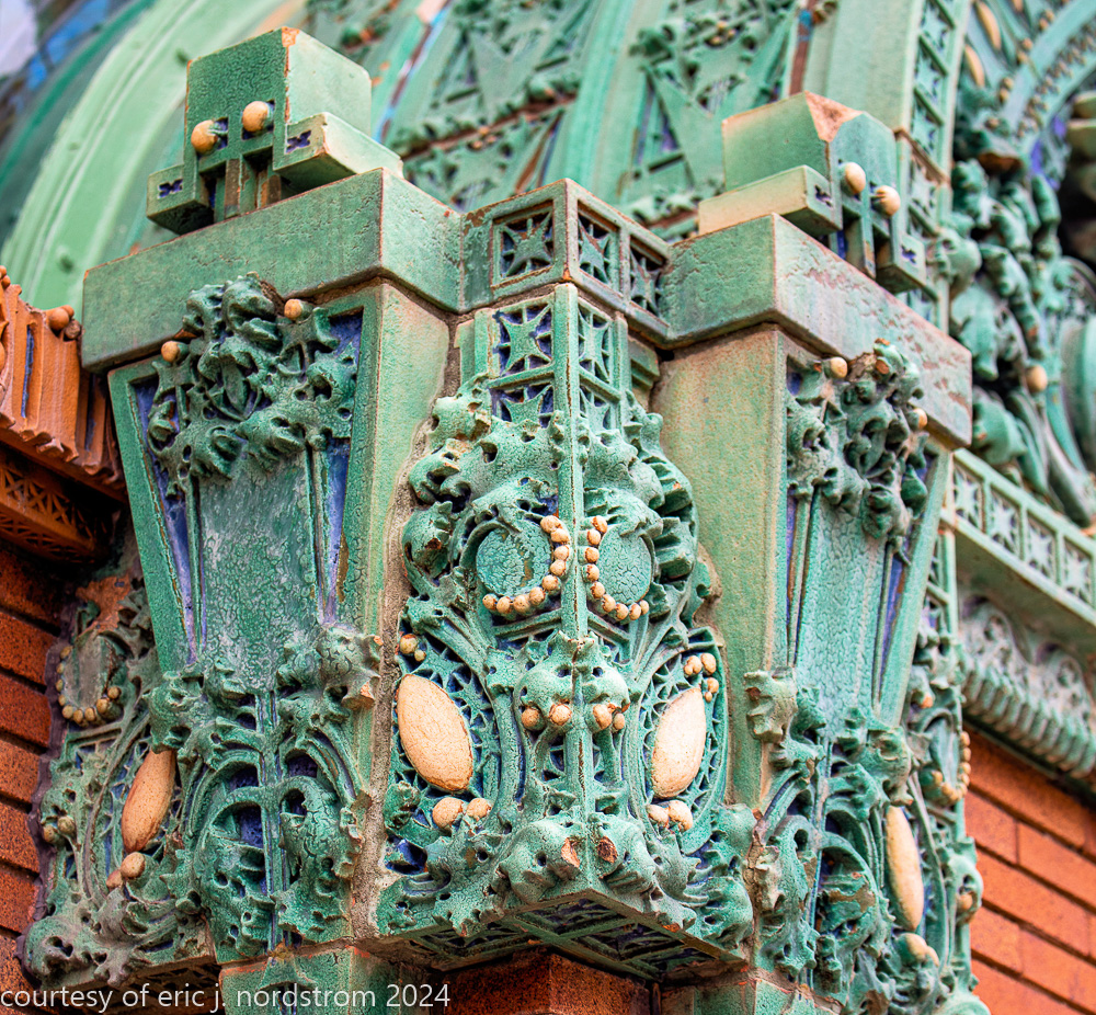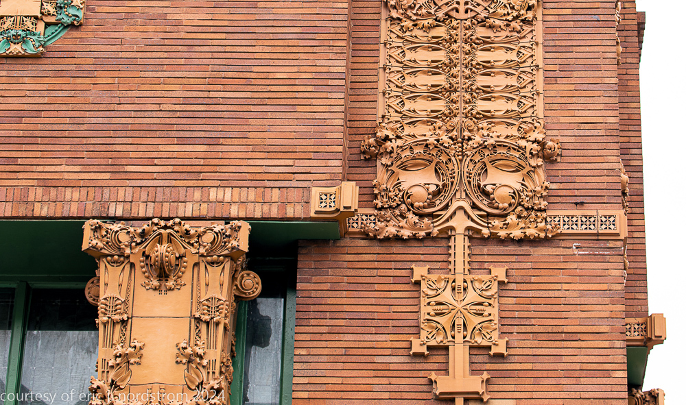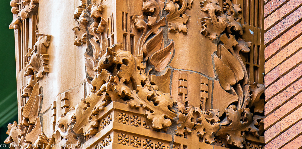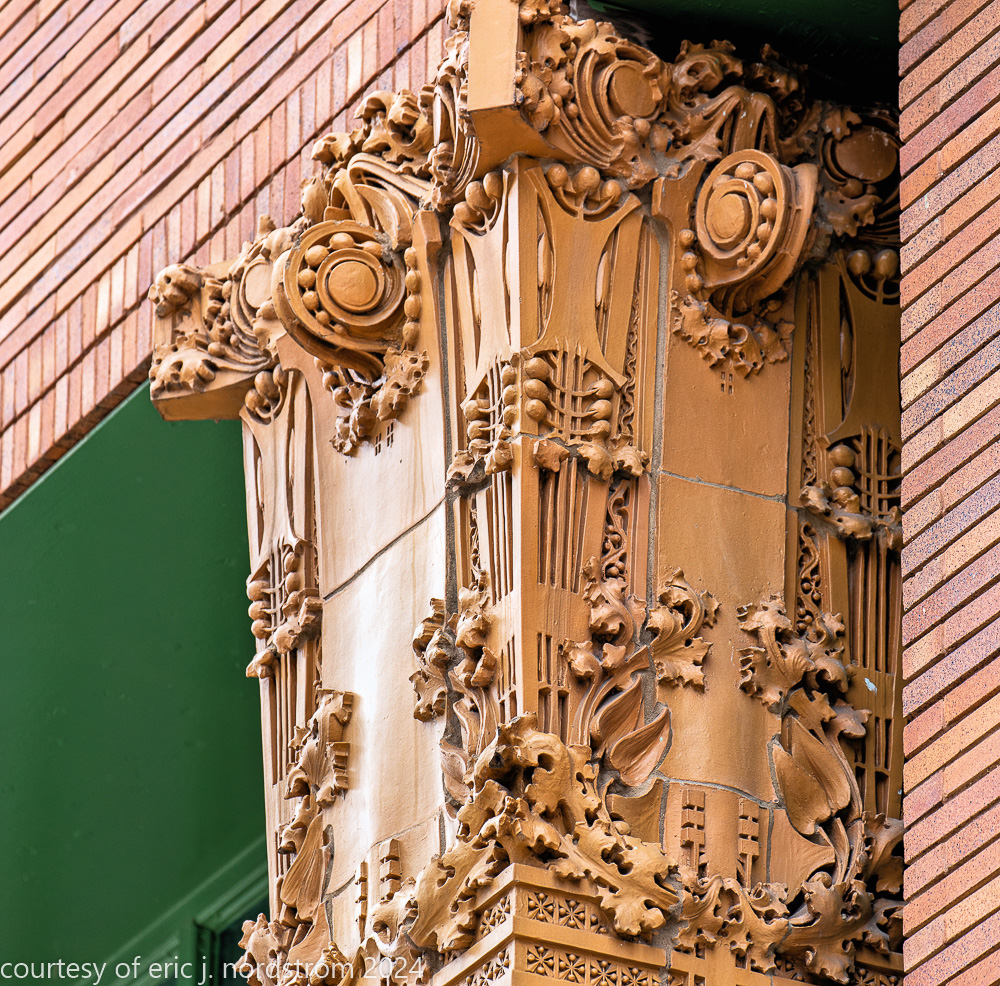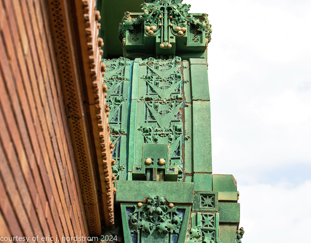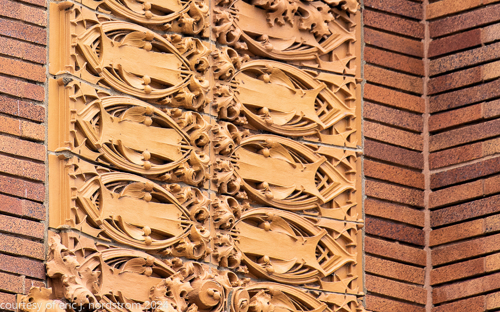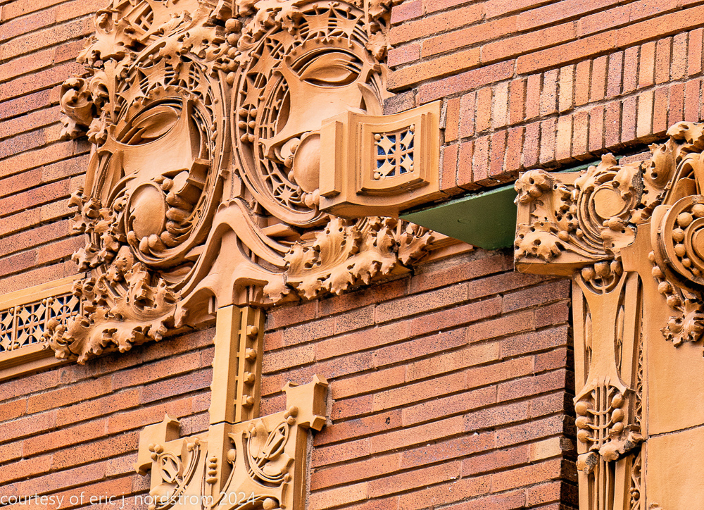 2024 exterior photographic survery of terra cotta ornament on purcell, feick, and elmslie’s merchants national bank