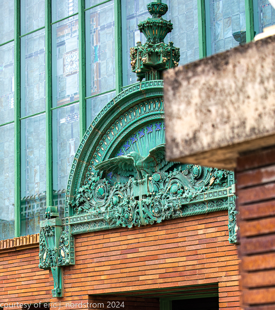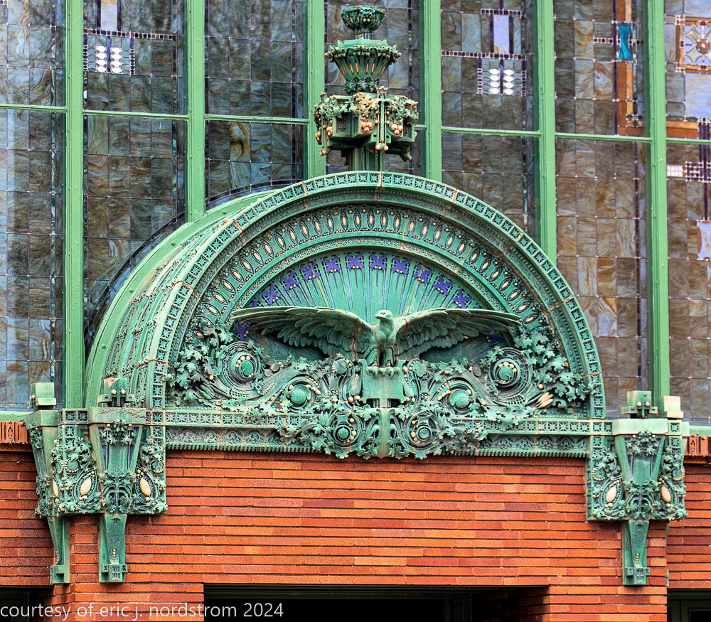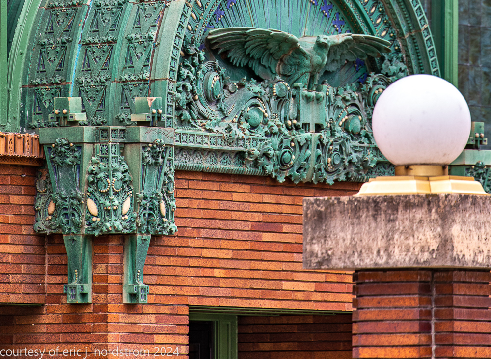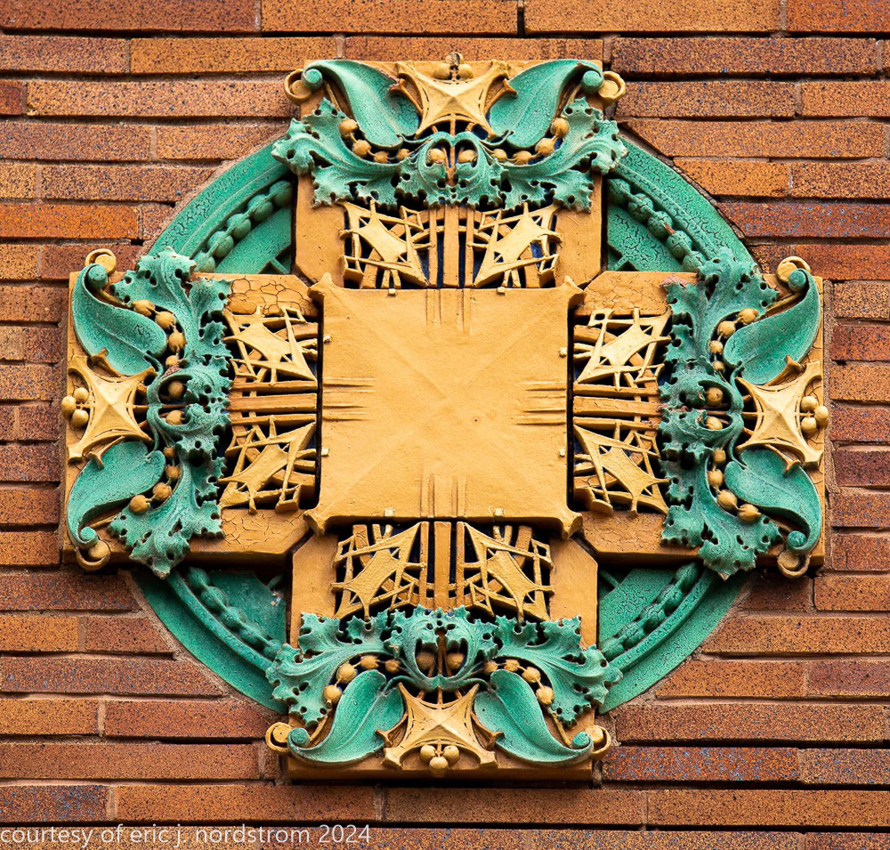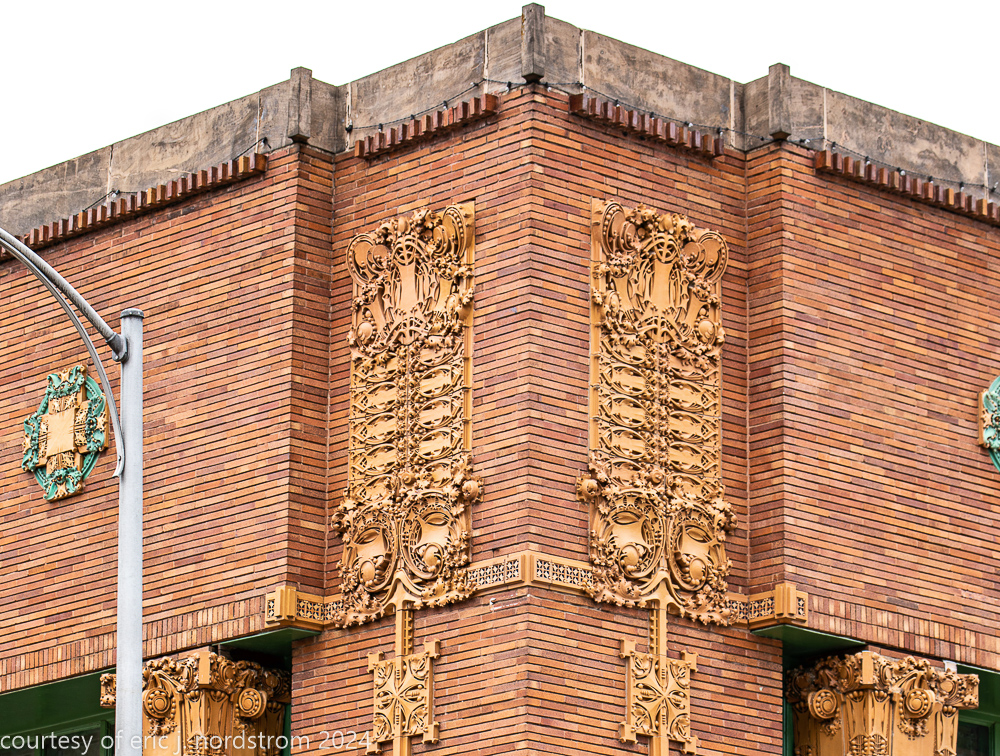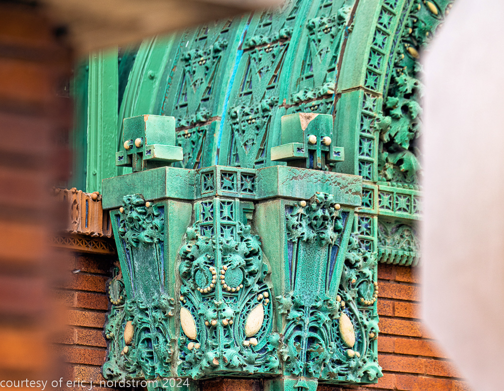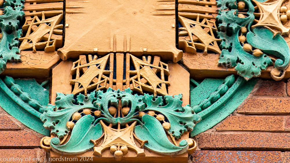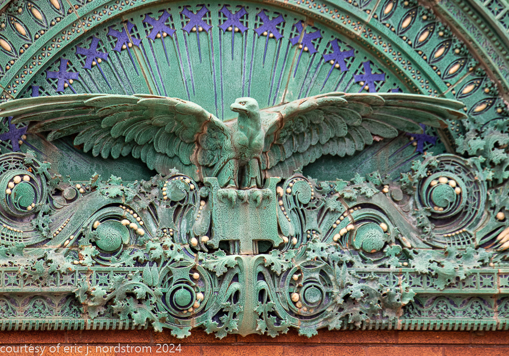 2024 exterior photographic survery of terra cotta ornament on purcell, feick, and elmslie’s merchants national bank