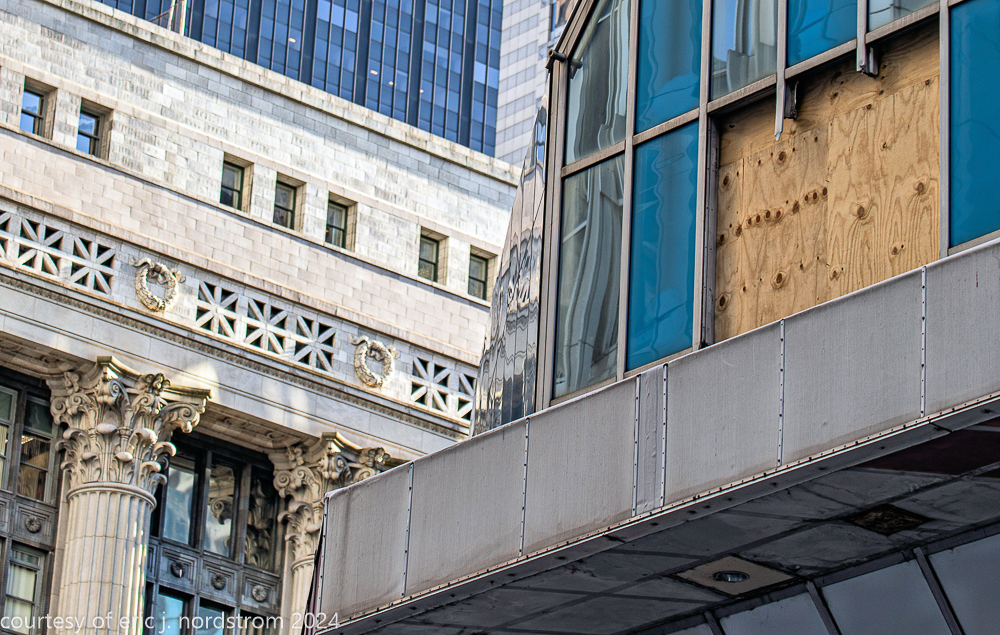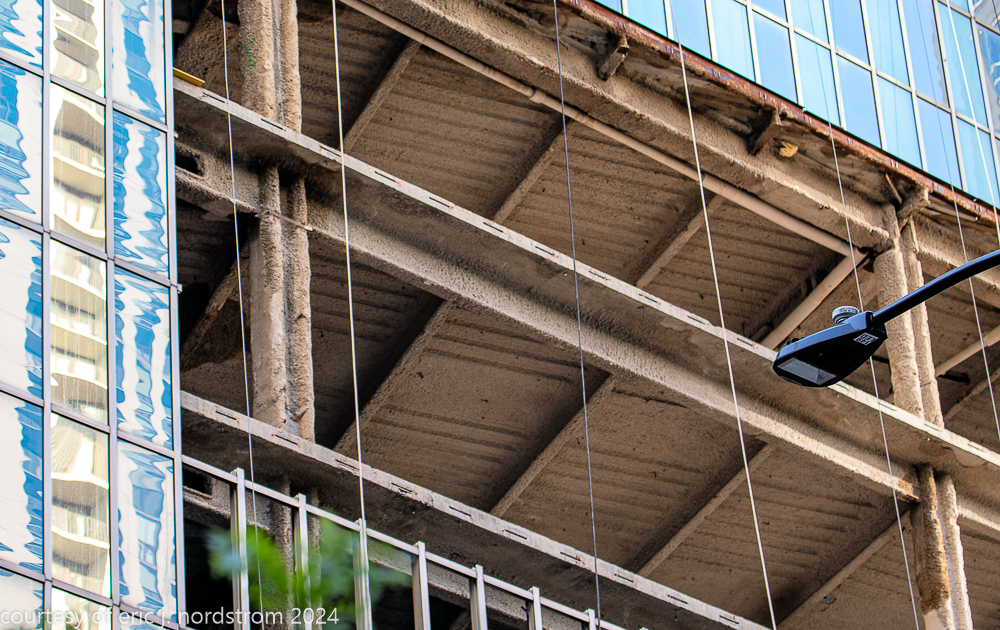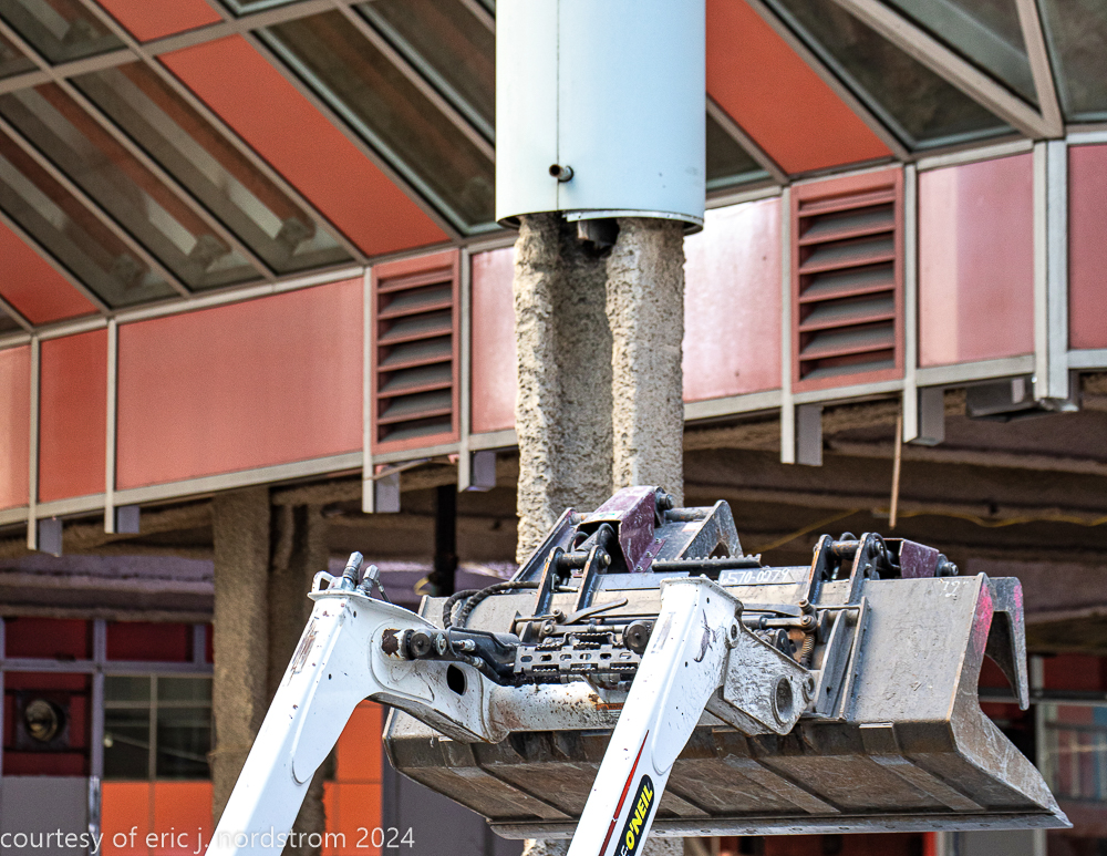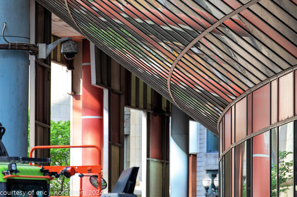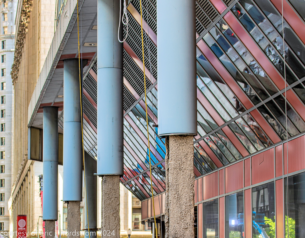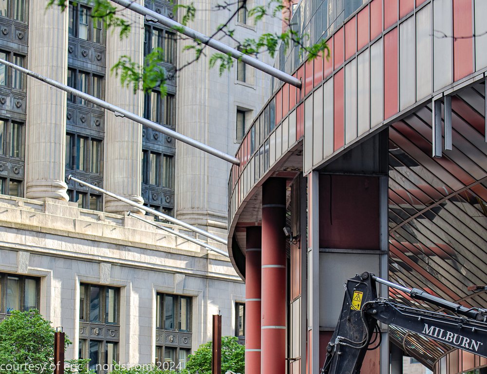 transformation of thompson center gains momentum as more and more glass modules and aluminum mullions are plucked from the curtain wall, exposing the building’s structural components for the first time since its completion in 1983.