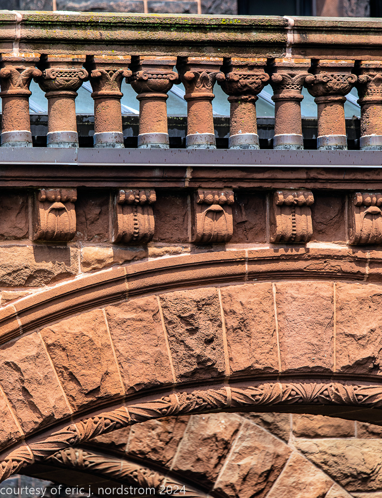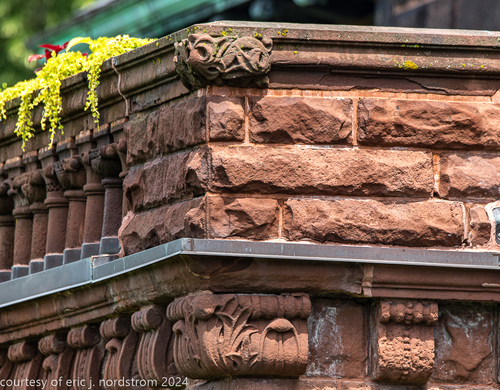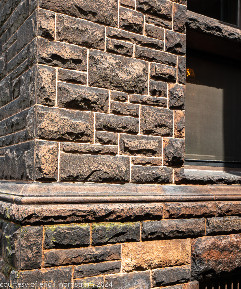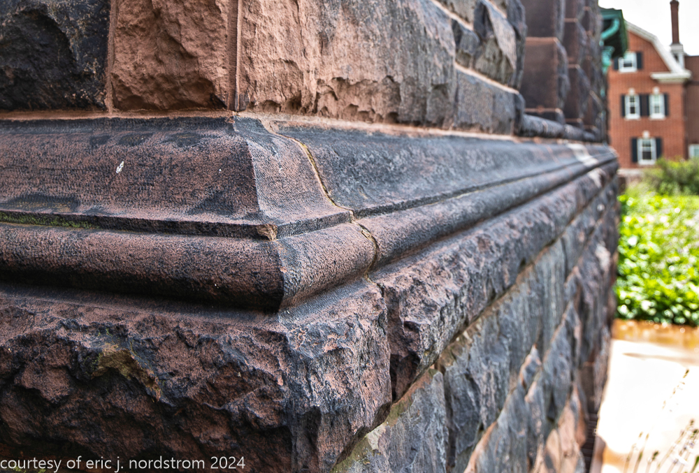 the exterior consists of a locally sourced limestone foundation, ground level granite, and massachusetts brownstone (ie., dark red sandstone).