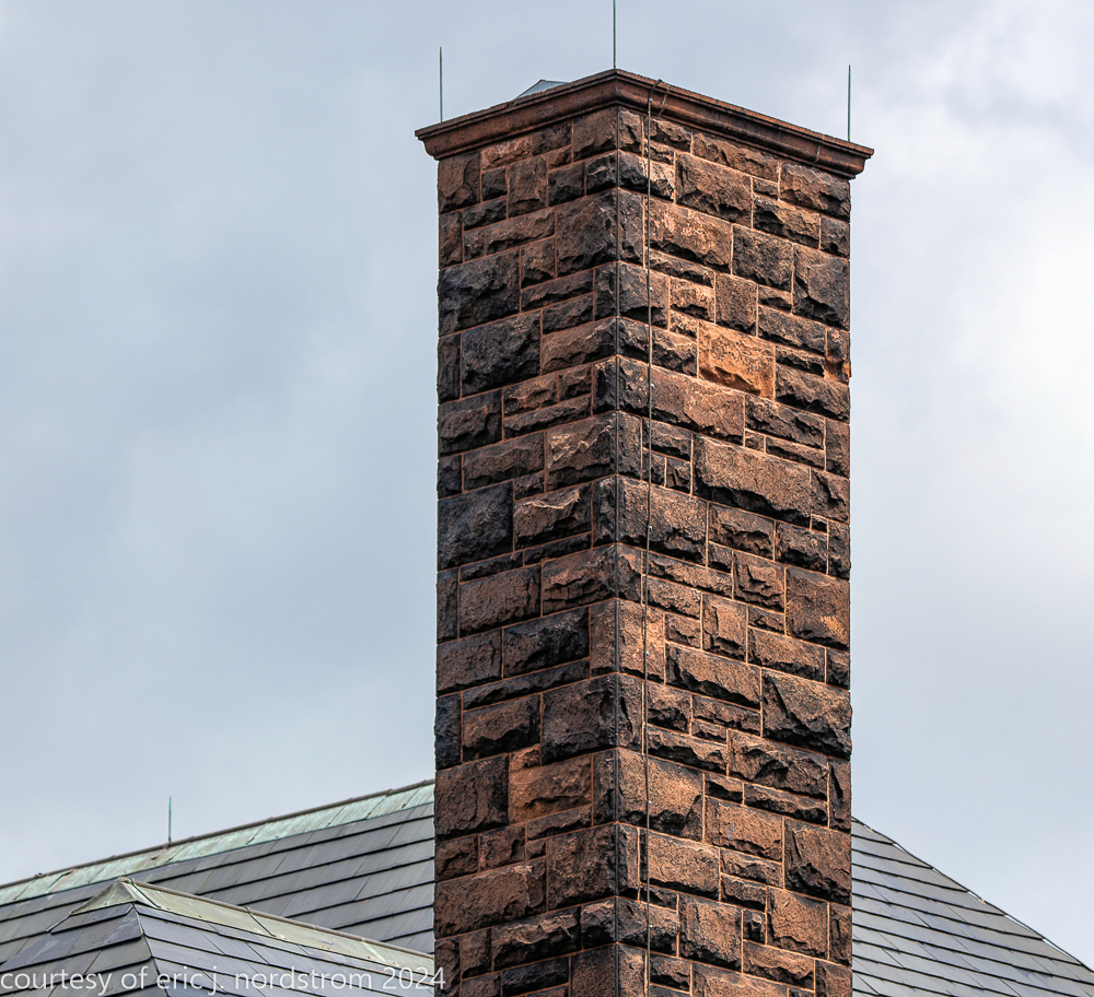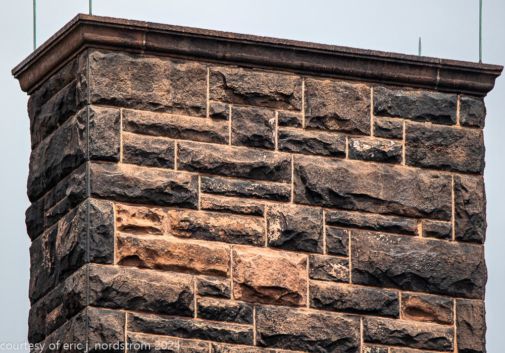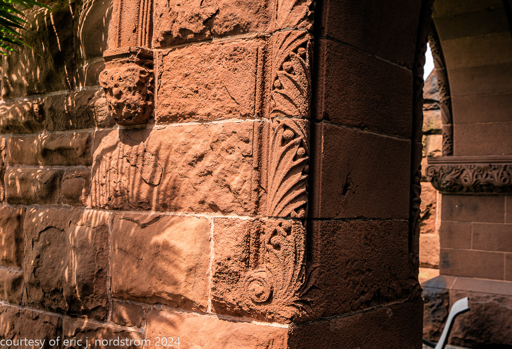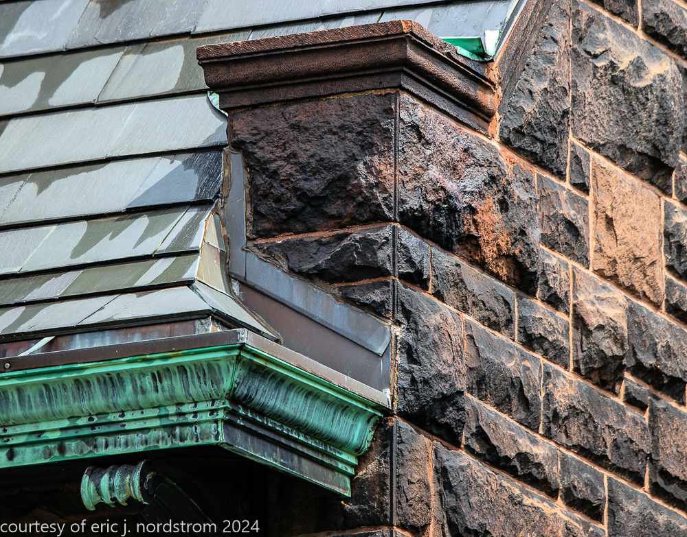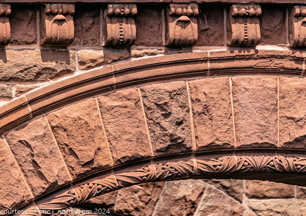 the exterior consists of a locally sourced limestone foundation, ground level granite, and massachusetts brownstone (ie., dark red sandstone).