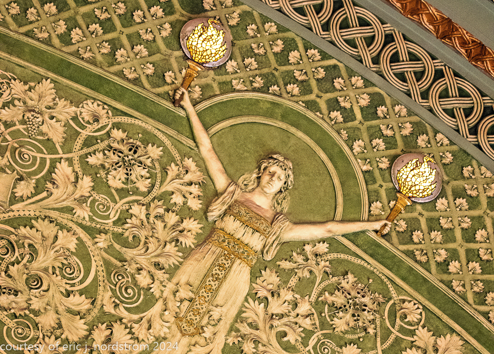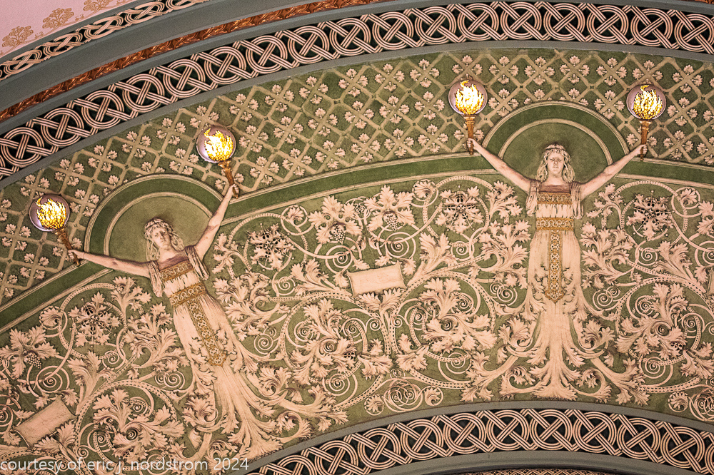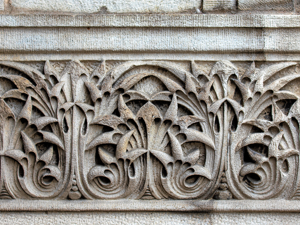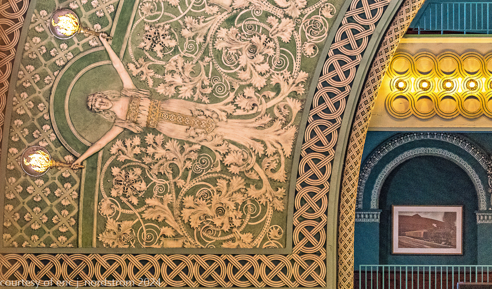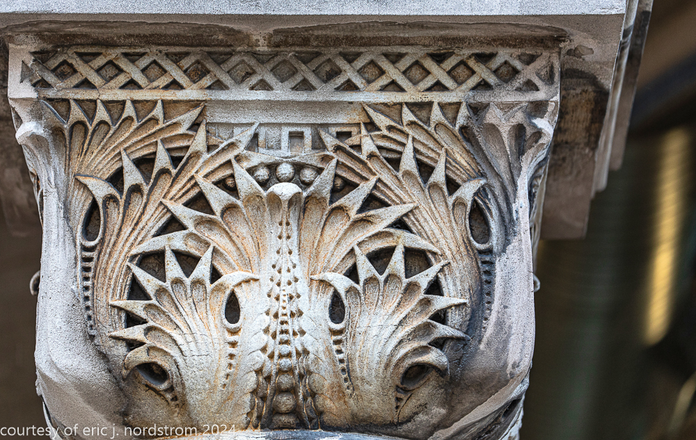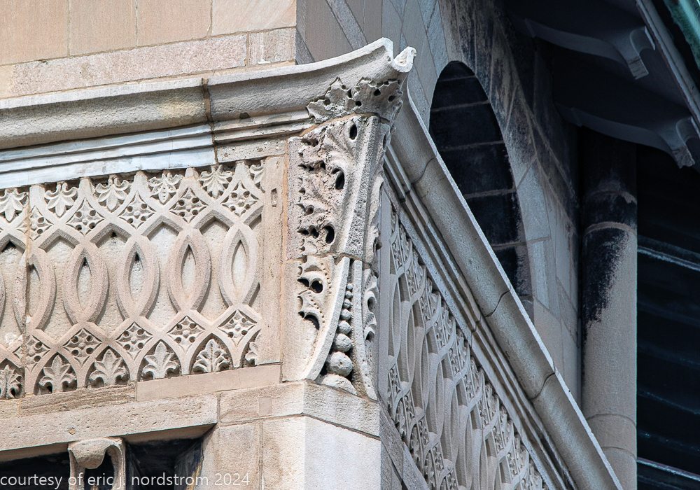 the station’s distinctive interior and exterior design program was handled by edmund cameron, who worked for h.h. richardson, where he oversaw construction of richardson’s glessner house (1887) and marshall field warehouse (1887-1930). he also greatly admired the work of harvey ellis and was well-versed in ellis’s architectural ornament.