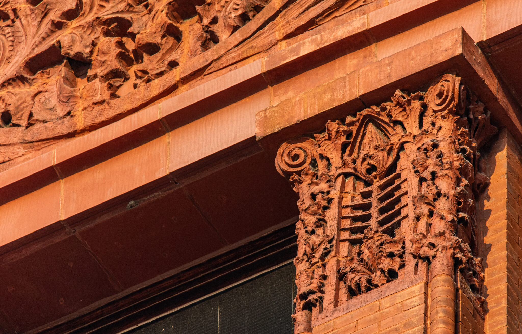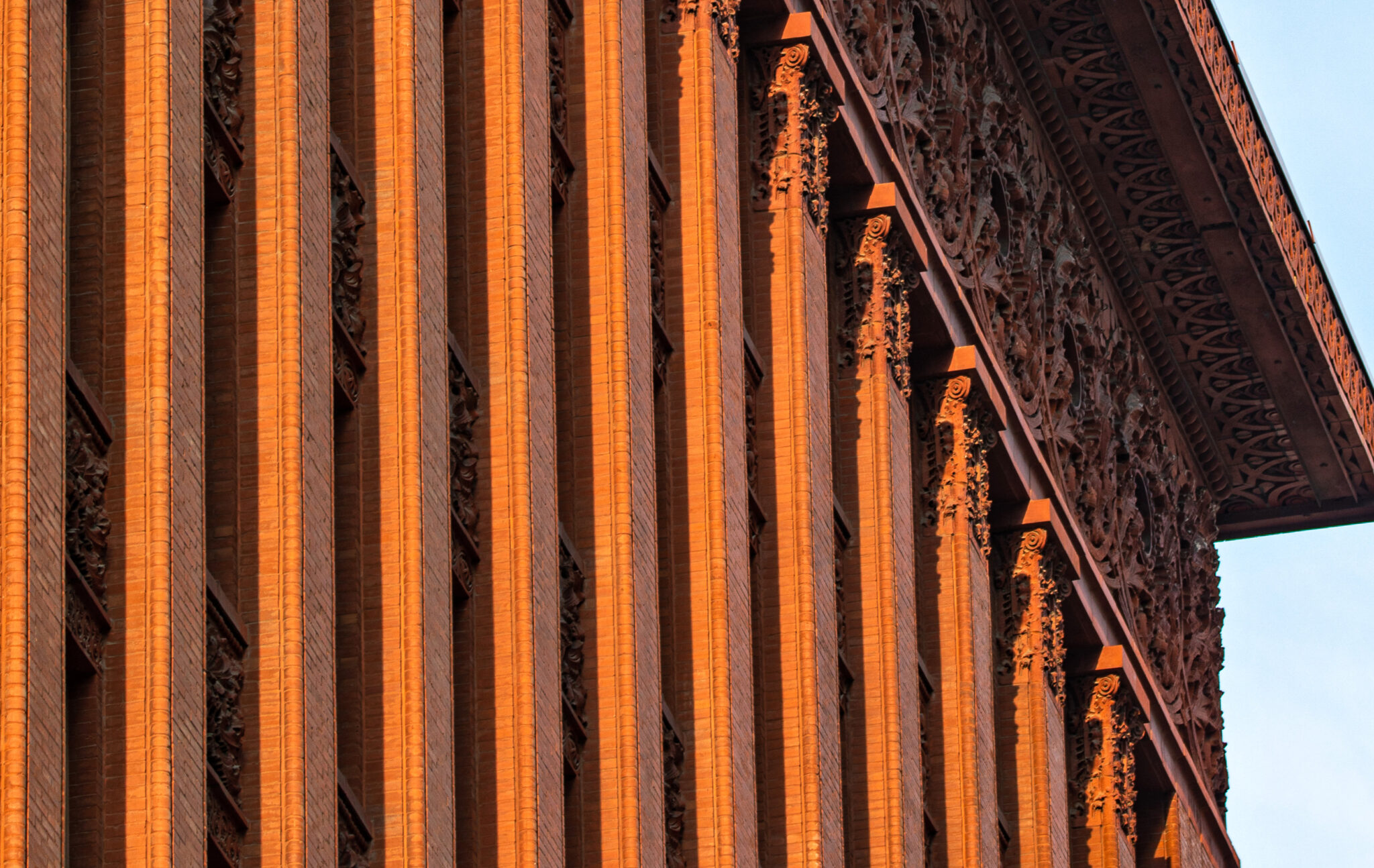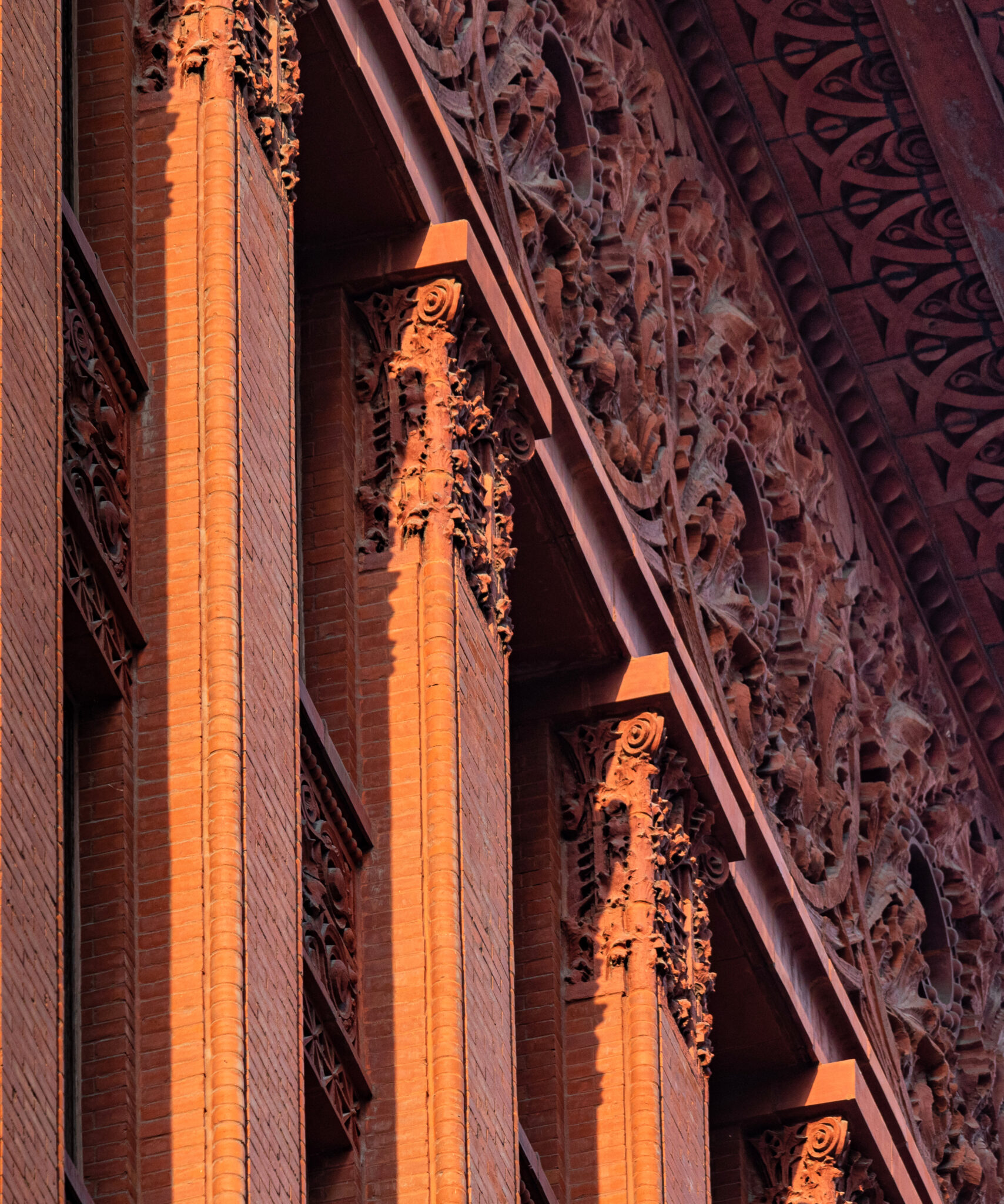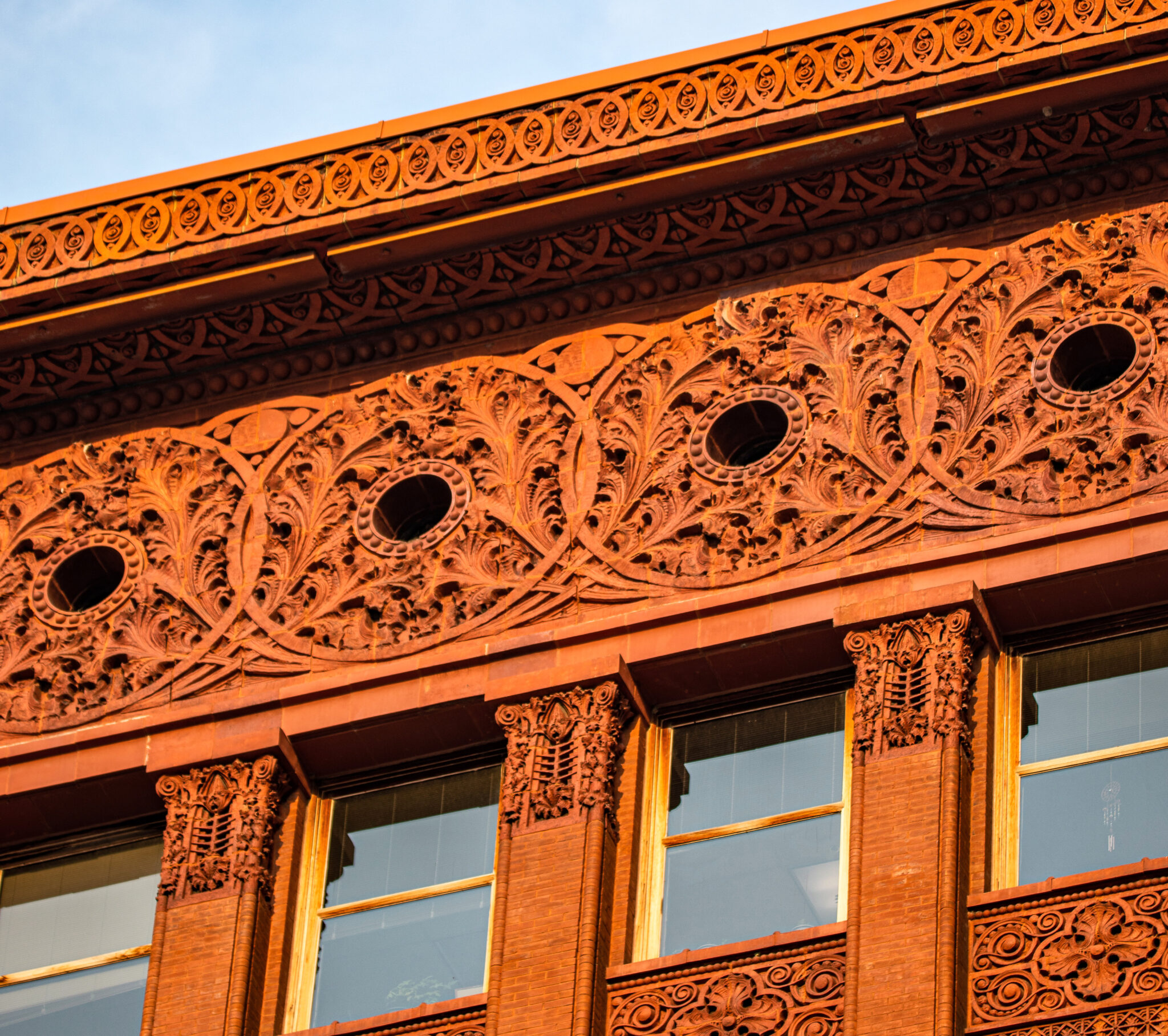 sunset images of sullivan-designed carved sandstone, red slip terra cotta spandrel panels, capitals, and cornice on wainwright building by adler and sullivan and c.k. ramsey (1891).