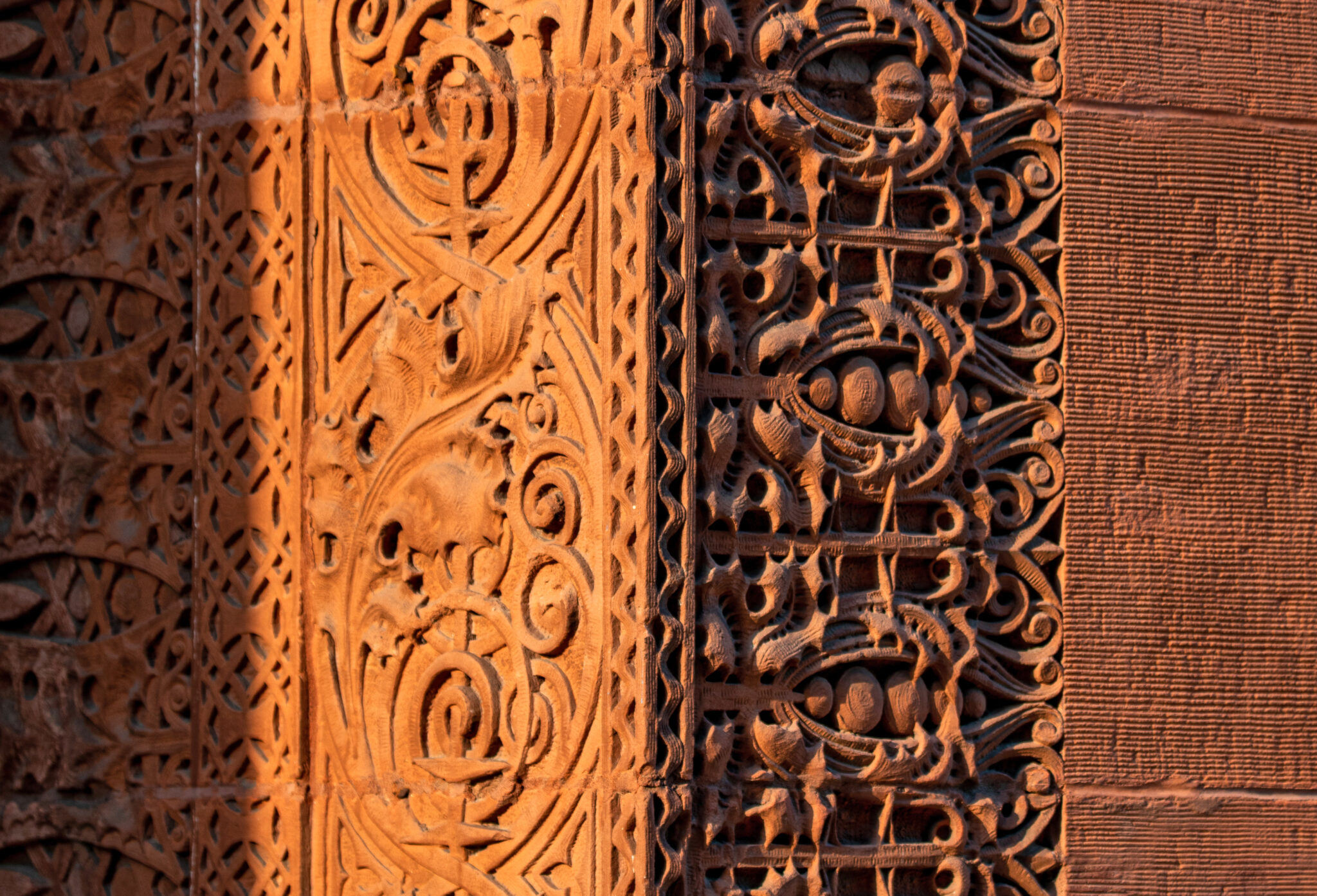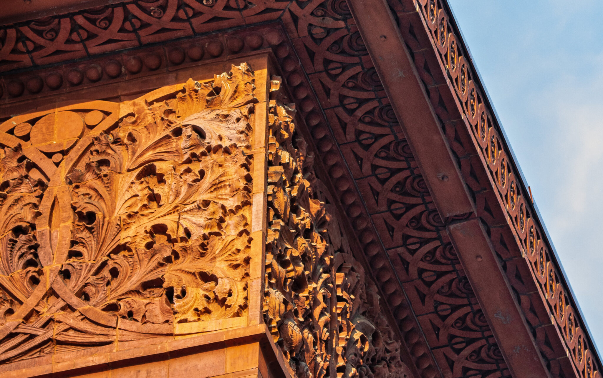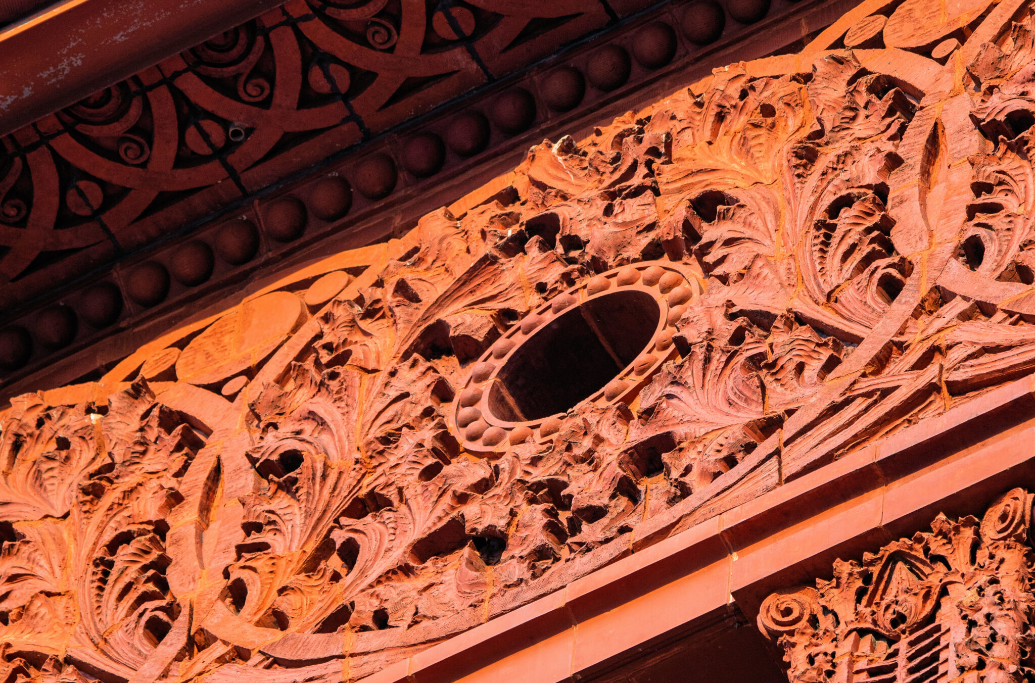 sunset images of sullivan-designed carved sandstone, red slip terra cotta spandrel panels, capitals, and cornice on wainwright building by adler and sullivan and c.k. ramsey (1891).