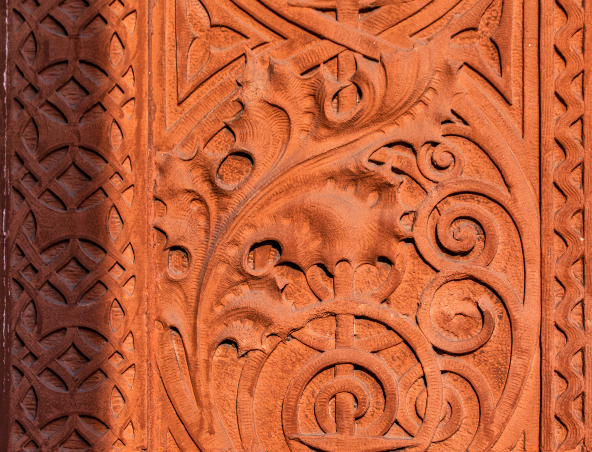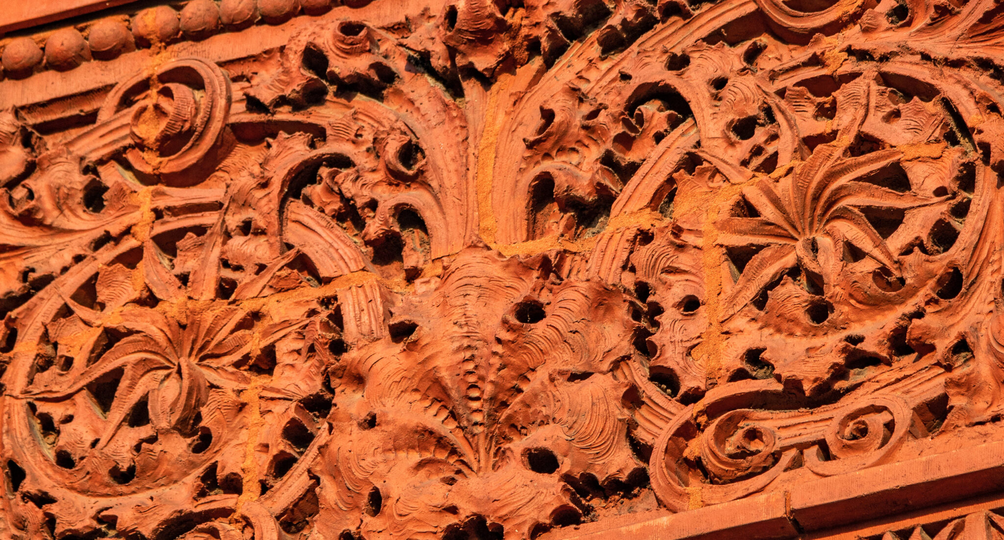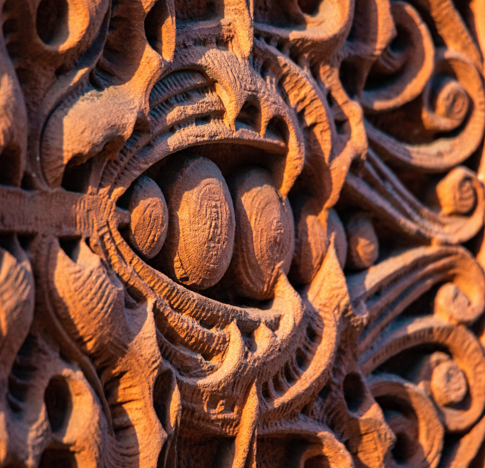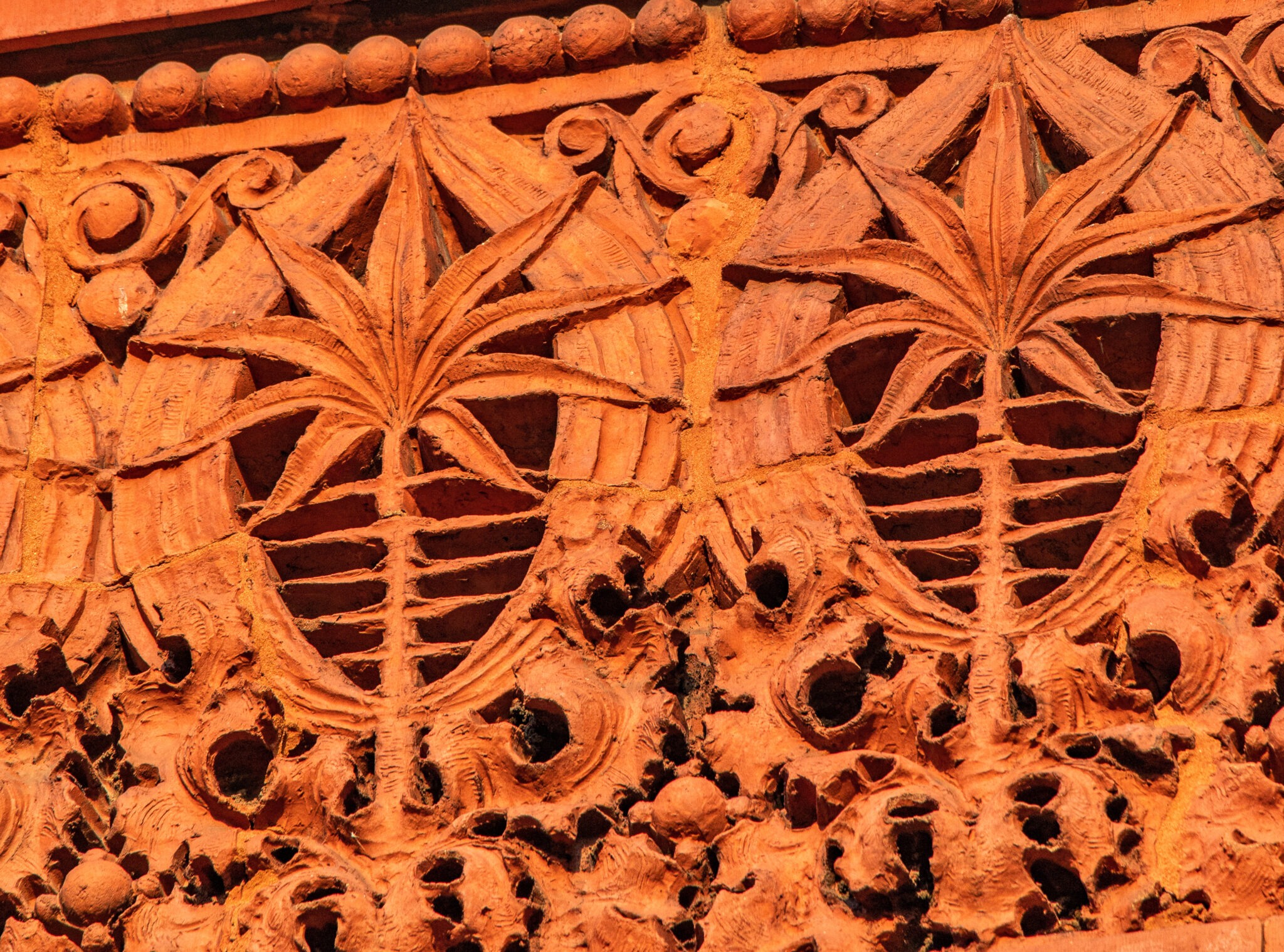 sunset images of sullivan-designed carved sandstone, red slip terra cotta spandrel panels, capitals, and cornice on wainwright building by adler and sullivan and c.k. ramsey (1891).